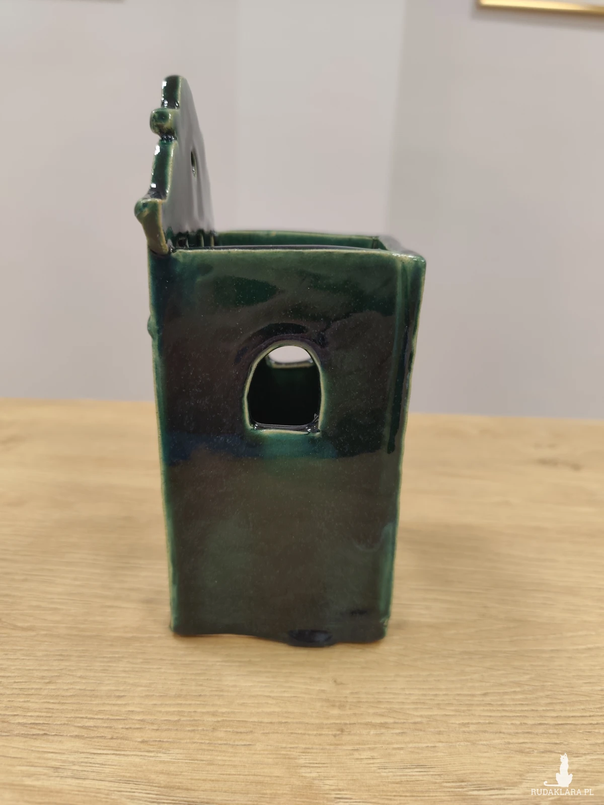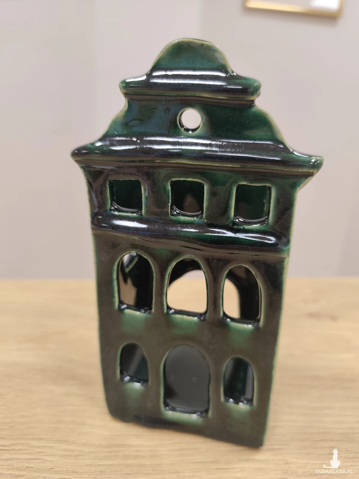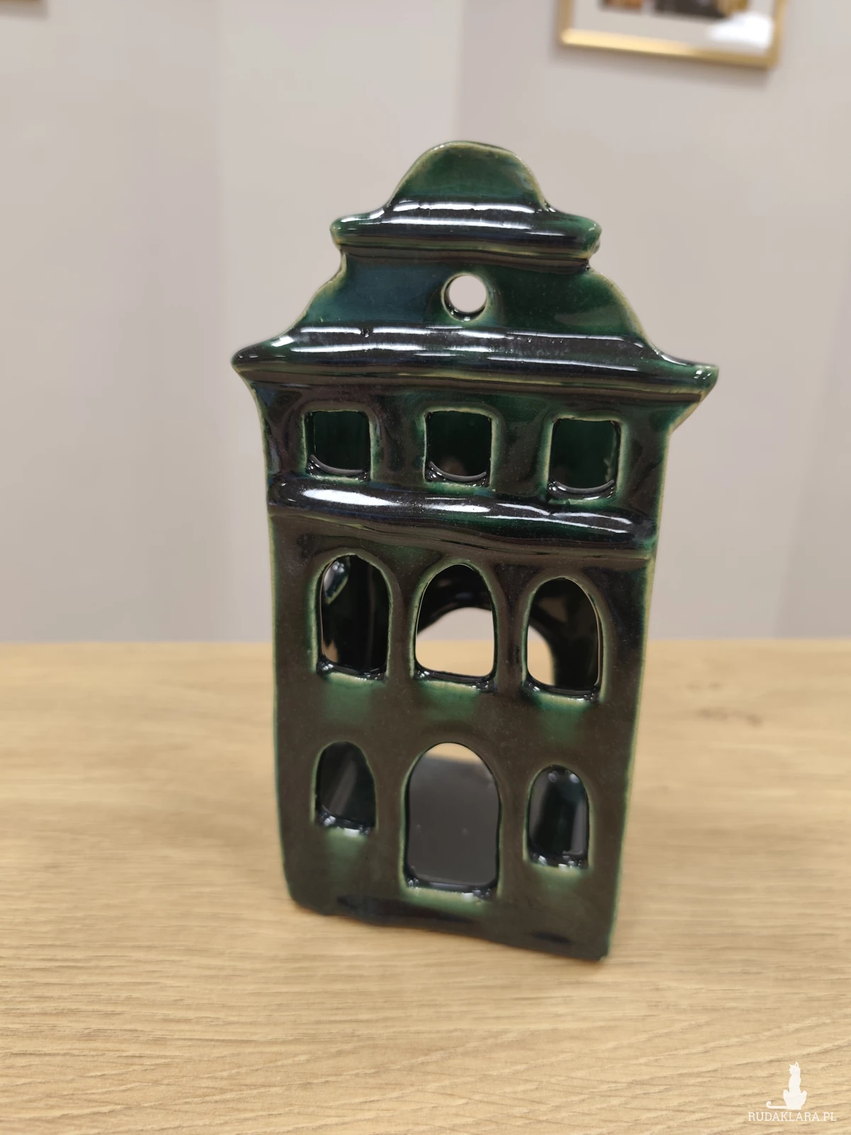 Ręcznie wykonana kamieniczka ceramiczna - lampion, szkliwiona i dwukrotnie wypalana w piecu ceramicznym na wysoką temperaturę. W pięknych barwach. Wysokość 18 cm.
