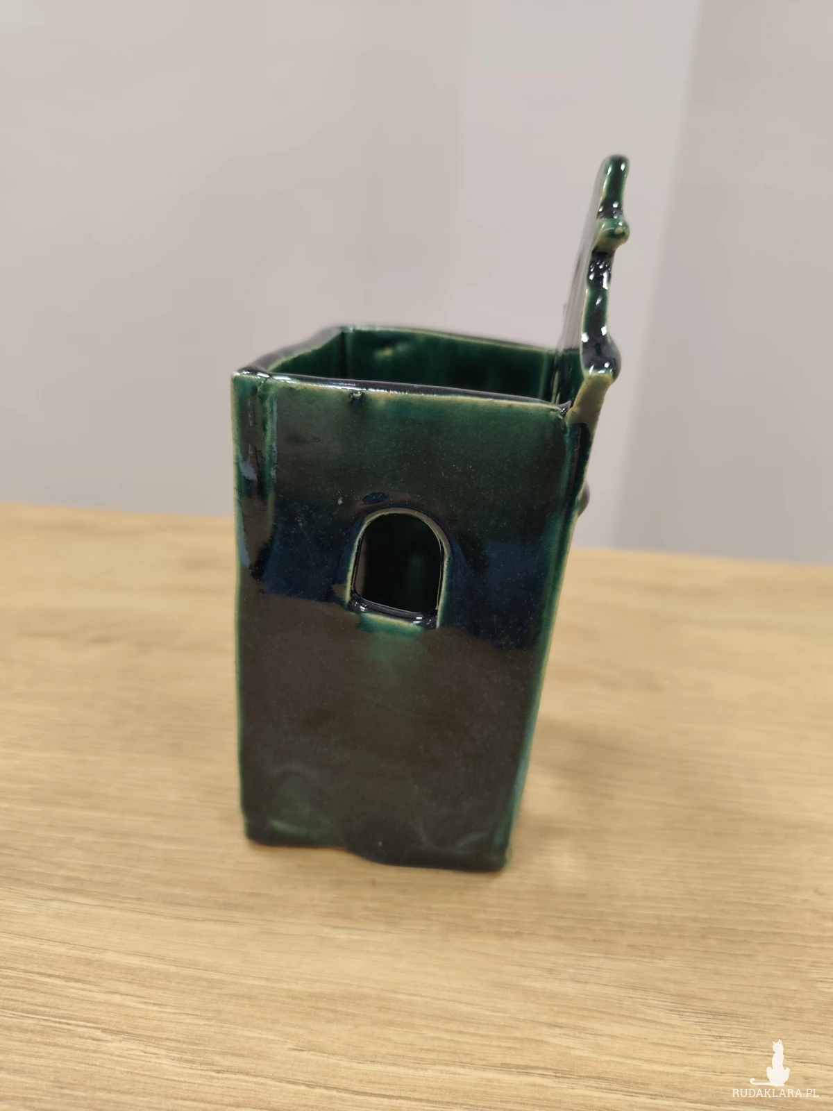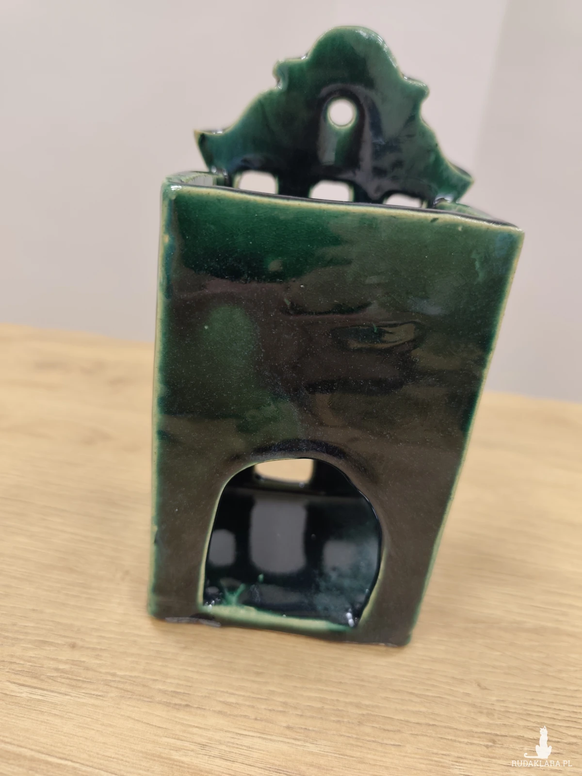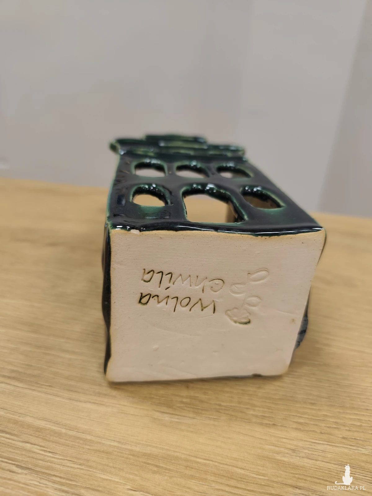 Ręcznie wykonana kamieniczka ceramiczna - lampion, szkliwiona i dwukrotnie wypalana w piecu ceramicznym na wysoką temperaturę. W pięknych barwach. Wysokość 18 cm.