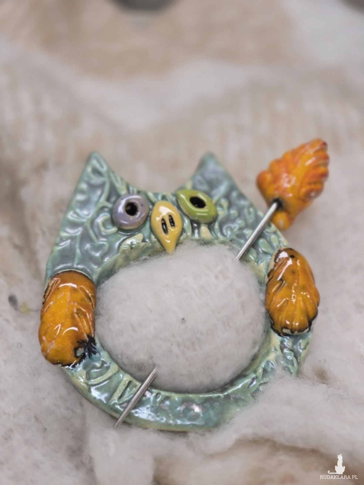 Zzielona sowa z rudym piórkiem, to urocza zapinka do szala, swetra, stylowej czapki. Sowa wykonana ręcznie w jednym egzemplarzu z gliny, szkliwiona i wypalana dwukrotnie w temperaturze 1100 stopni. Średnica około 5cm, zapinka zapinana szpilką z ceramicznym piórkiem. Brosza to piękny, oryginalny prezent dla osoby lubiącej niepowtarzalną biżuterię.