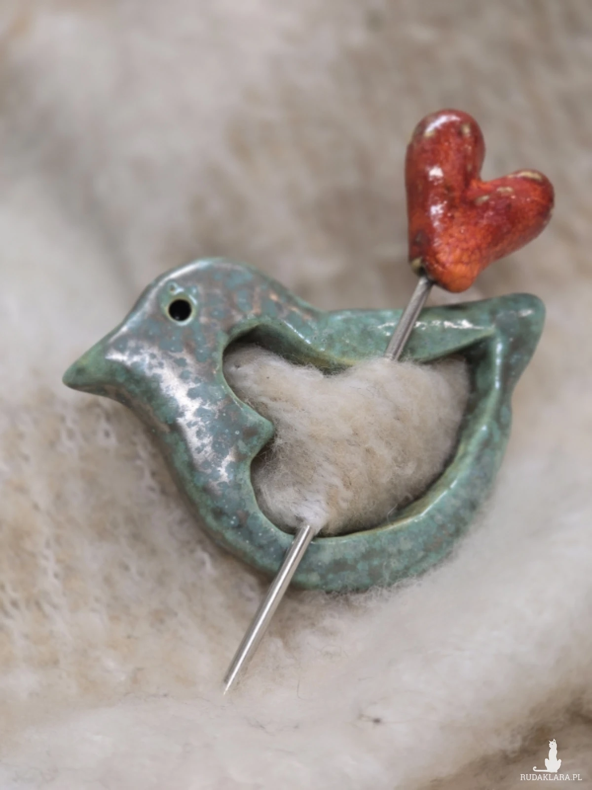 Ptaszek z czerwonym serduszkiem to urocza zapinka do szala, swetra, stylowej czapki. Broszka wykonana ręcznie w jednym egzemplarzu z gliny, szkliwiona i wypalana dwukrotnie w temperaturze 1100 stopni. Średnica około 5cm, zapinka zapinana szpilką z ceramicznym serduszkiem. Brosza to piękny, oryginalny prezent dla osoby lubiącej niepowtarzalną biżuterię.