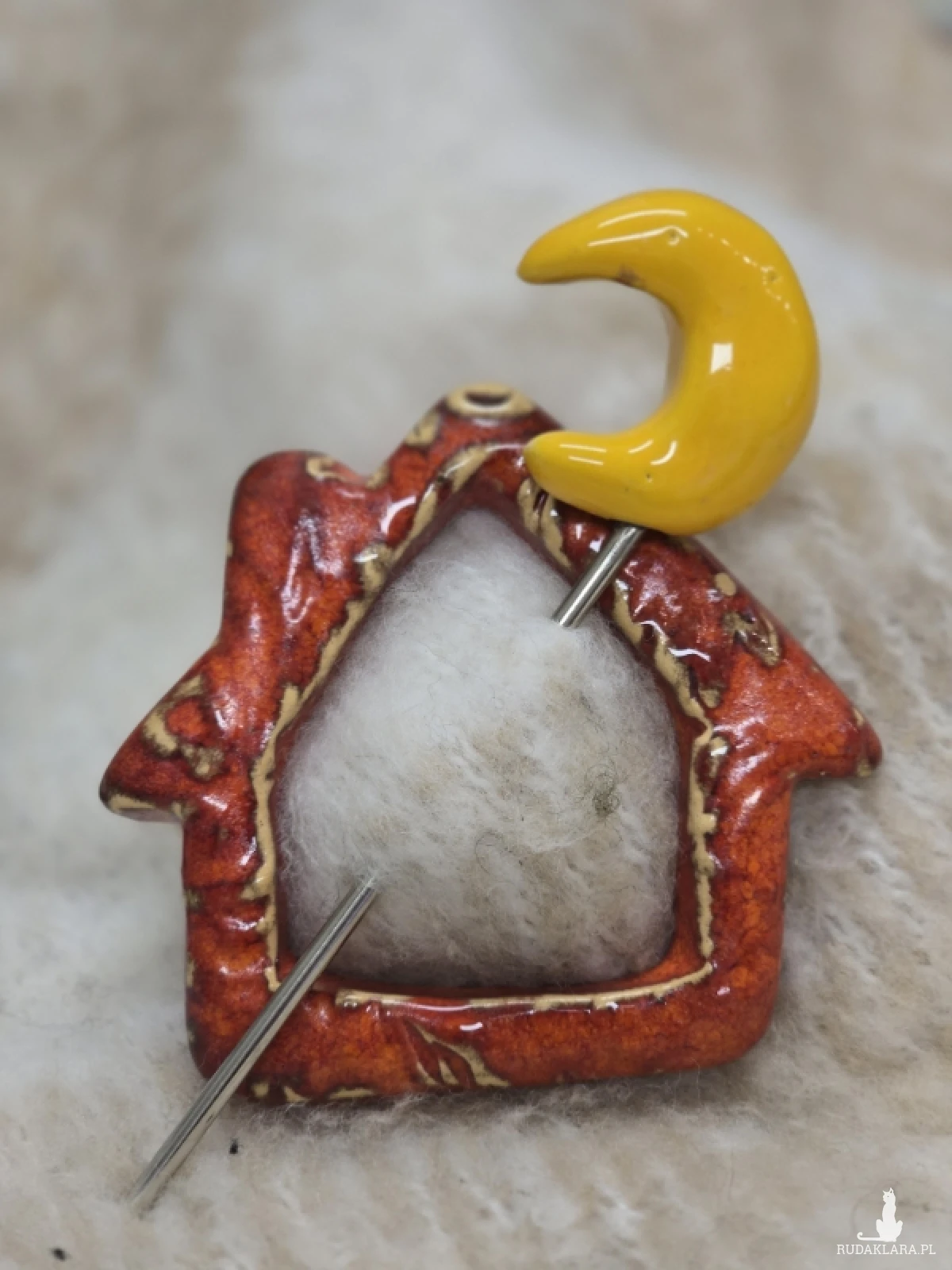 Czerwony domek z księżycem, to urocza zapinka do szala, swetra, stylowej czapki. Broszka wykonana ręcznie w jednym egzemplarzu z gliny, szkliwiona i wypalana dwukrotnie w temperaturze 1100 stopni. Średnica około 5cm, zapinka zapinana szpilką z ceramicznym księżycem. Brosza to piękny, oryginalny prezent dla osoby lubiącej niepowtarzalną biżuterię.