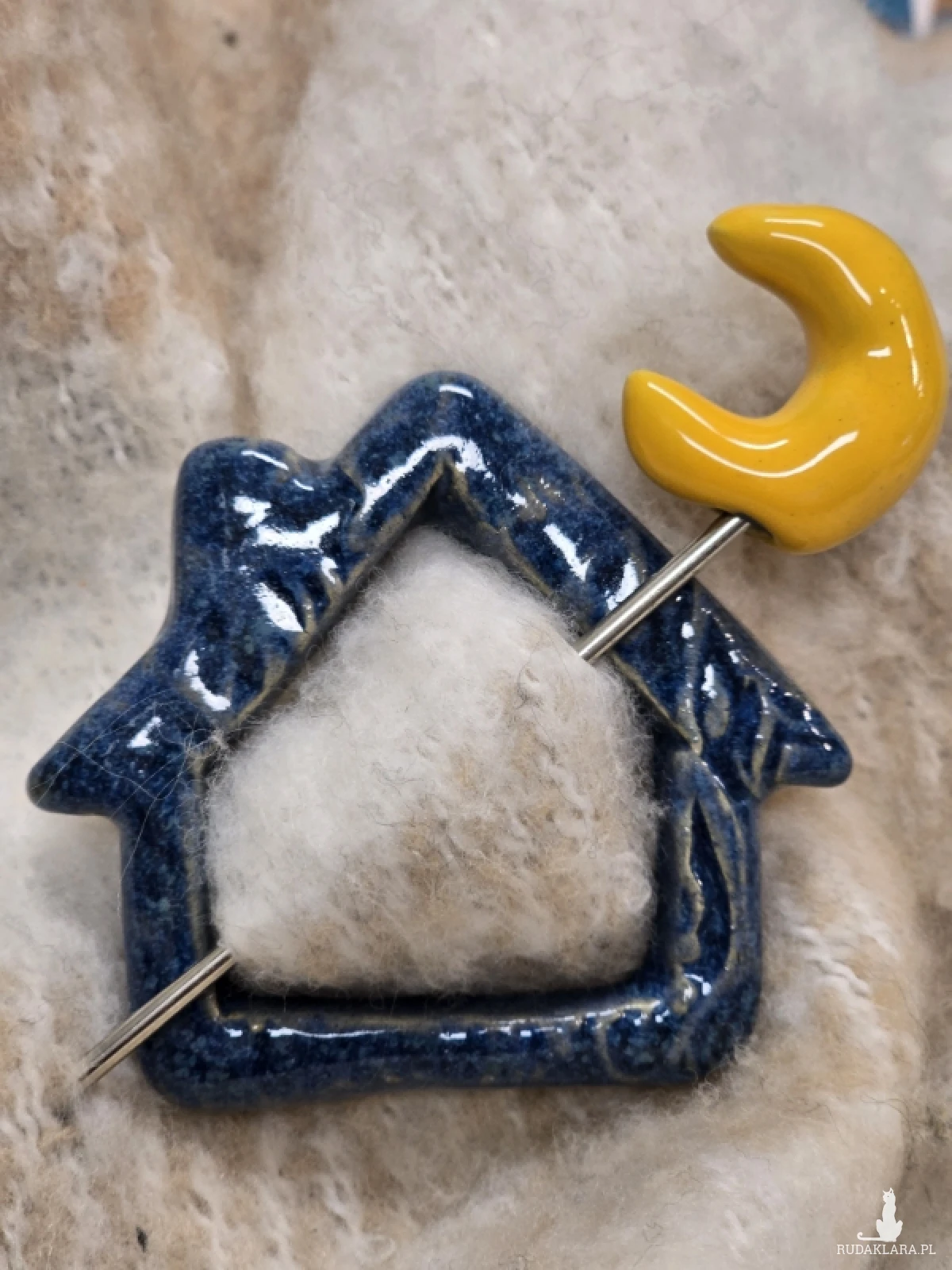 Granatowy domek z księżycem, to urocza zapinka do szala, swetra, stylowej czapki. Broszka wykonana ręcznie w jednym egzemplarzu z gliny, szkliwiona i wypalana dwukrotnie w temperaturze 1100 stopni. Średnica około 5cm, zapinka zapinana szpilką z ceramicznym księżycem. Brosza to piękny, oryginalny prezent dla osoby lubiącej niepowtarzalną biżuterię.