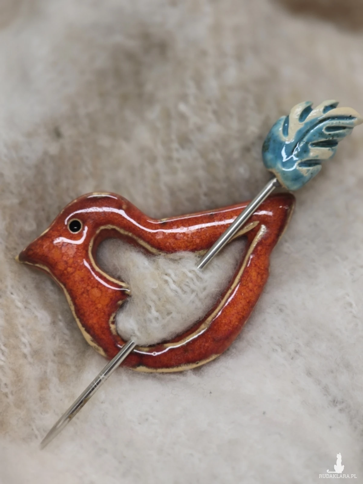 Ptaszek z zielonym piórkiem to urocza zapinka do szala, swetra, stylowej czapki. Broszka wykonana ręcznie w jednym egzemplarzu z gliny, szkliwiona i wypalana dwukrotnie w temperaturze 1100 stopni. Średnica około 5cm, zapinka zapinana szpilką z ceramicznym piórkiem. Brosza to piękny, oryginalny prezent dla osoby lubiącej niepowtarzalną biżuterię.
