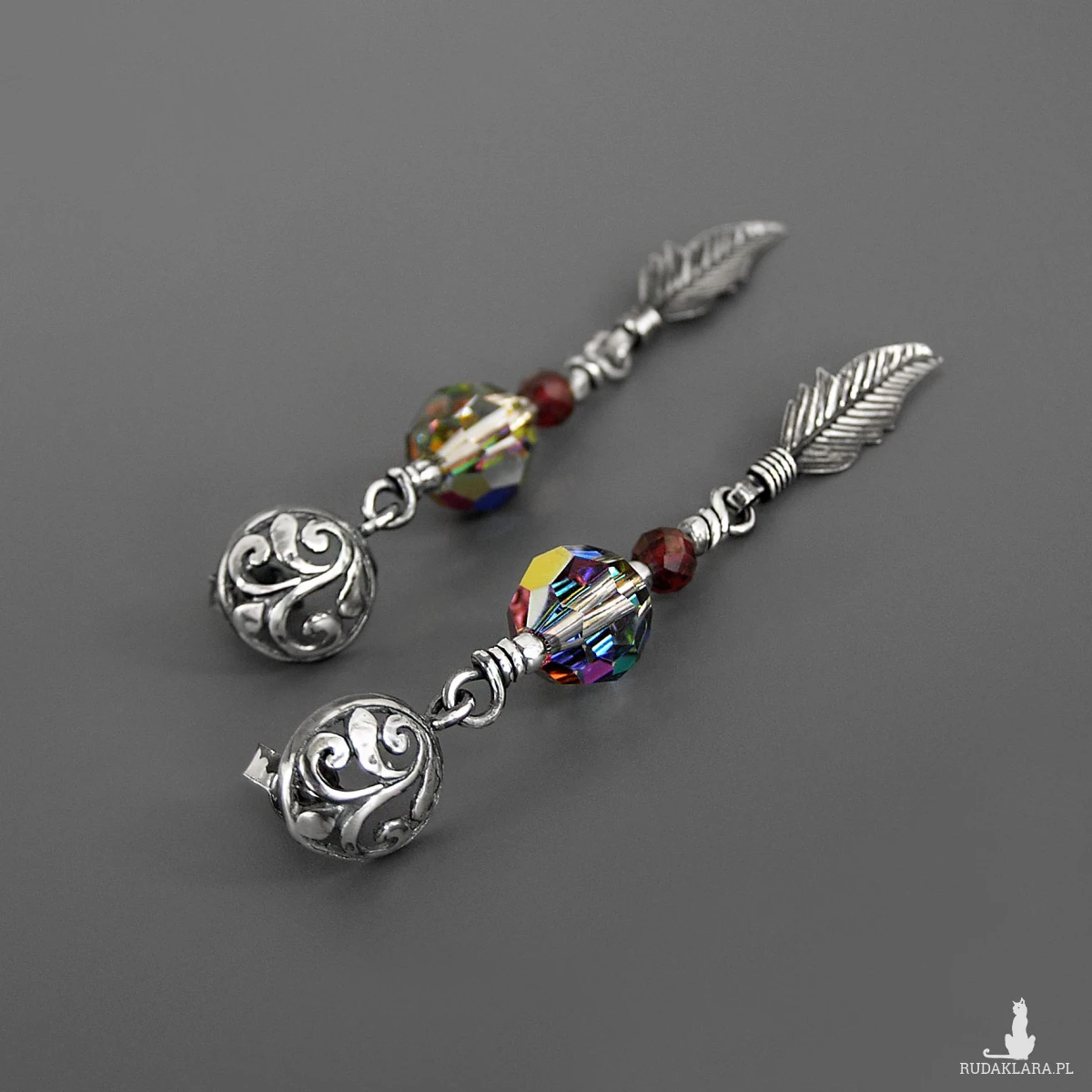 Kolczyki retro z fasetowanymi kulkami granatu o średnicy 4 mm i kolorowymi kryształkami o średnicy 8 mm.