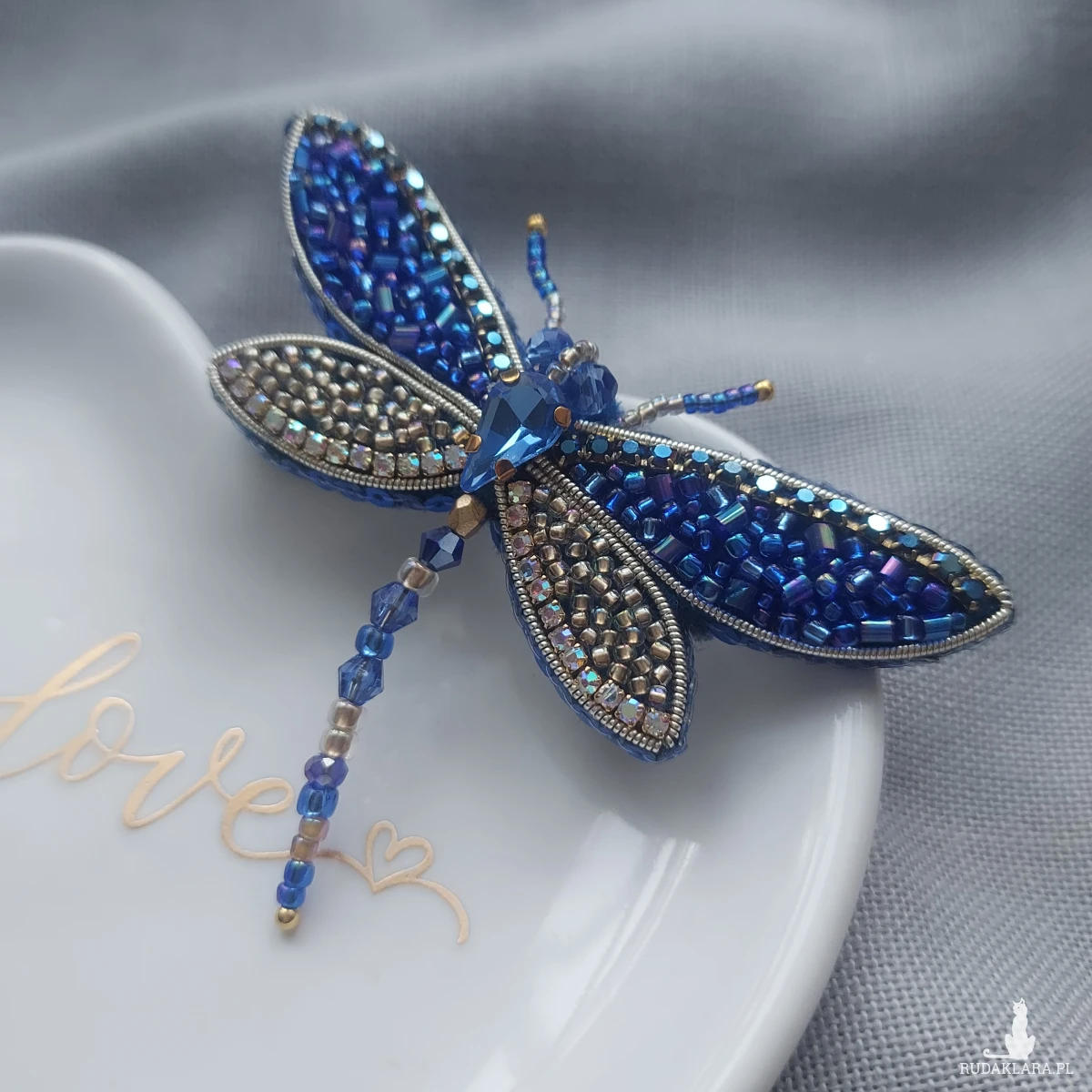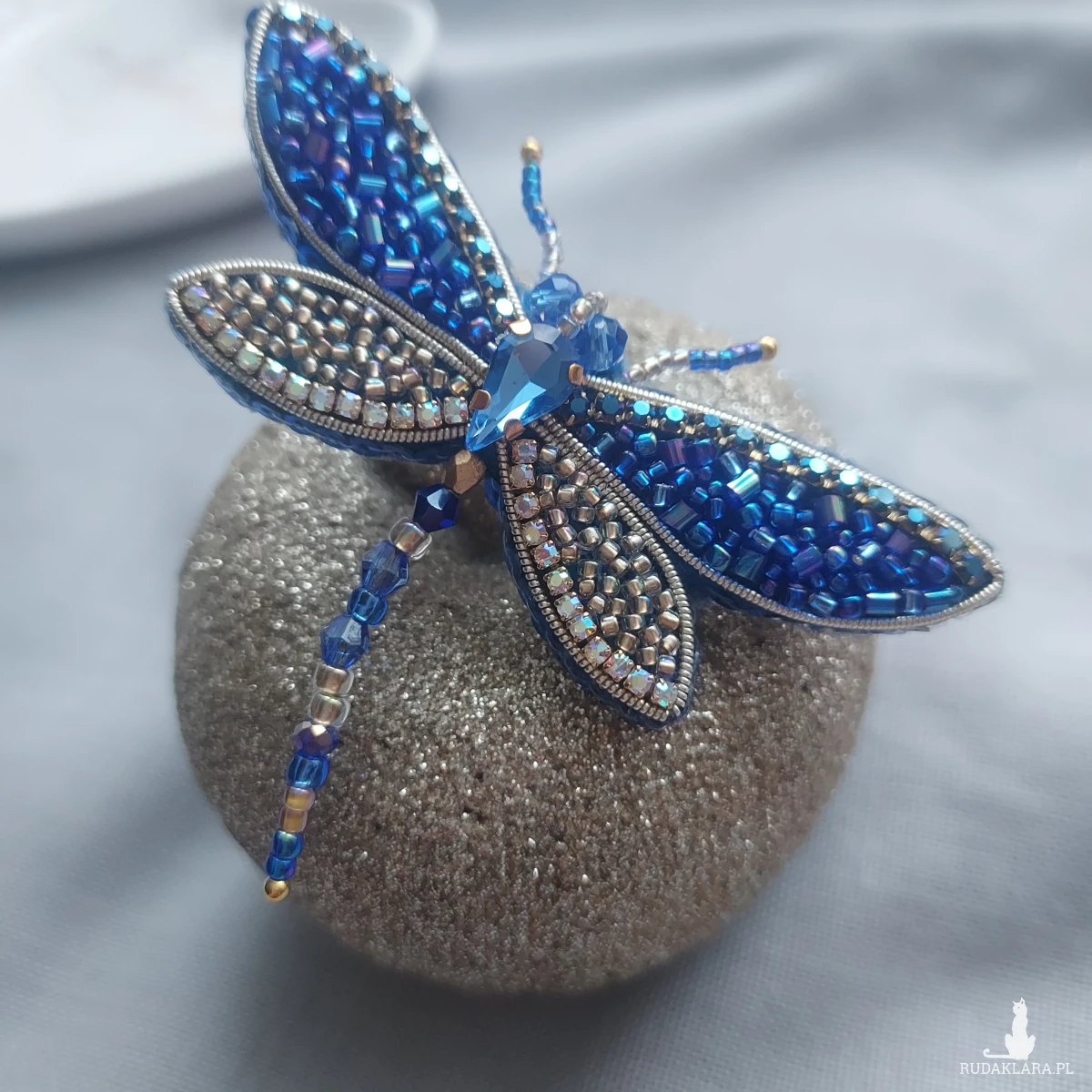 Broszka ważka w kolorze kobaltowo-szampańskim - wiosenno-letnie szaleństwo piękna oraz delikatności. Broszka powstała haftem koralikowym z dbałością o każdy szczegół.