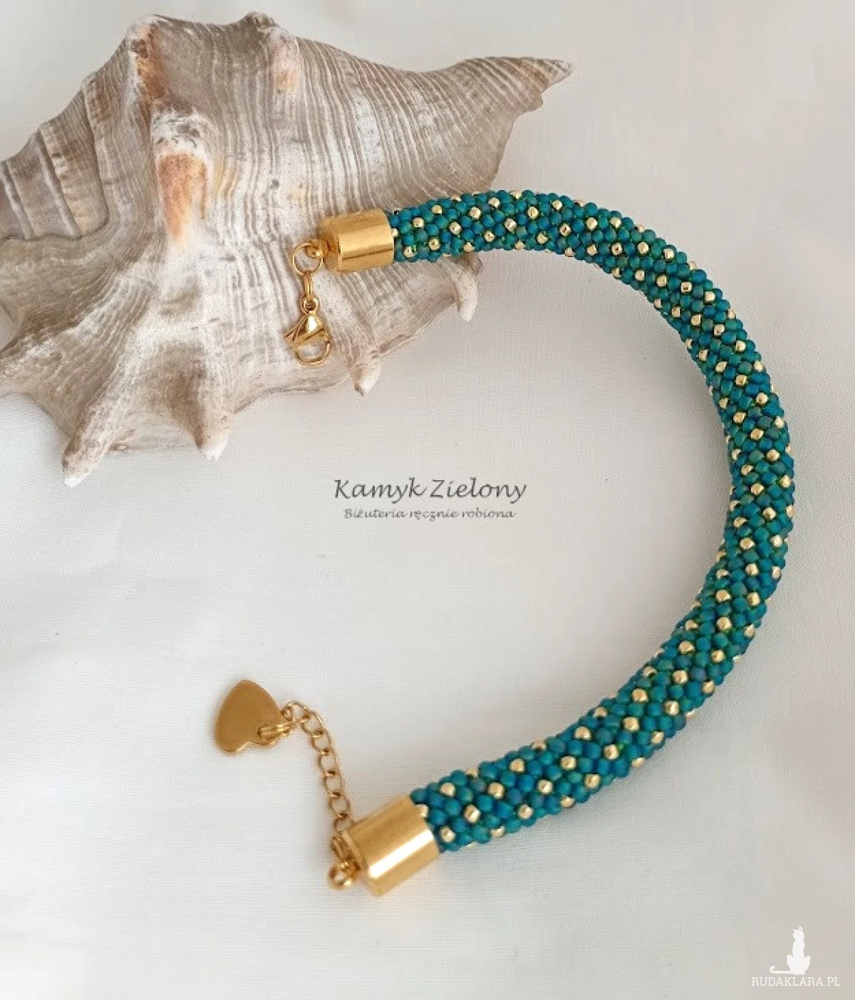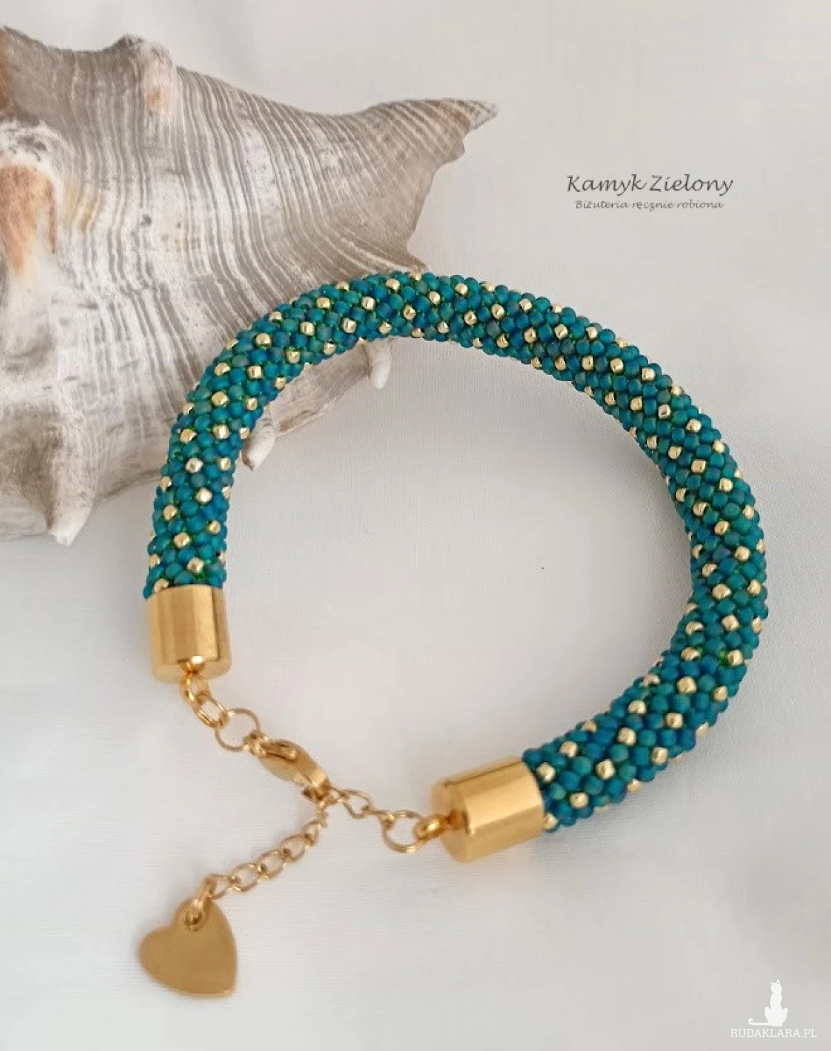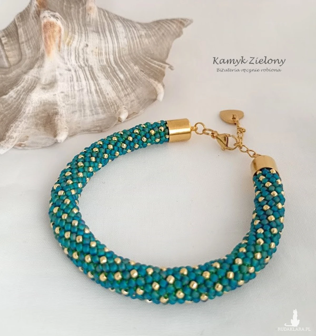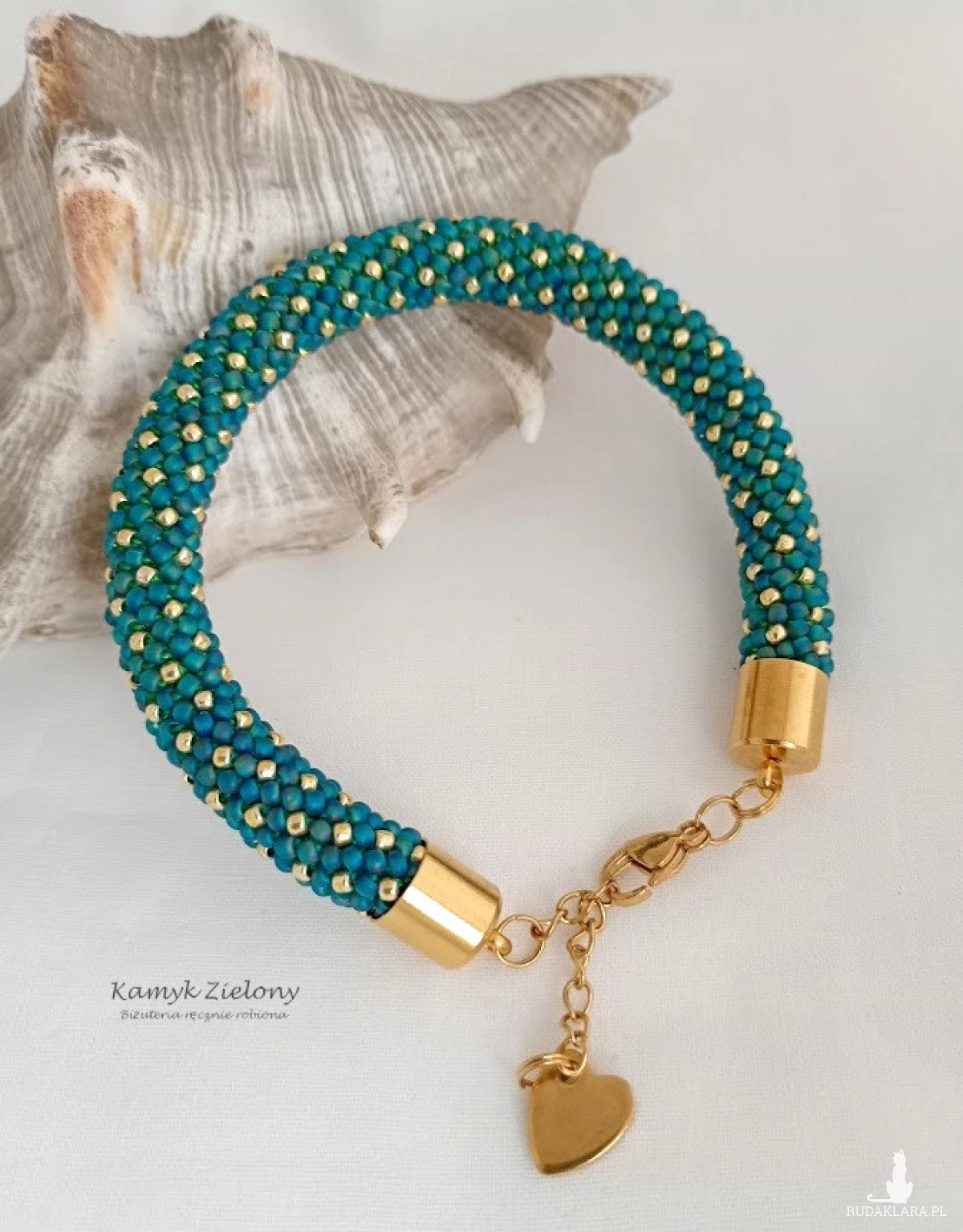 Bransoletka z wzorem w złote kropeczki wykonana ze szklanych koralików Toho w kolorze szmaragdowym i złotym.