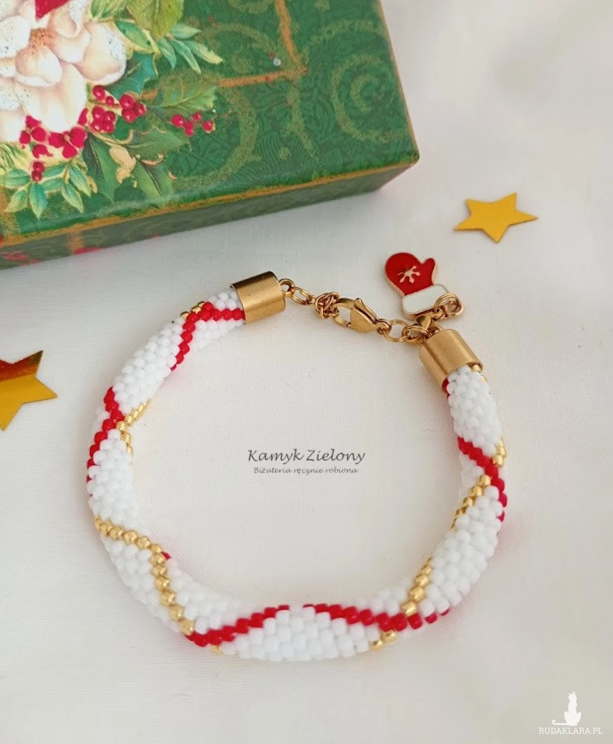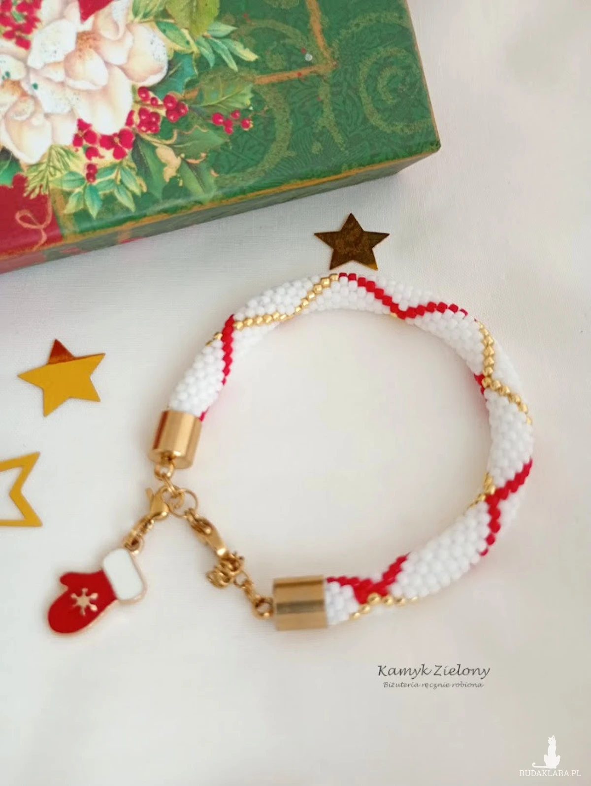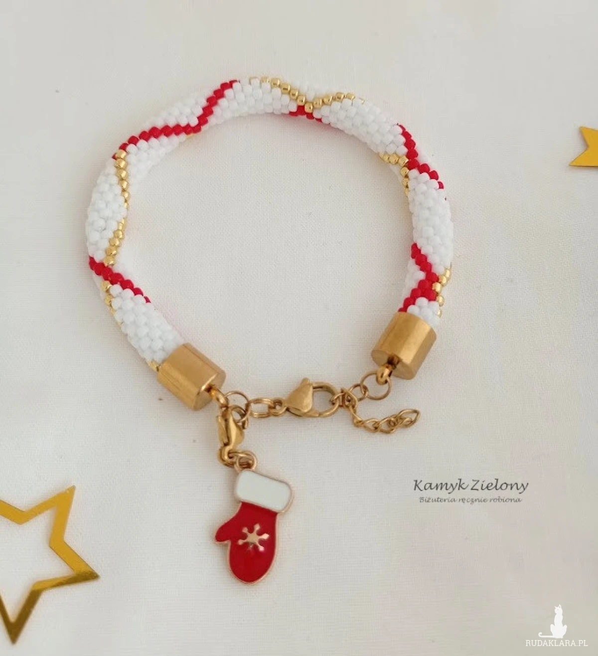 Dodatkową ozdobą bransoletki jest przywieszka w postaci czerwono-białej rękawiczki, wykonana z emaliowanego metalu. Przywieszka jest dopinana malutkim karabińczykiem, w związku z czym po okresie świątecznym można ją zdjąć :) Można ją dopiąć również na końcu łańcuszka regulującego.