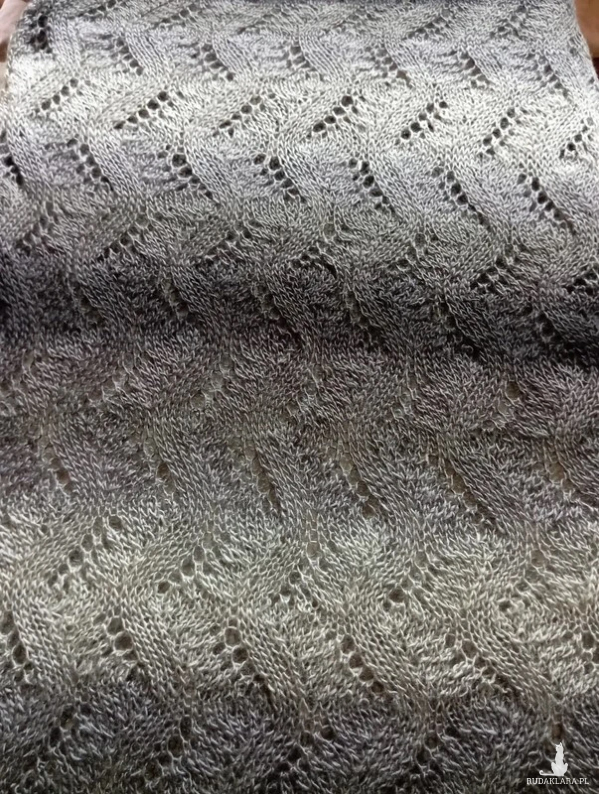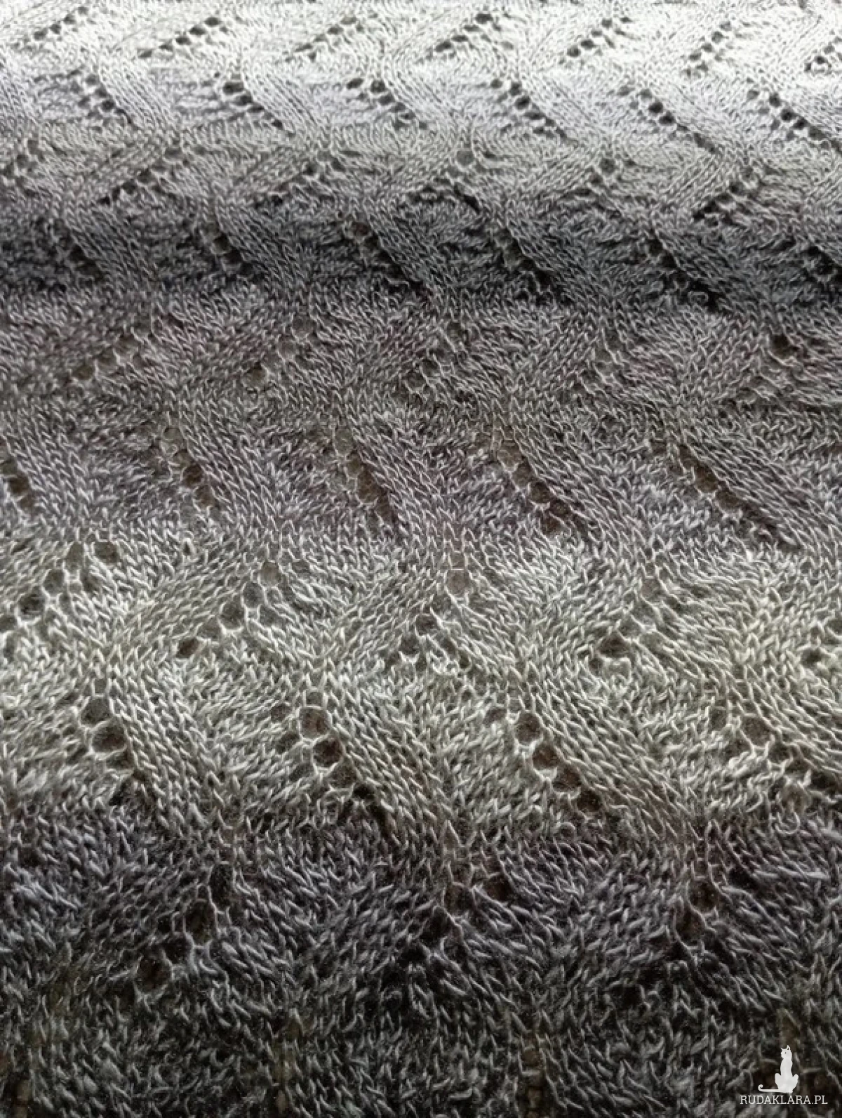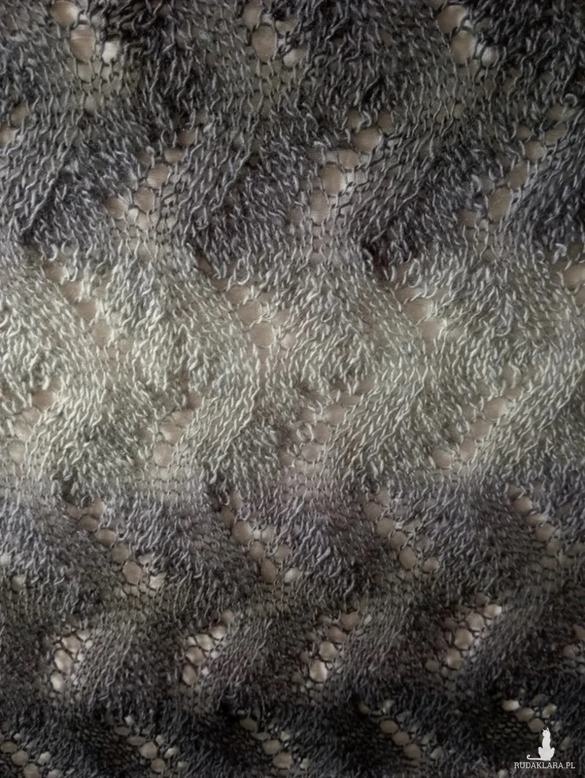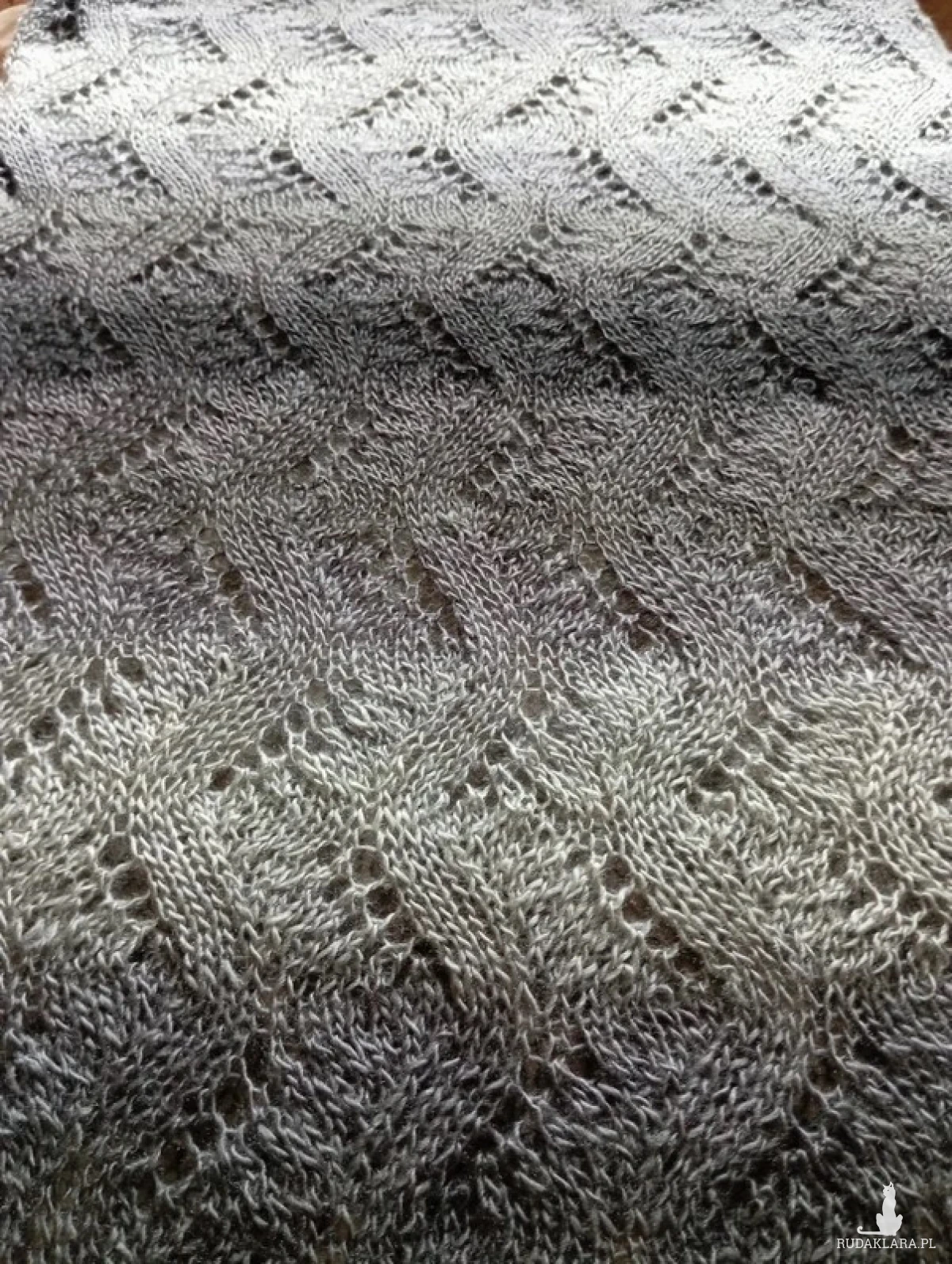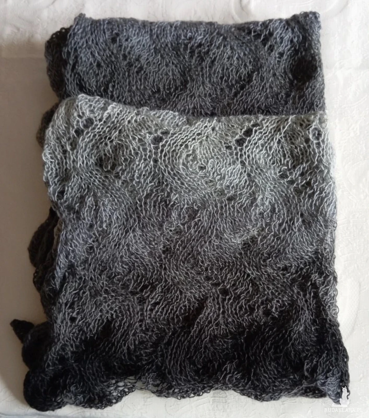 Ażurowy cieniowany szal robiony na drutach (odcienie szarego i czarnego), rękodzieło. Wymiary na płasko bez rozciągania: 70 cm x 206 cm. Szal zrobiony z mięciutkiej, ciepłej niegryzącej włóczki, wełna z akrylem.