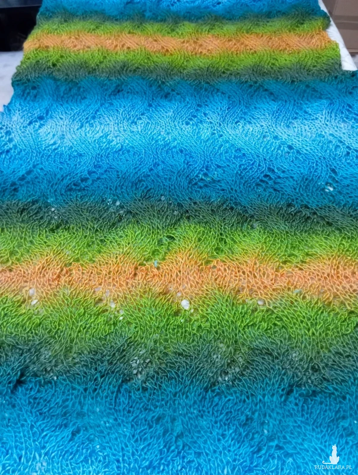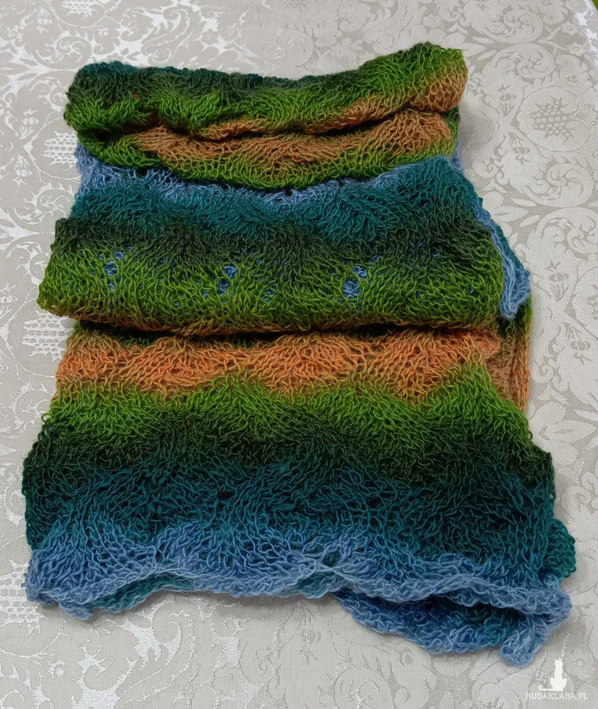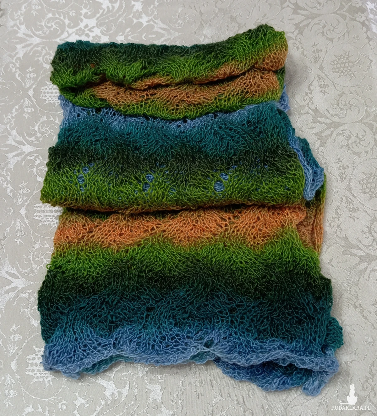 Ażurowy cieniowany szal robiony na drutach (odcienie niebieskiego i zielonego), rękodzieło. Wymiary na płasko bez rozciągania: 70 cm x 170 cm. Szal zrobiony z mięciutkiej, ciepłej niegryzącej włóczki, wełna z akrylem