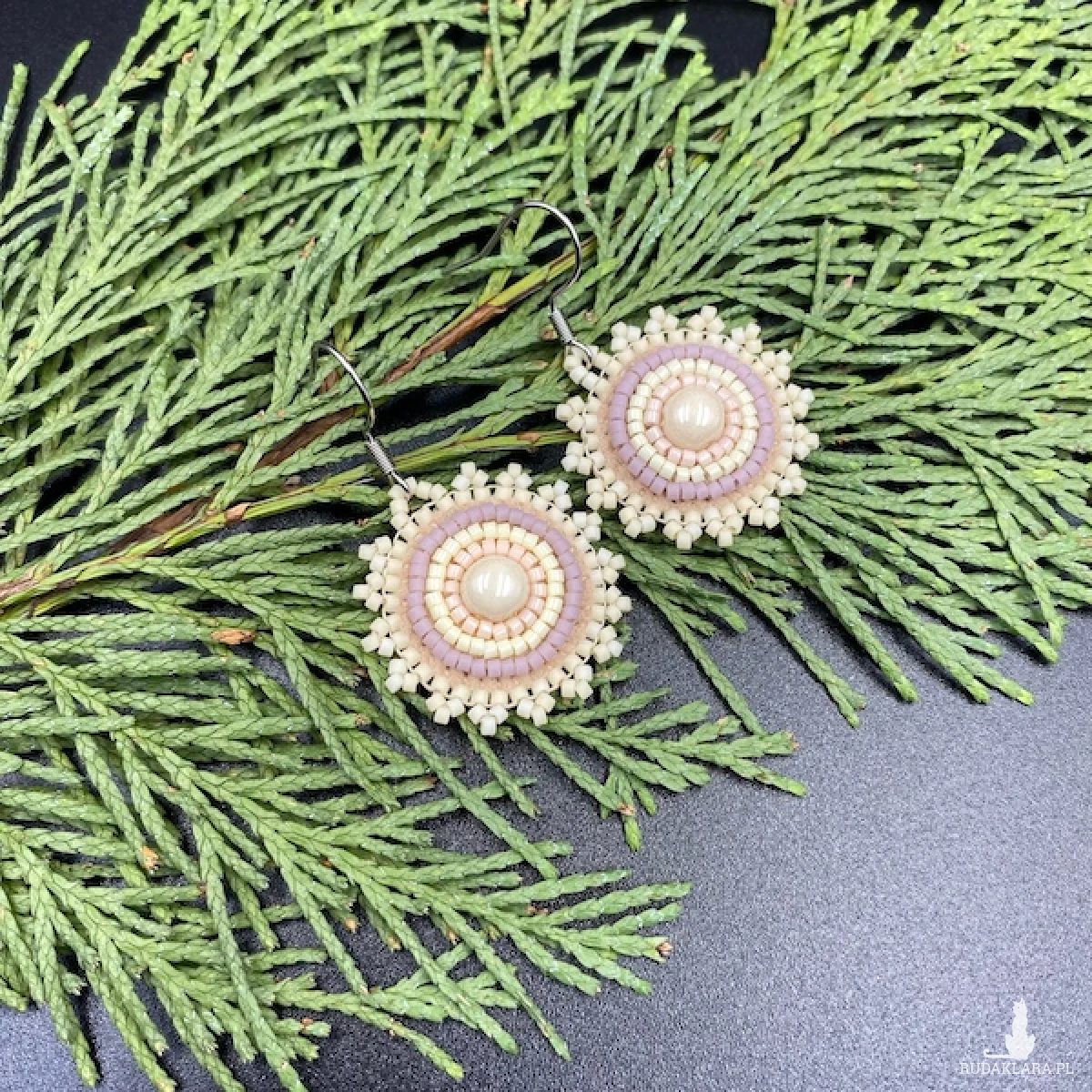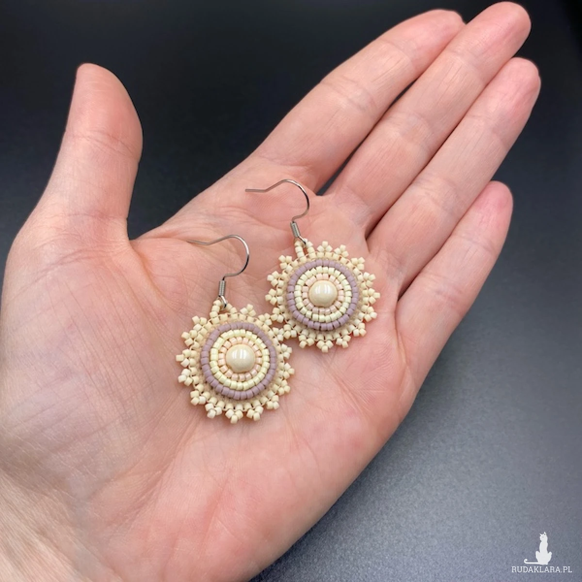Okrągłe, małe kolczyki wykonane zostały techniką haftu koralikowego z drobnych koralików Miyuki, w 100% wyszyte ręcznie. Spód kolczyków podszyty jest kremową eko skórką. Bigle otwarte ze stali chirurgicznej.