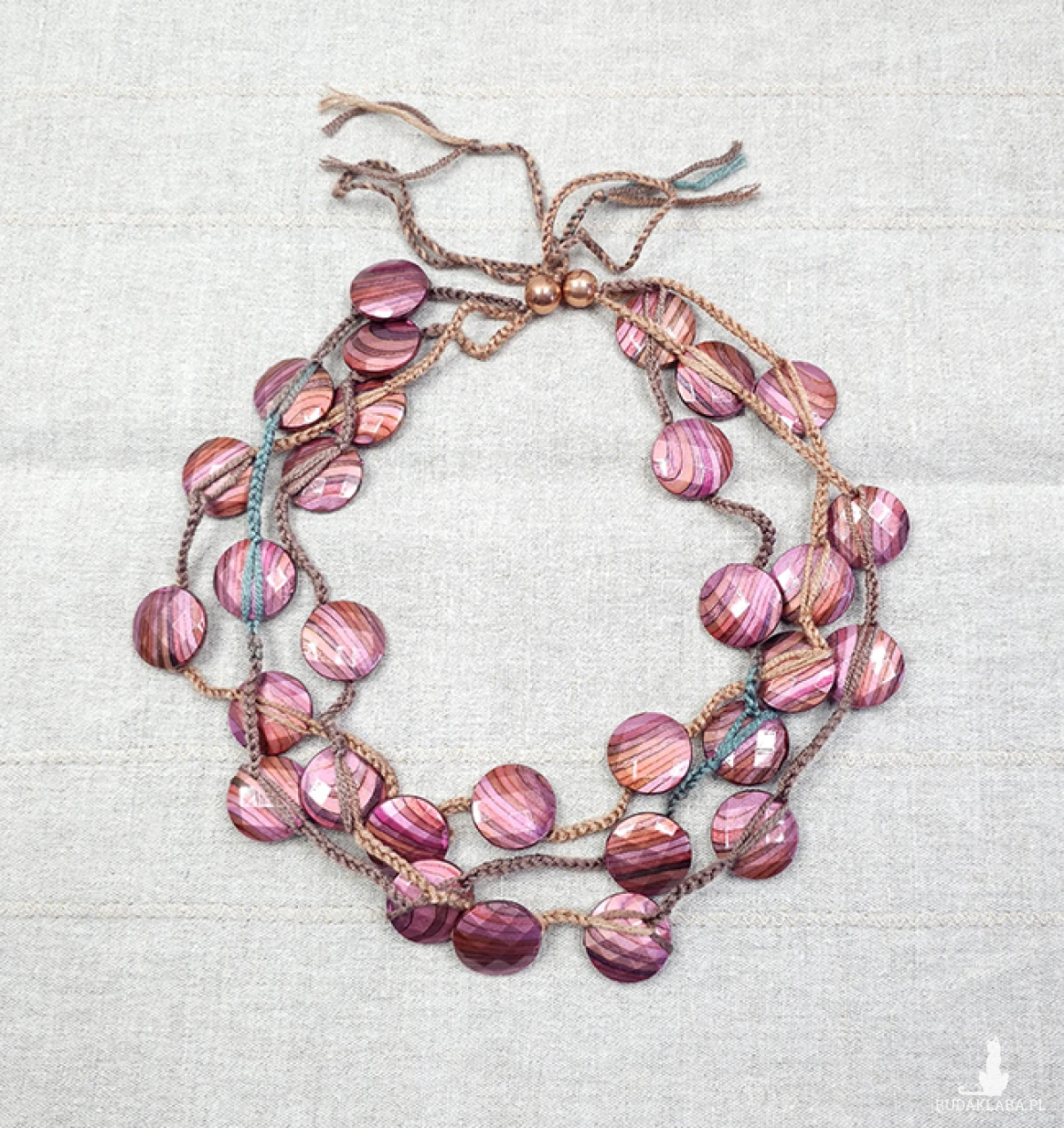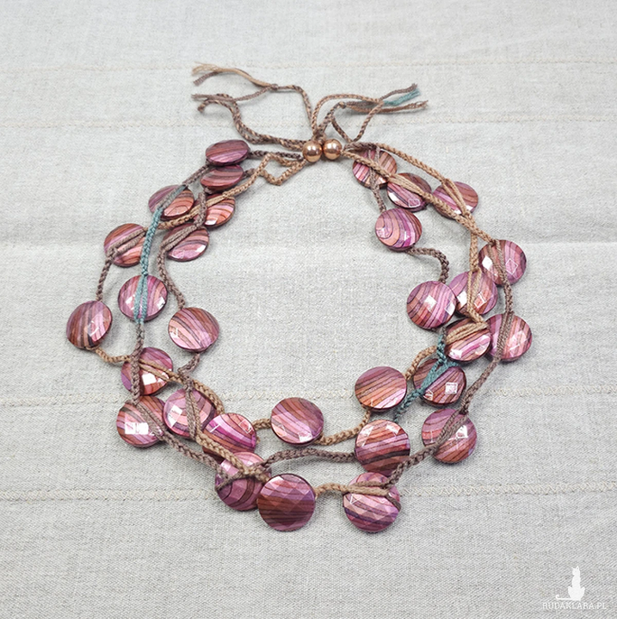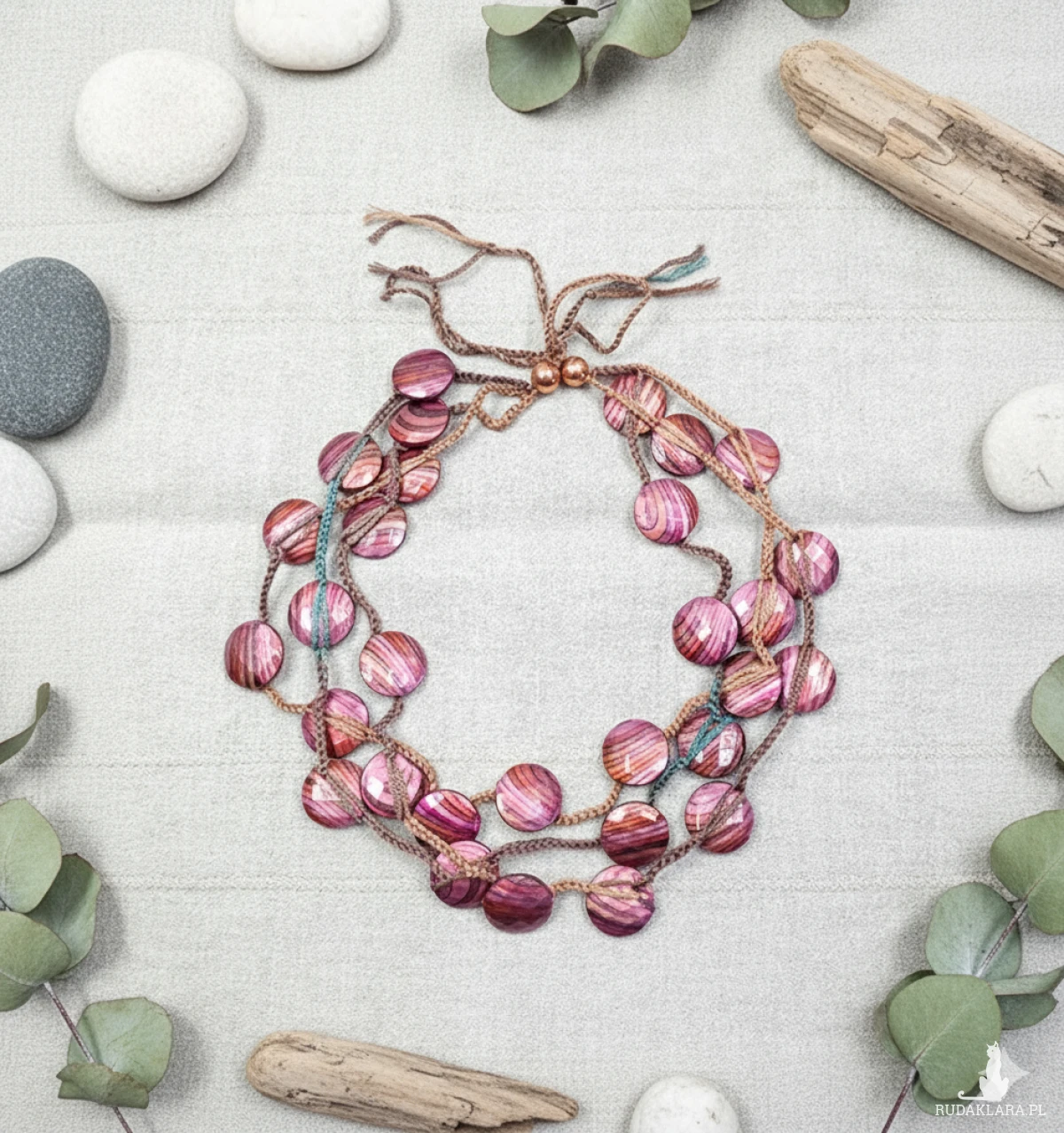 6178 Długi Naszyjnik Boho | Błyszczące Płytki Fiolet, Róż i Złoto | Ręczne Wiązanie