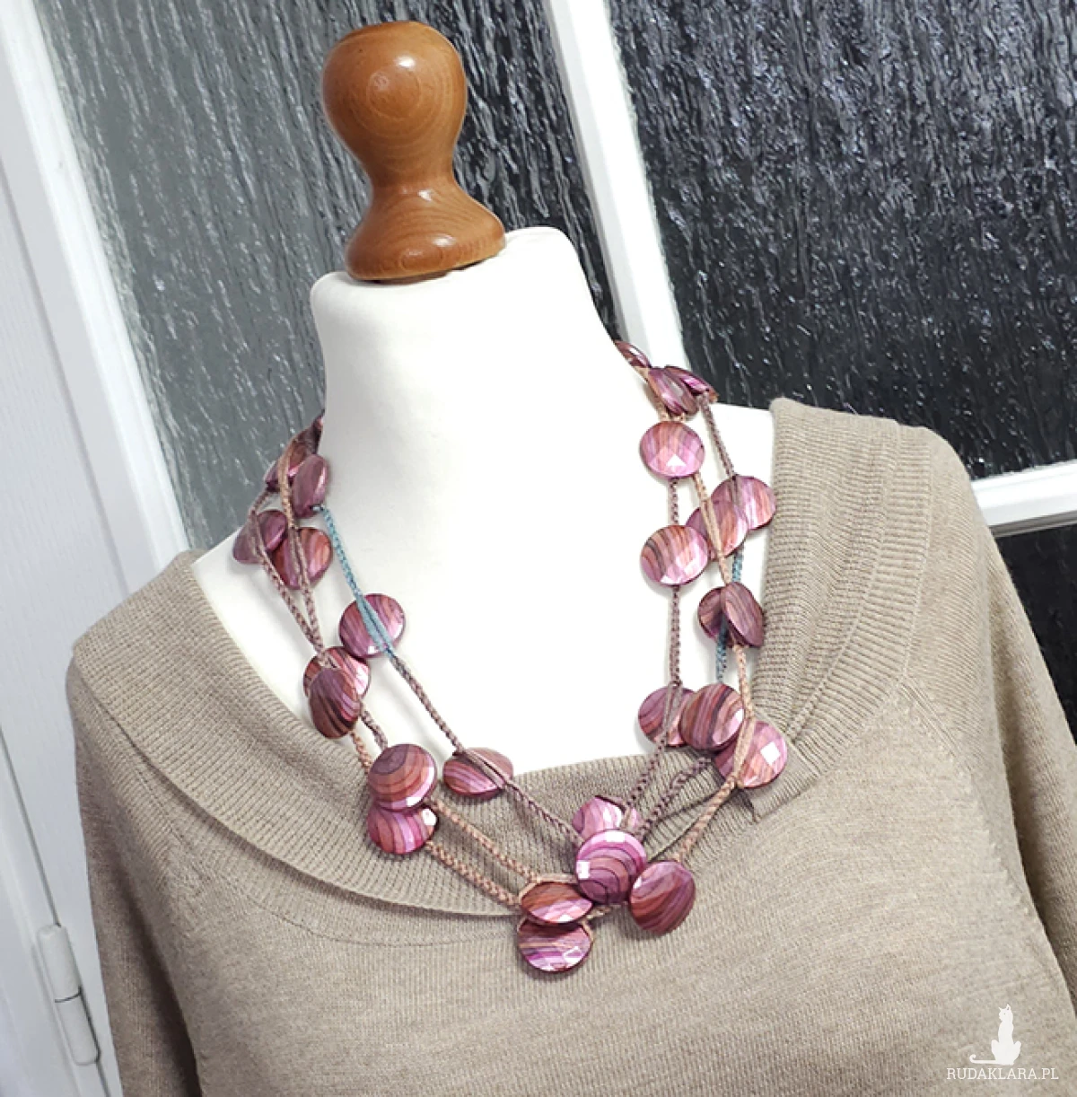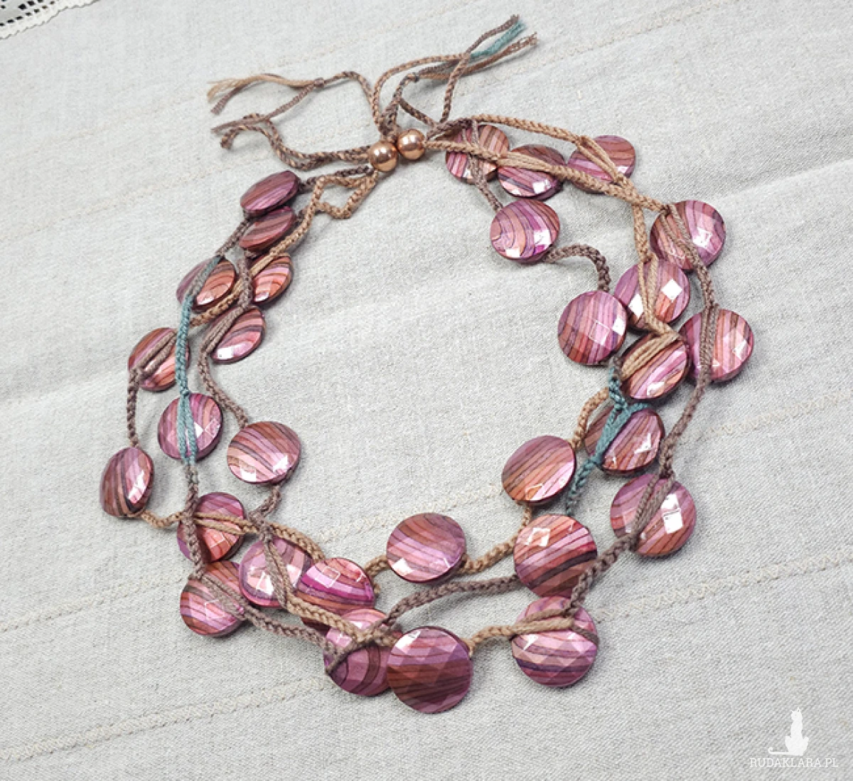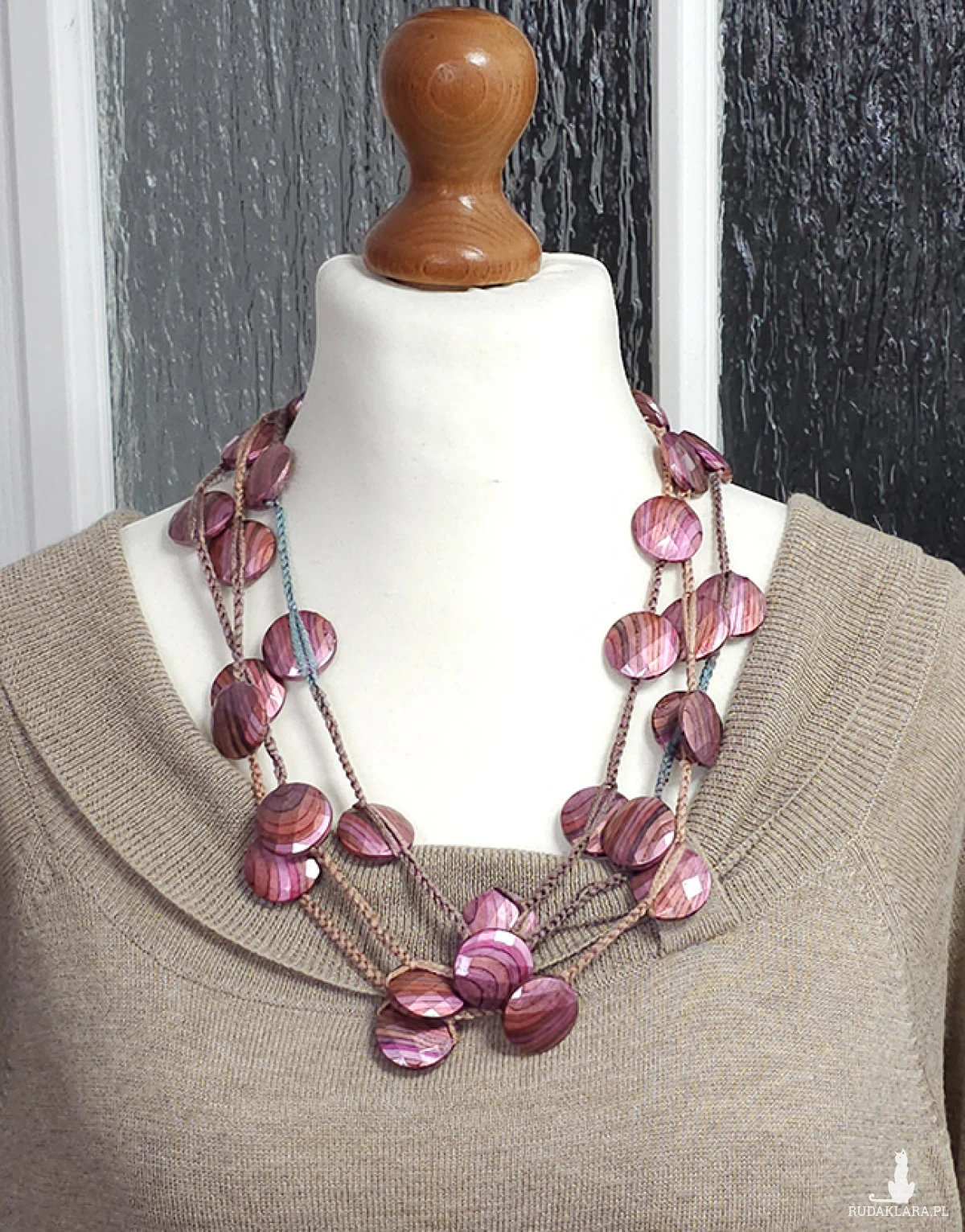 6178 Długi Naszyjnik Boho | Błyszczące Płytki Fiolet, Róż i Złoto | Ręczne Wiązanie