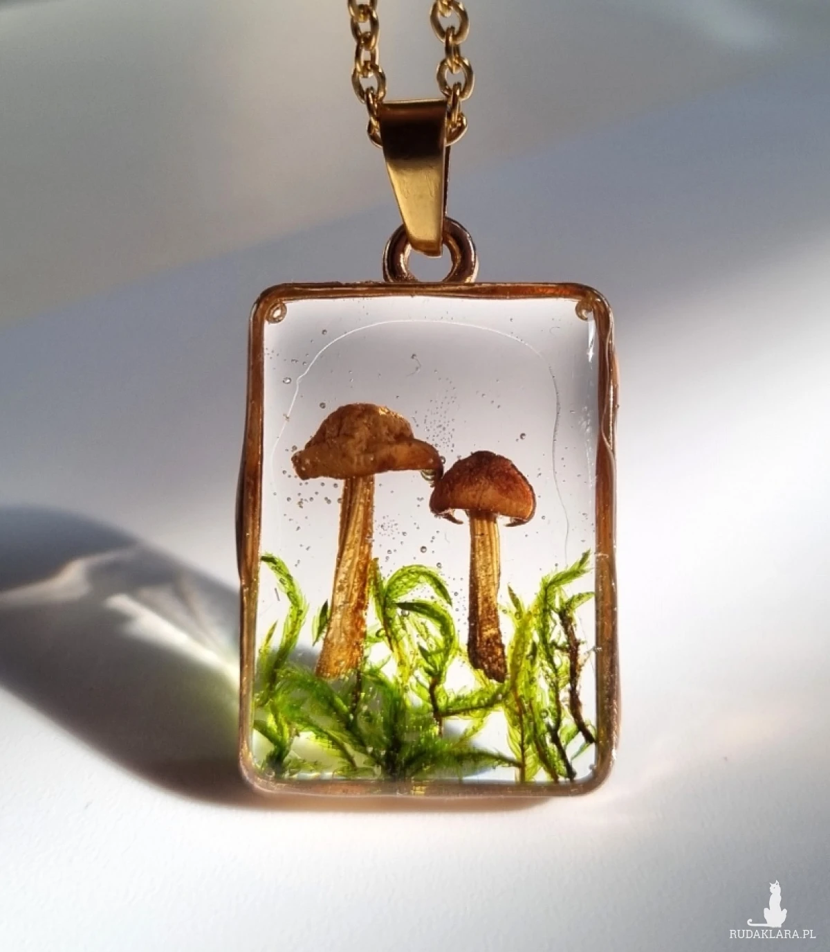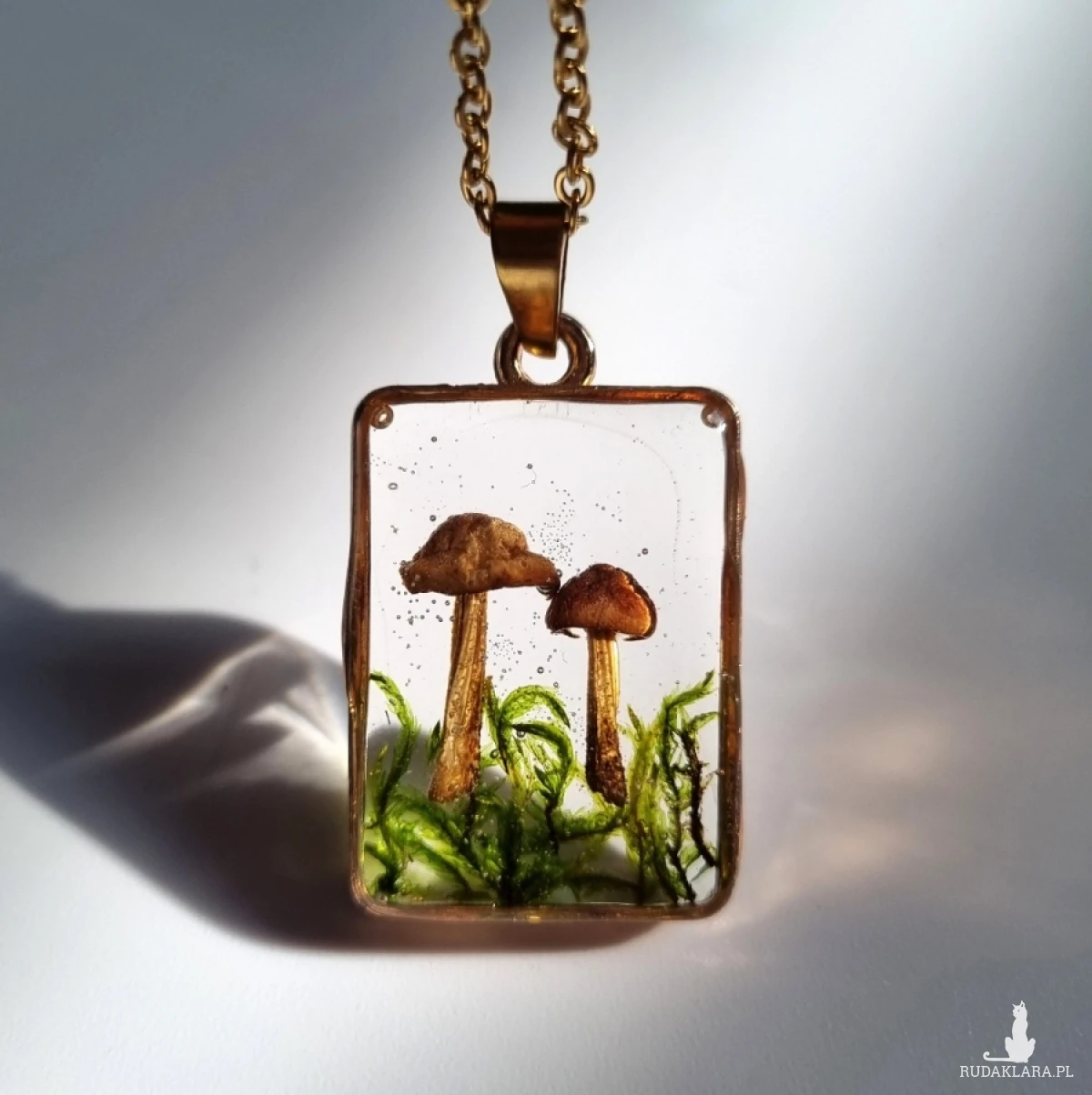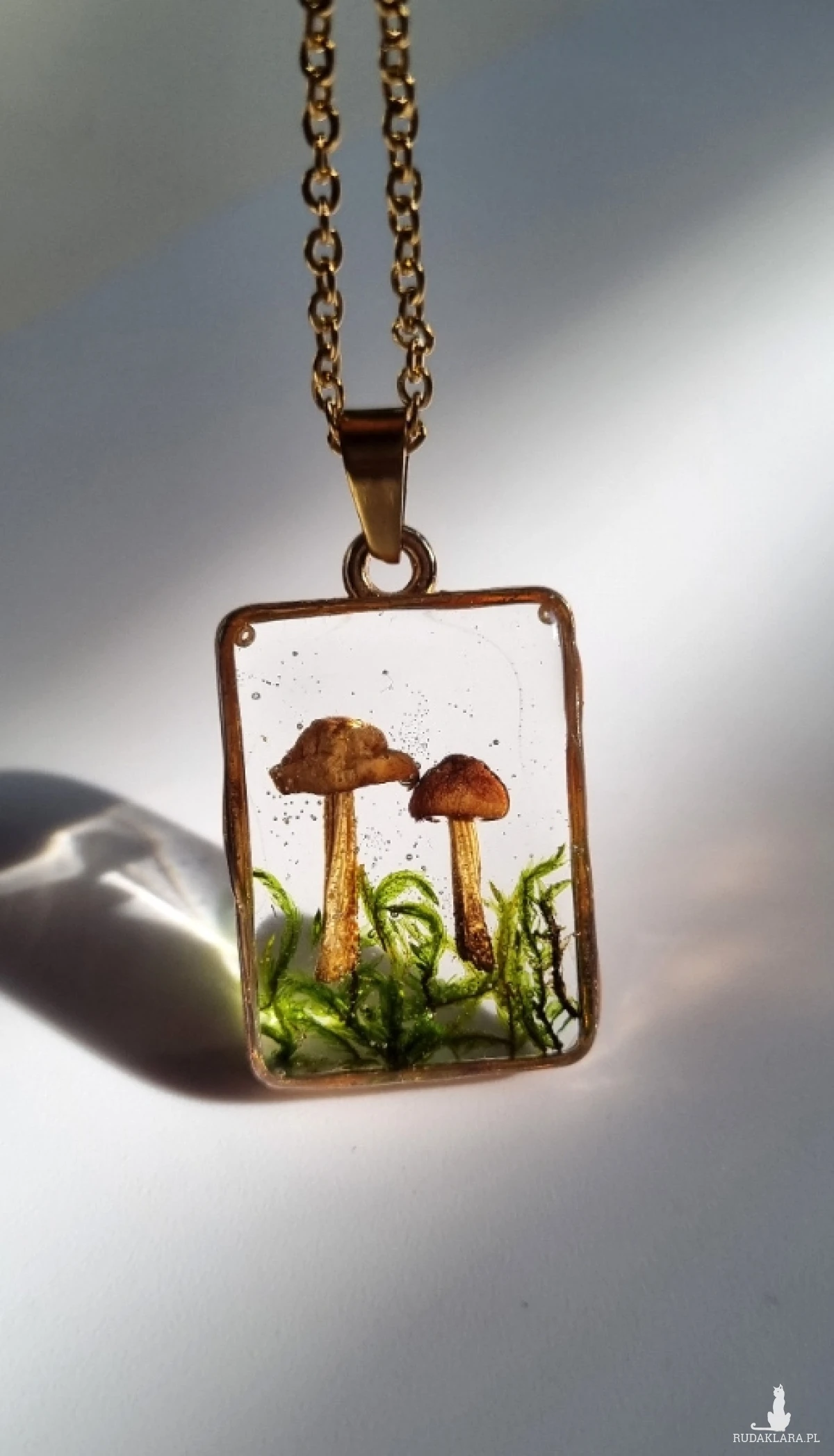 Naszyjnik z prawdziwymi grzybkami i mchem zamknięty w metalowej ramce o średnicy 3 cm. 🍄