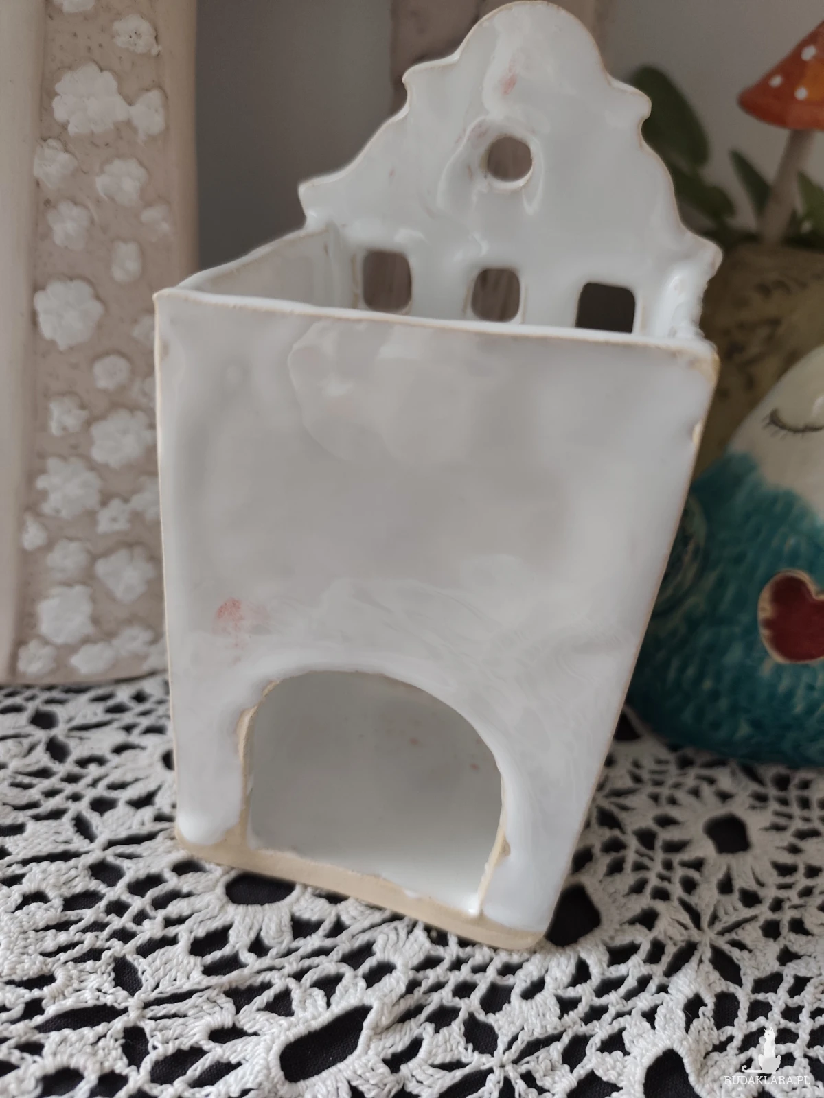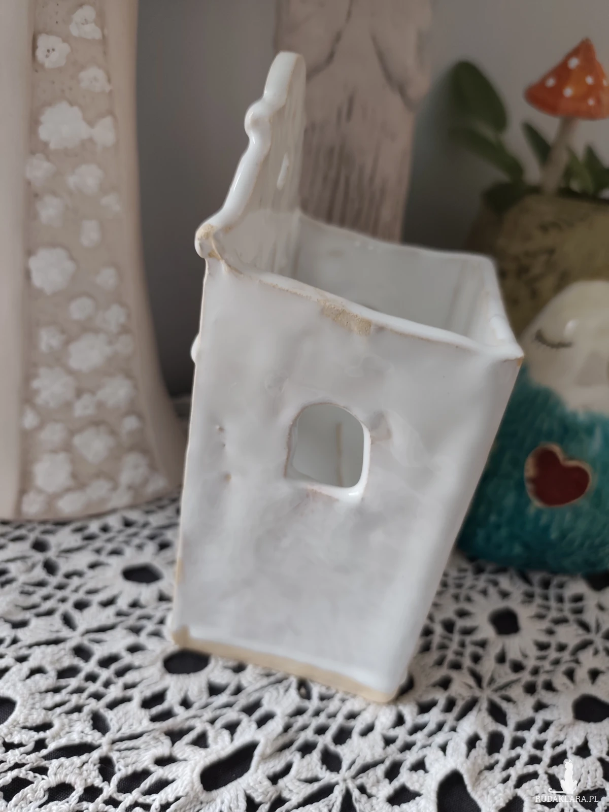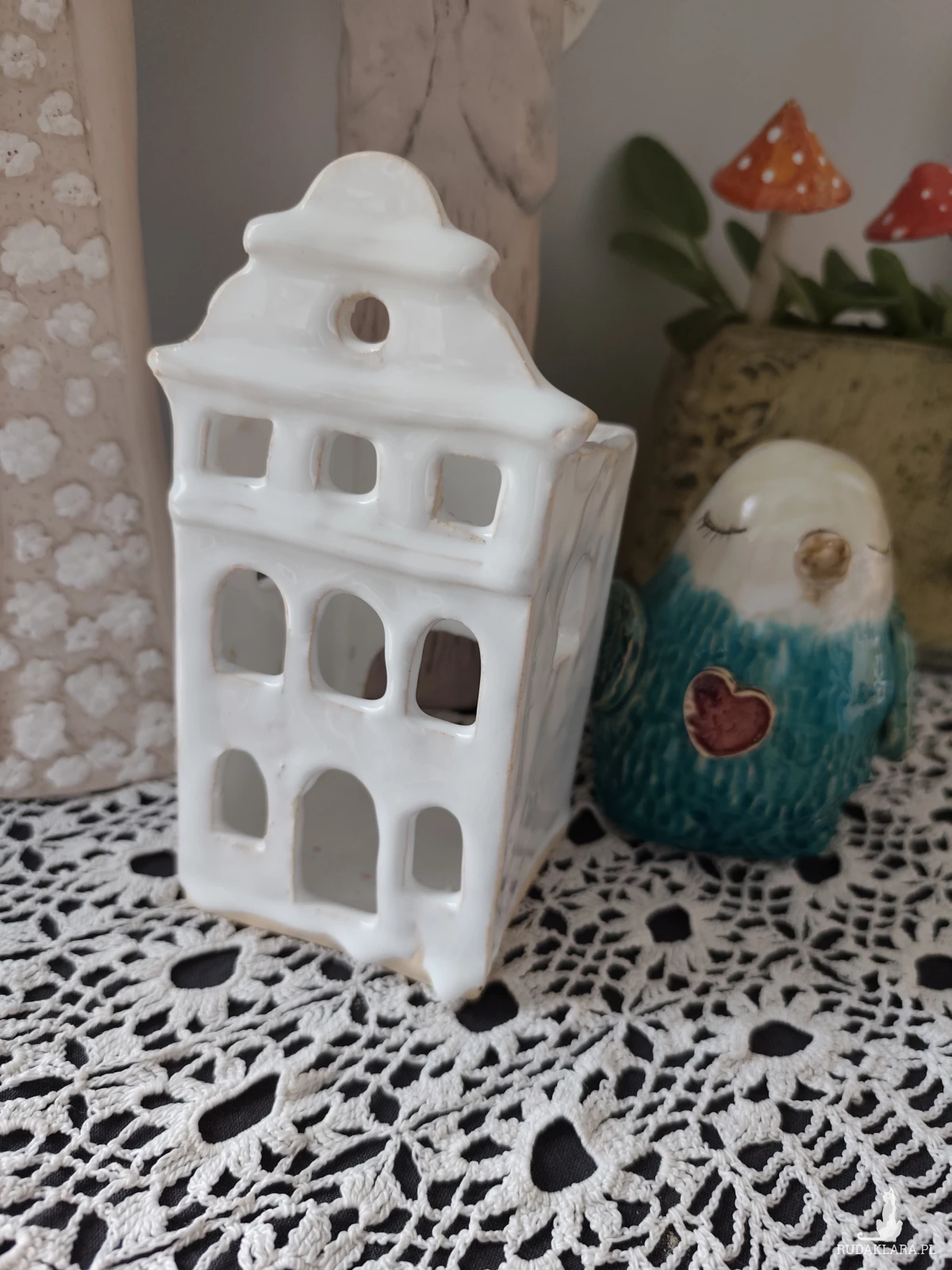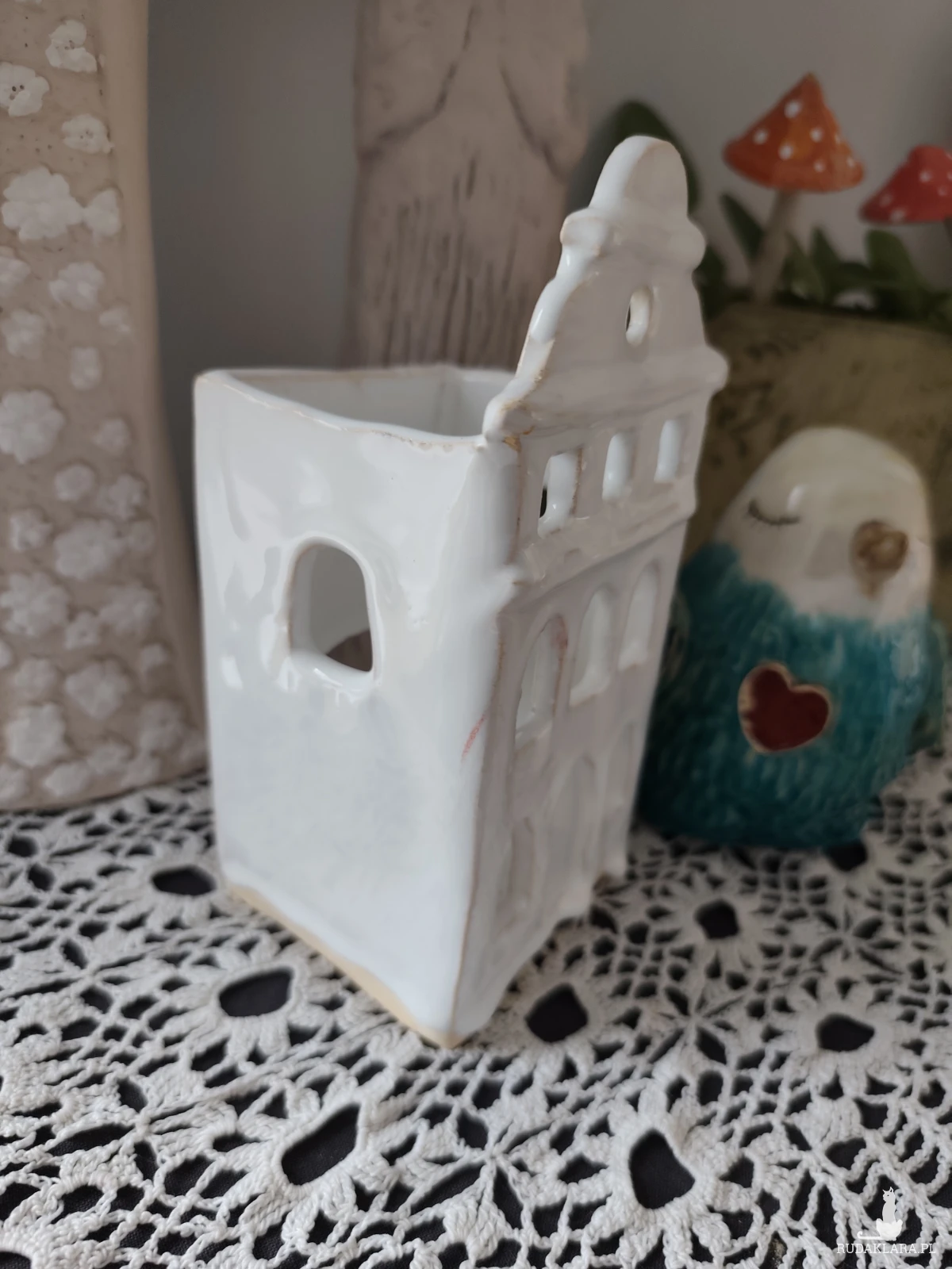 Ręcznie wykonana kamieniczka ceramiczna - lampion, szkliwiona i dwukrotnie wypalana w piecu ceramicznym na wysoką temperaturę. W pięknych barwach. Wysokość 18 cm.