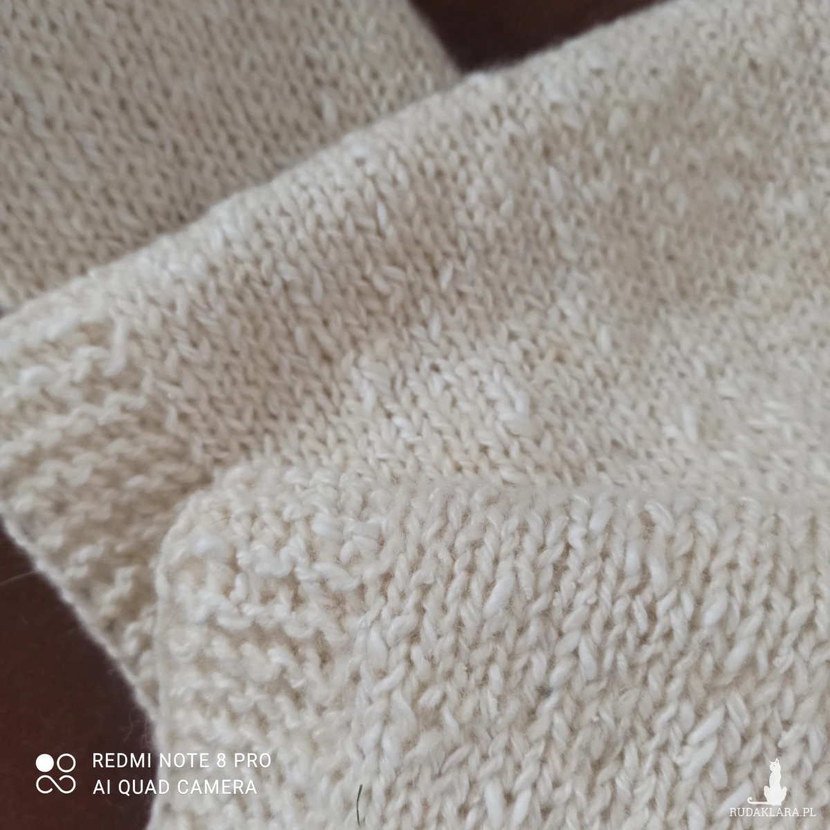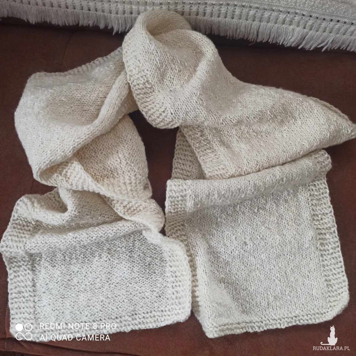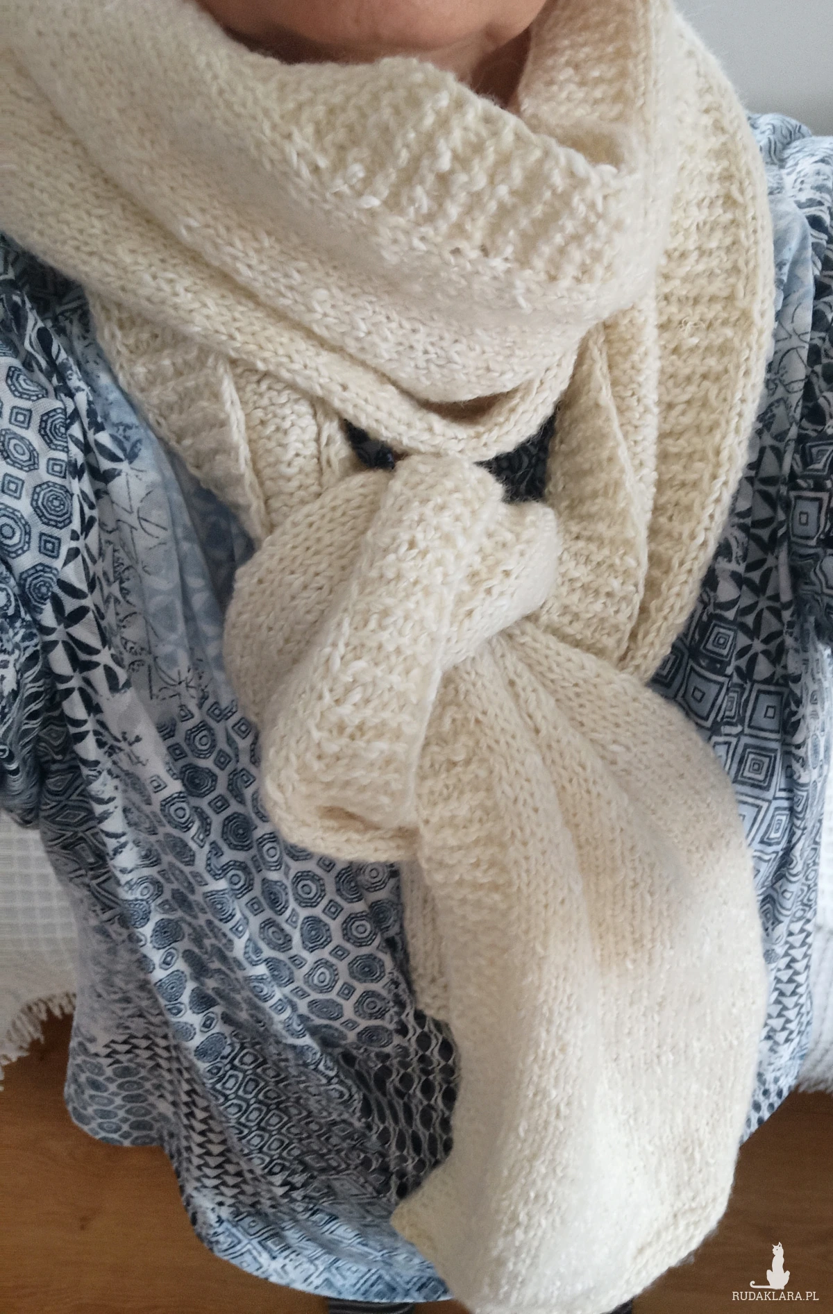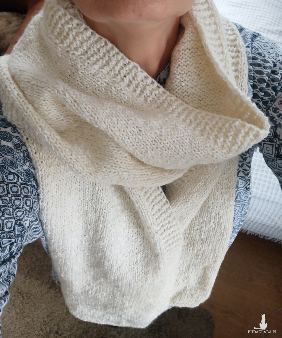 Bardzo obszerny i długi biały szal wykonany na drutach z wełny. Dekoracyjny wykonany tak, że obydwie strony są inne. Jedna strona oczka prawe druga strona oczka lewe. Cały wyrób zmyka pliska wykonana ściegiem francuskim. Bardzo skutecznie chroni przed zimnem ze względu na swoje wymiary oraz nić wełnianą, z której został wykonany. Z pewnością dobrze przepuszcza powietrze. Nie gryzie. Pranie ręczne. Polecam!