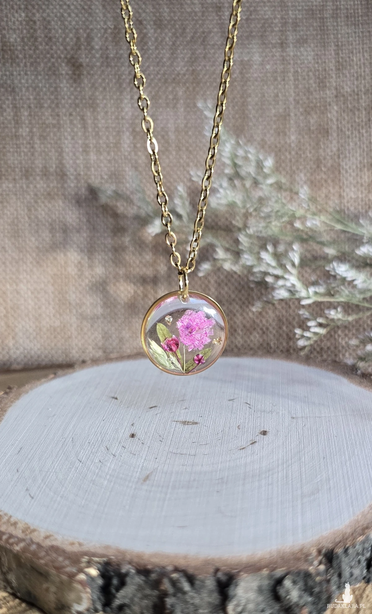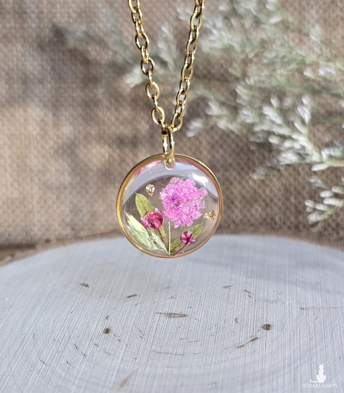 Oferuję Państwu unikalną biżuterię. Zawieszka jest wykonana z suszonych kwiatów i żywicy epoksydowej. Biżuteria jest wspaniałym i oryginalnym prezentem na lata.