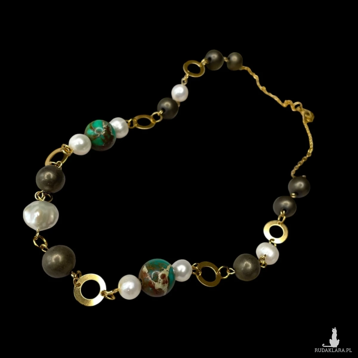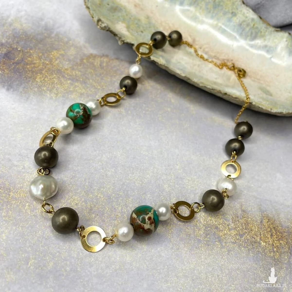 Materiał: perły naturalne hodowlane, jaspis cesarski, hematyt, pozłacana stal chirurgiczna