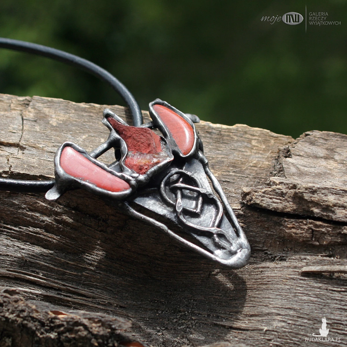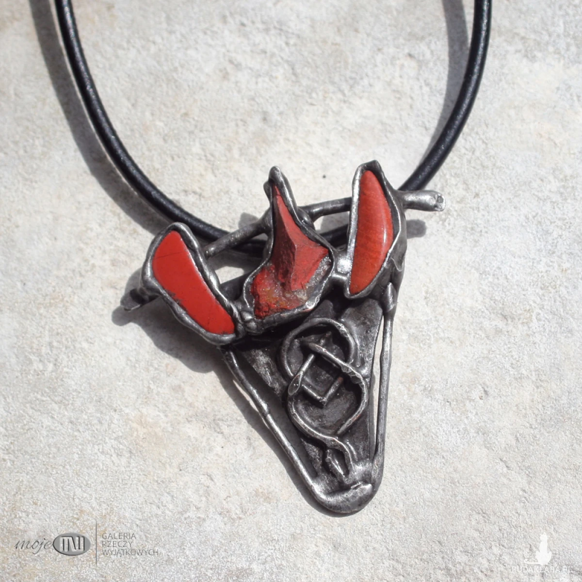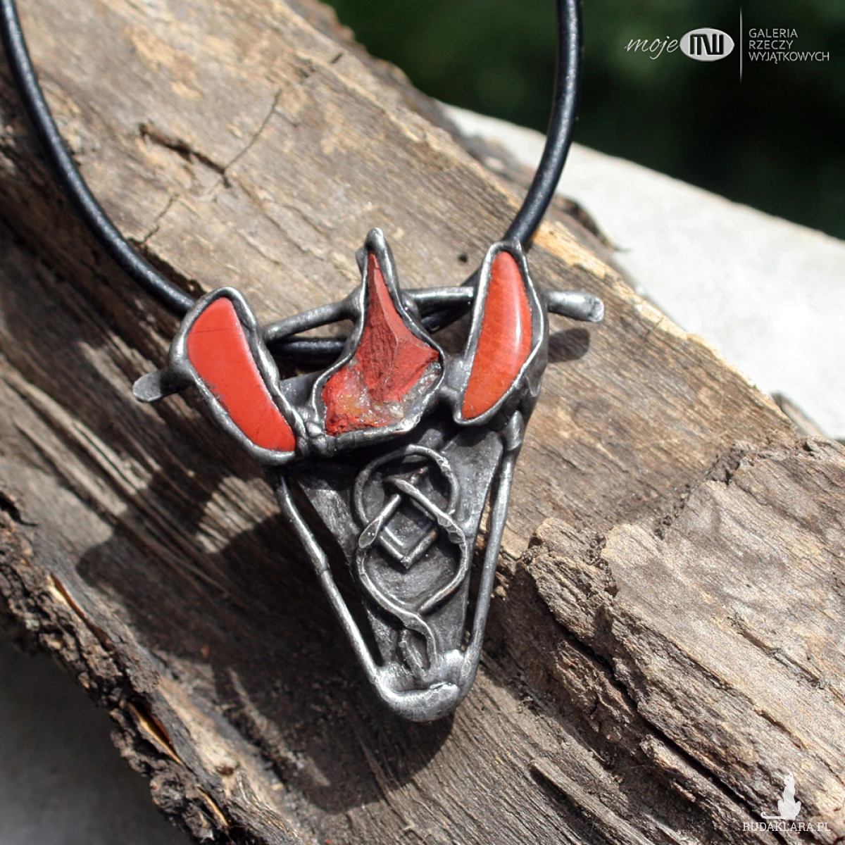 Męski naszyjnik z zawieszką w trójkątnym kształcie. Główną jego ozdobą są czerwone jaspisy - jeden surowy i dwa wygładzone. Całość zrobiona jest z miedzi - pokrytej cyną i patynowanej, potem przetartej dla wydobycia zdobień nawiązujących do celtyckiej plecionki. Wisior zawieszony jest na czarnym skórzanym rzemieniu o gr. 3 mm i długości ok 50 cm