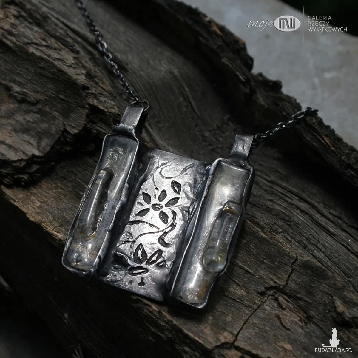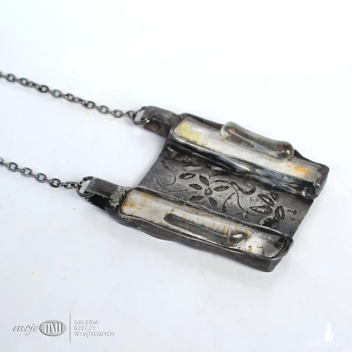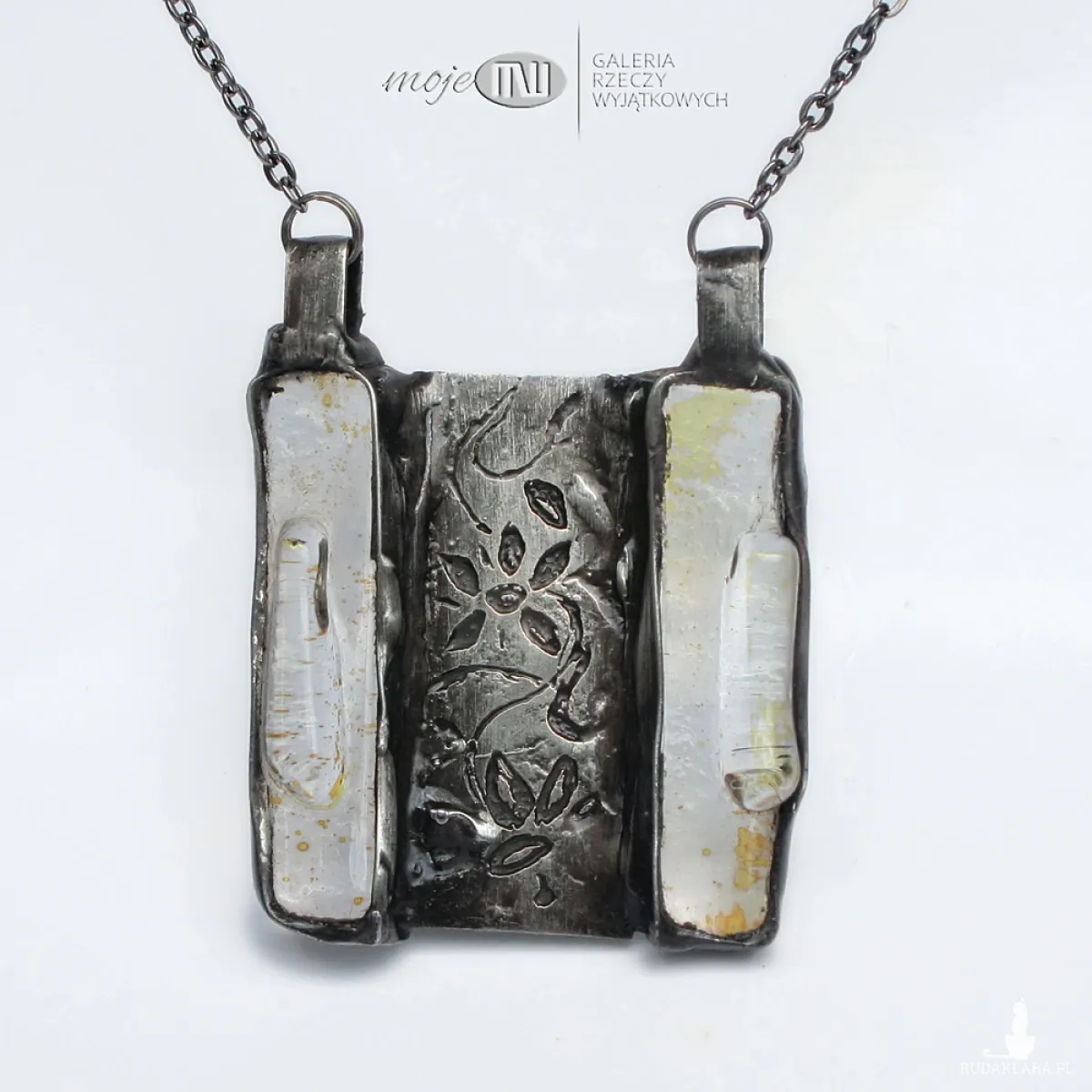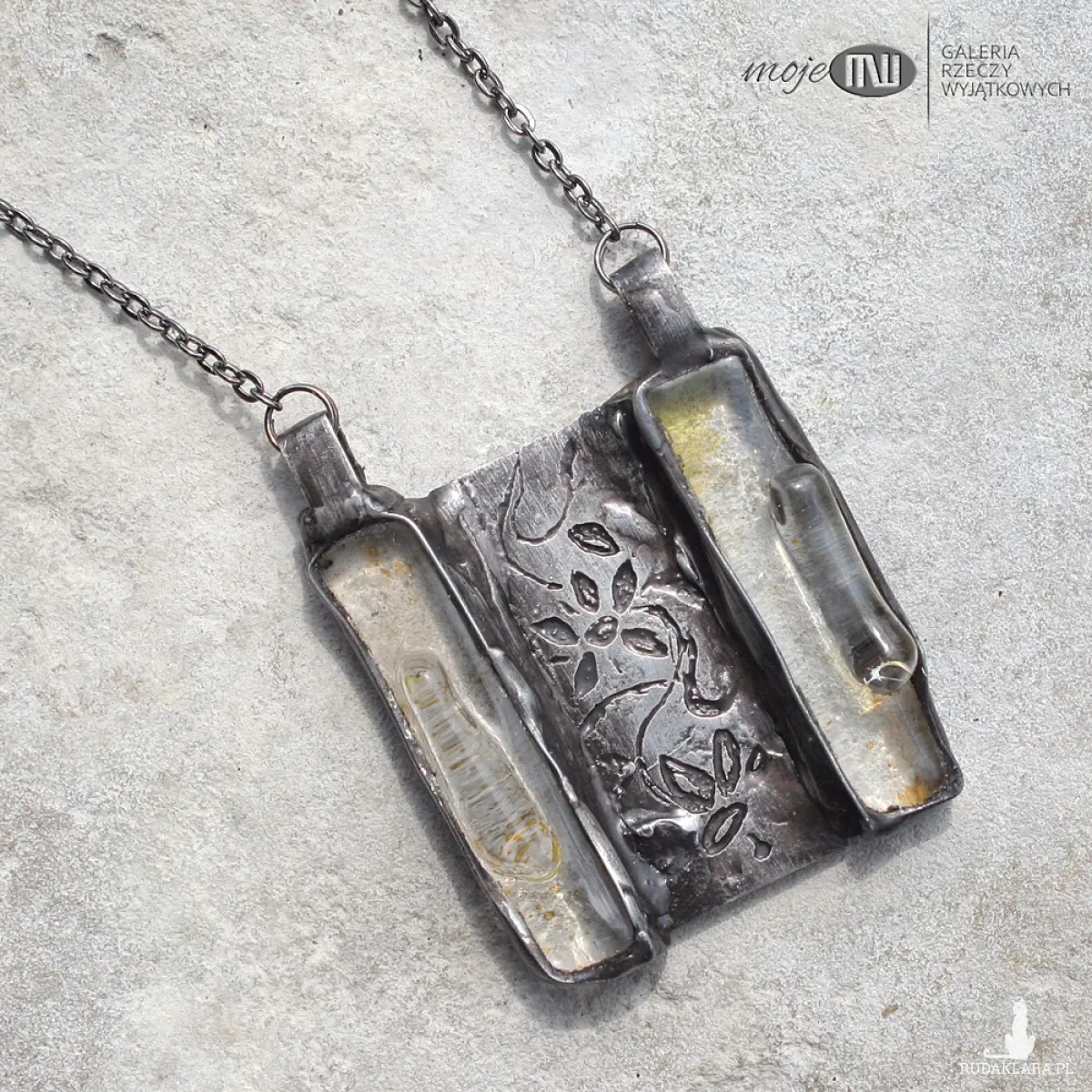 Wisior zdobiony roślinnym motywem. Zrobiłam go z dwóch tafli bezbarwnego, topionego szkła i miedzi - trawionej, cynowanej, patynowanej i przecieranej, aby pokazać roślinny deseń.