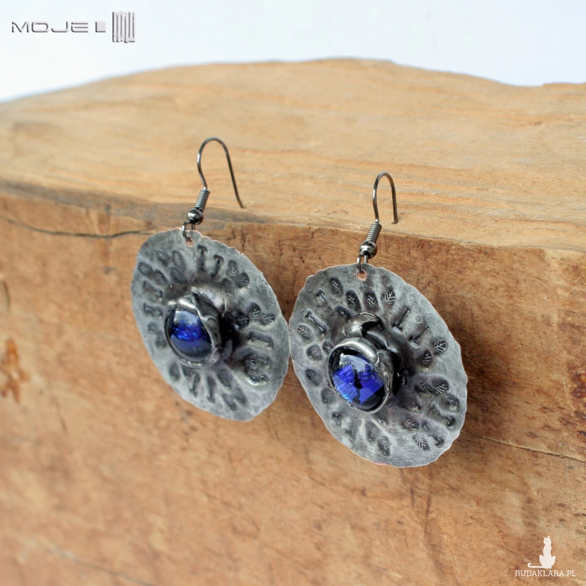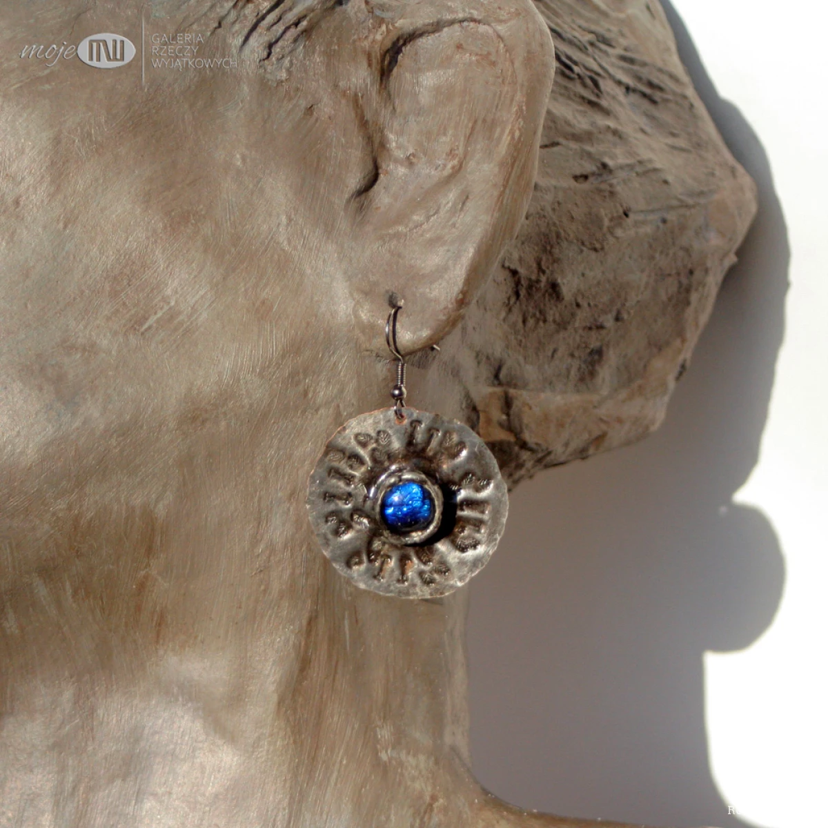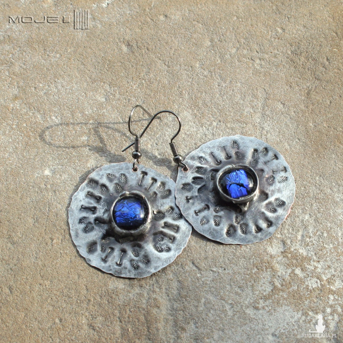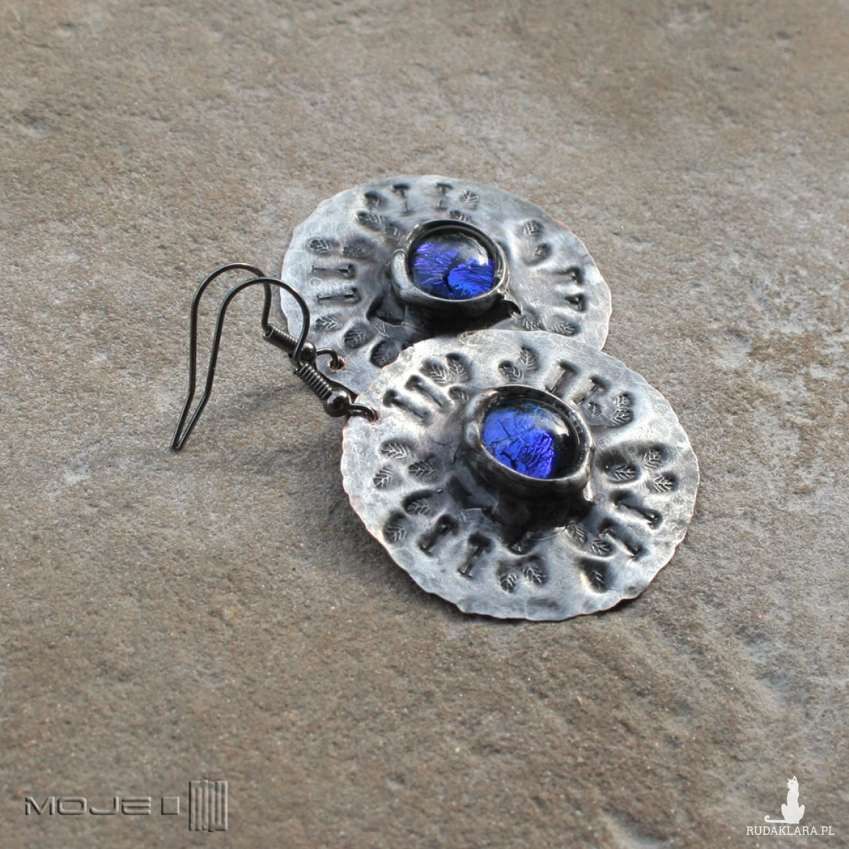 Kolczyki ze szklanym okiem osadzonym na okrągłej, choć nieregularnej, młotkowanej, miedzianej blasze pokrytej cyną, patynowanej i przecieranej. Szkło dichroiczne użyte do wytopienia kaboszonów delikatnie połyskuje w słońcu. Blaszka jest cienka, więc kolczyki są lekkie. Metalowe bigle.