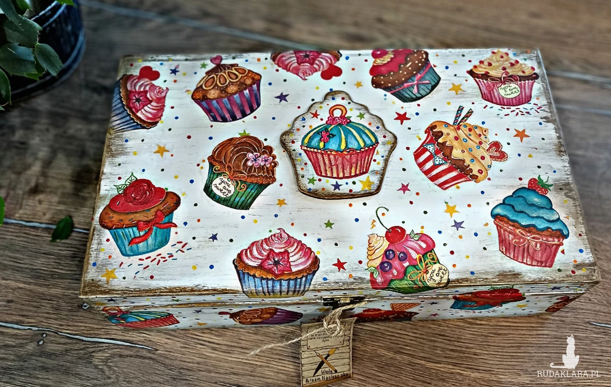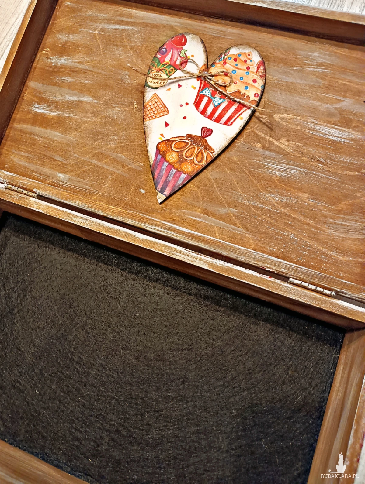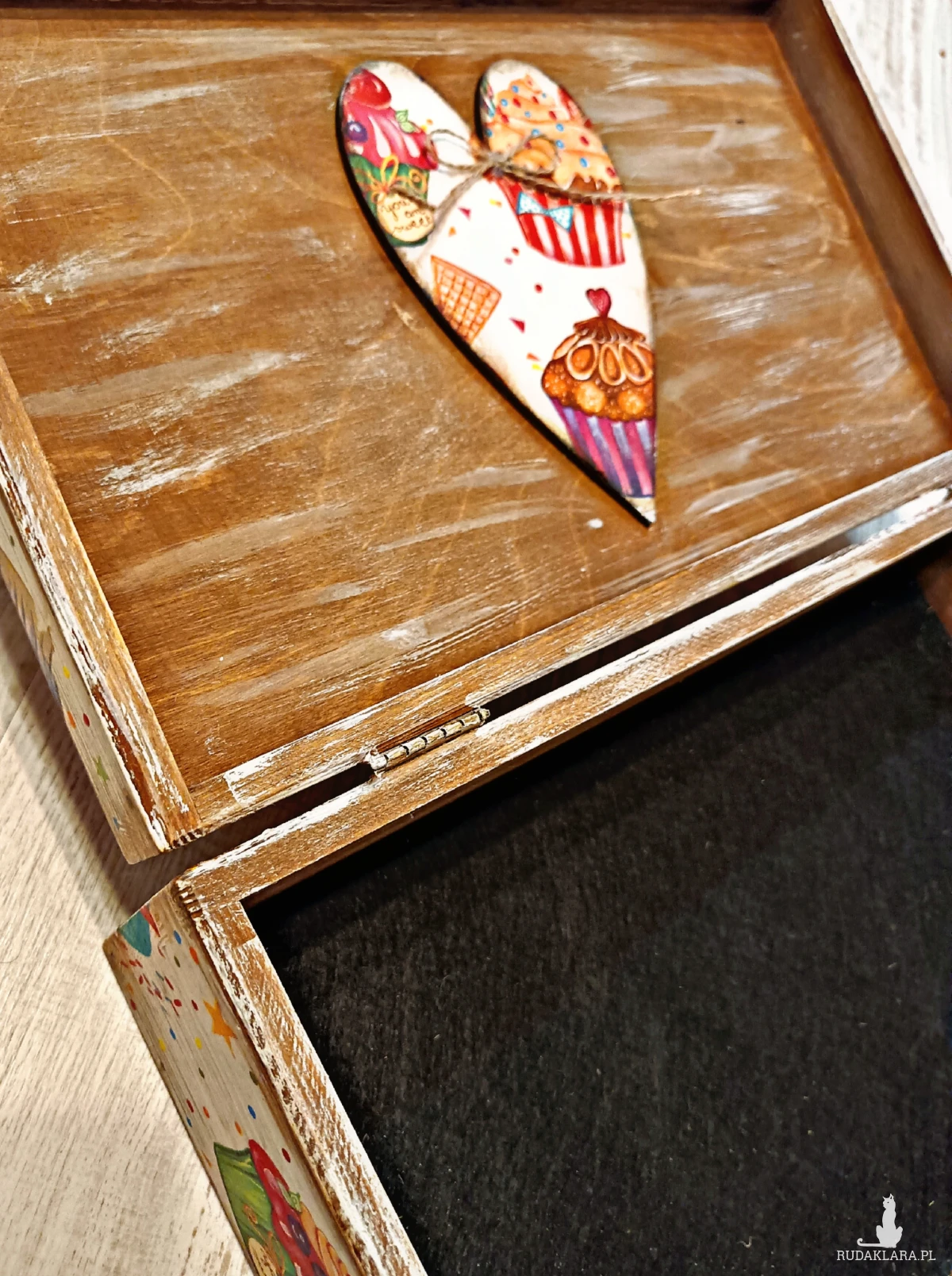 Drewniana skrzynka na przydasie lub "różne różności". Ma jedną dużą komorę, bez żadnych przegródek czy przedziałek. Dno wyłożone czarnym filcem. Będzie idealna również na większą biżuterię ( korale, bransolety, naszyjniki). Świetna do zapakowania świątecznego prezentu.