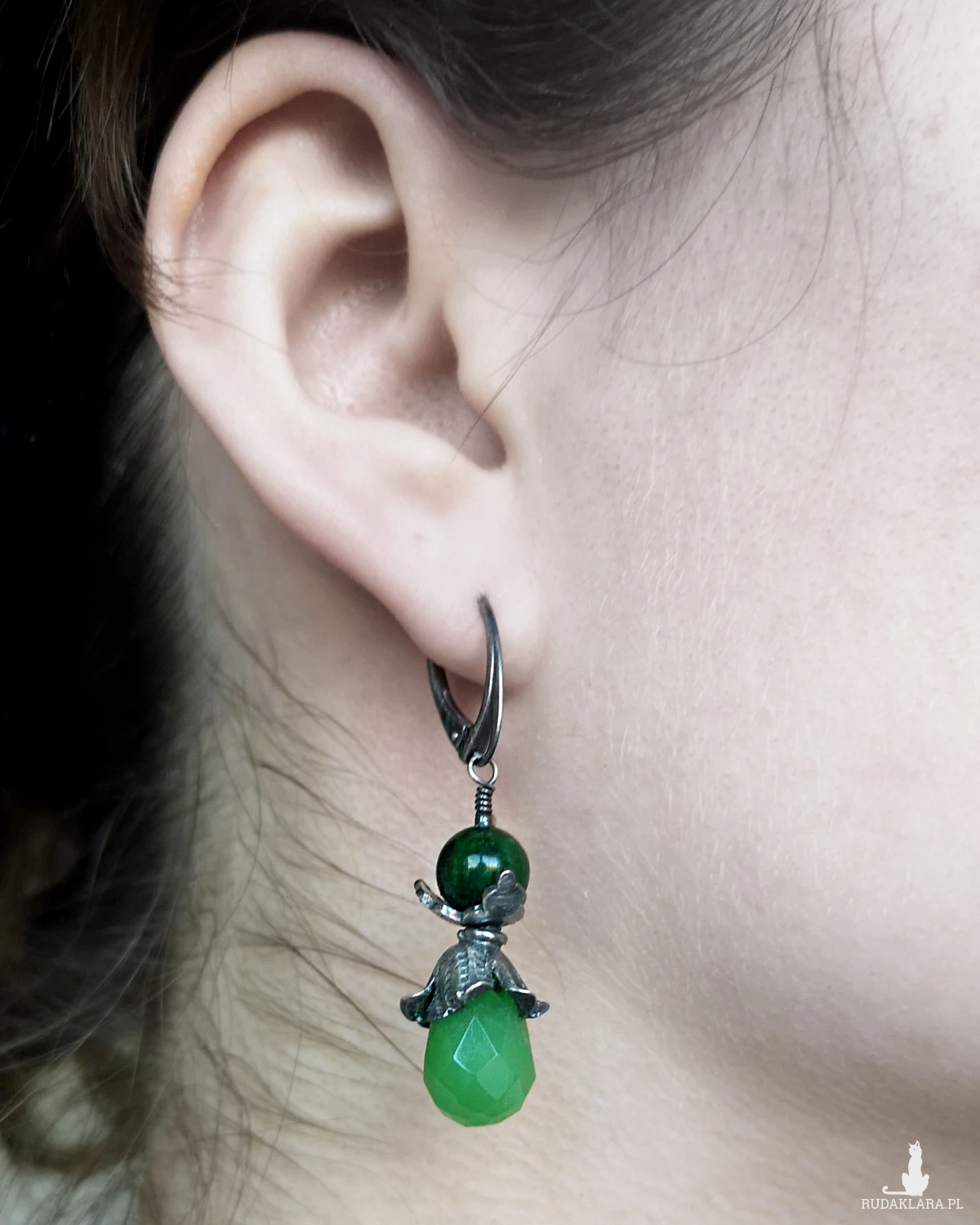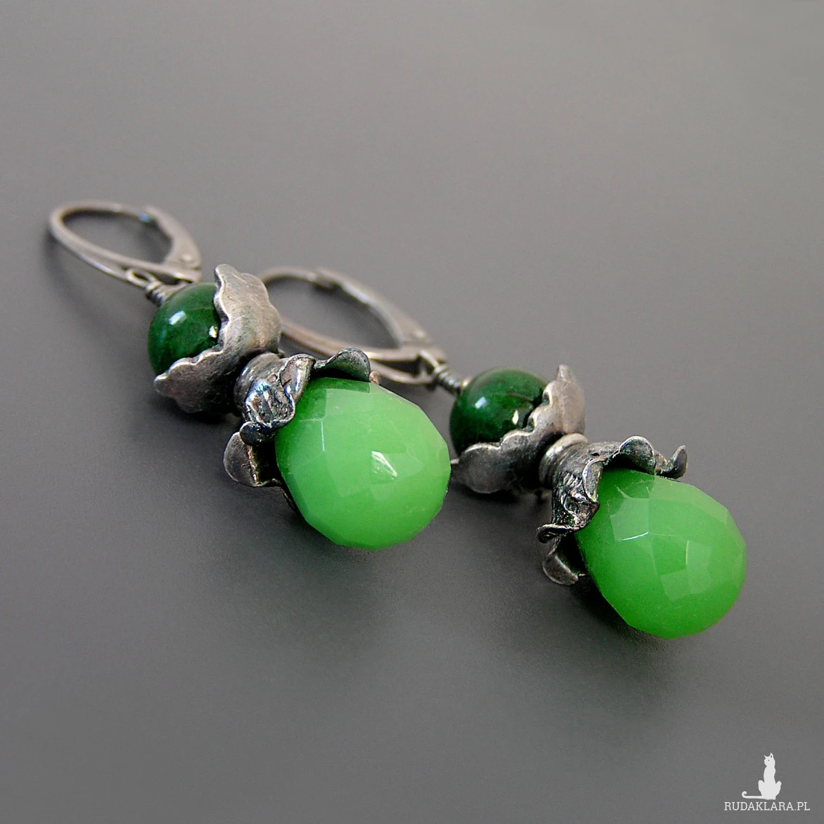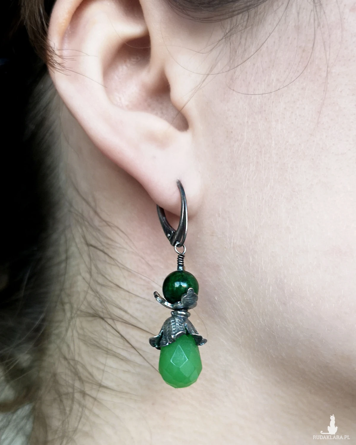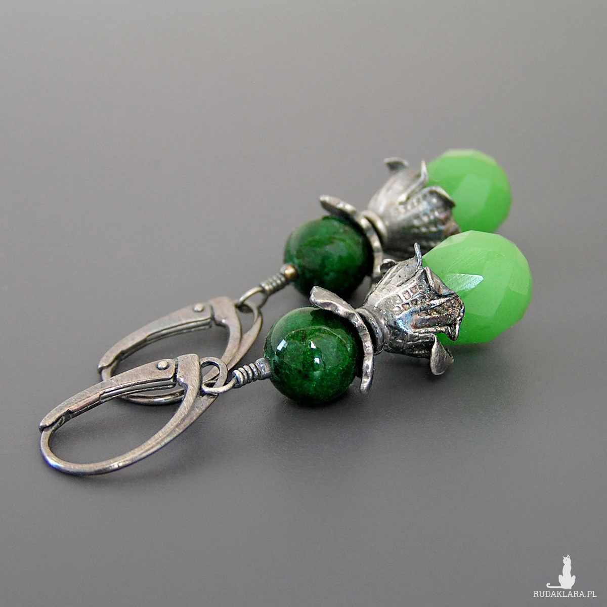 Kolczyki retro z kroplami jadeitu o wymiarach 12 x 9 mm i kulami zielonego marmuru o średnicy 7 mm.