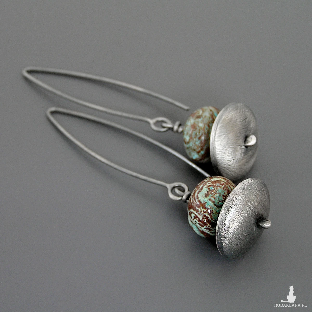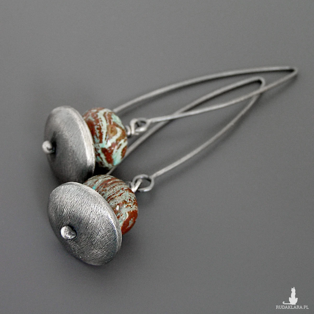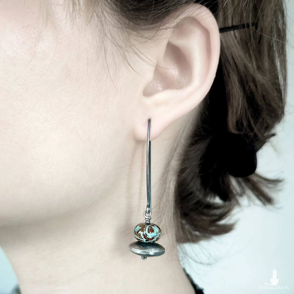 Kolczyki wykonane ze srebra próby 925, patynowane i szczotkowane.