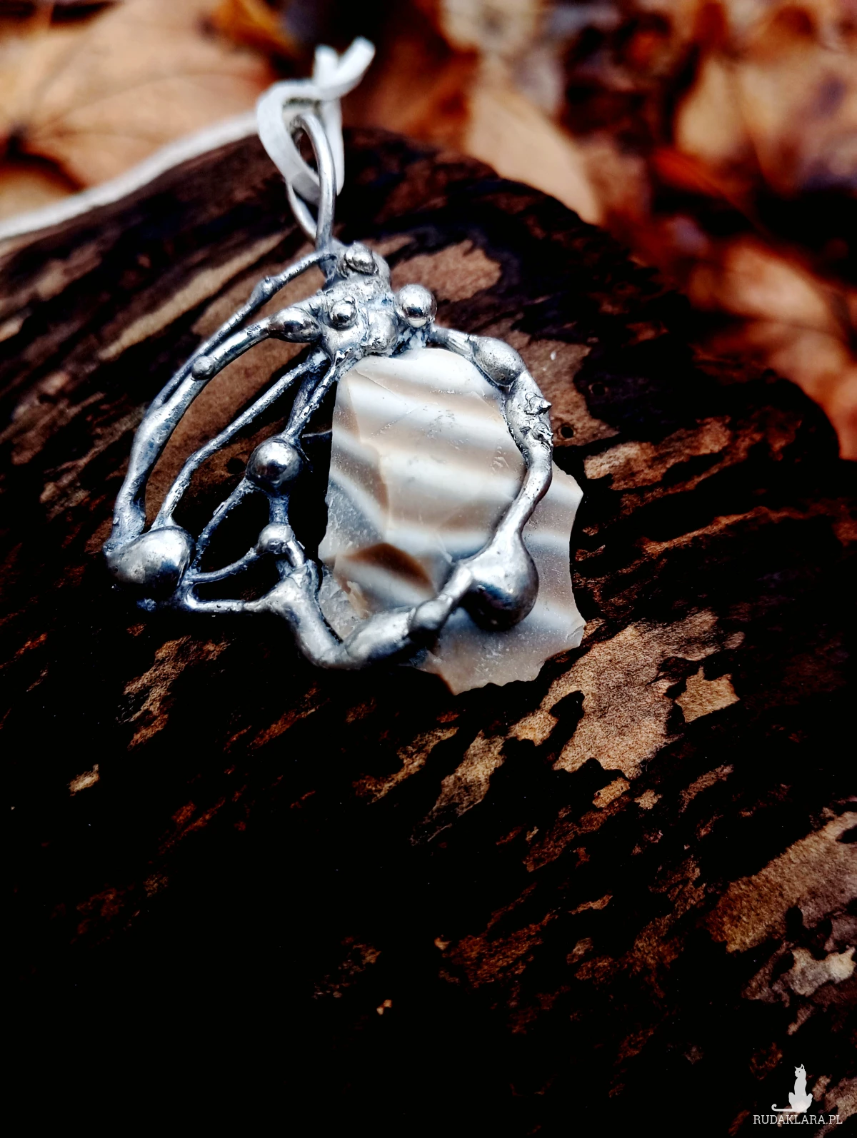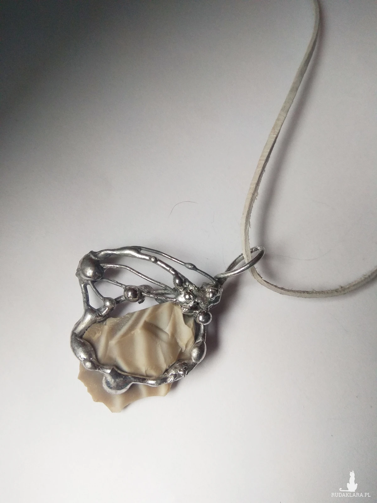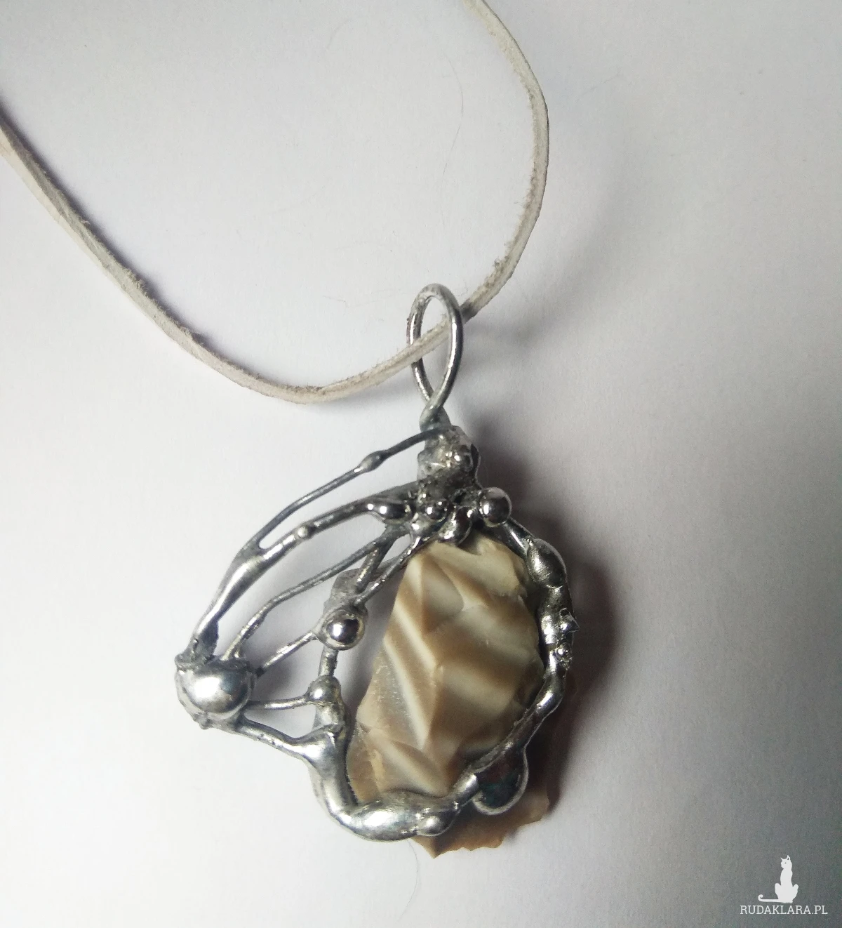Naszyjnik z krzemieniem pasiastym, oprawa cynowa na miedzianym