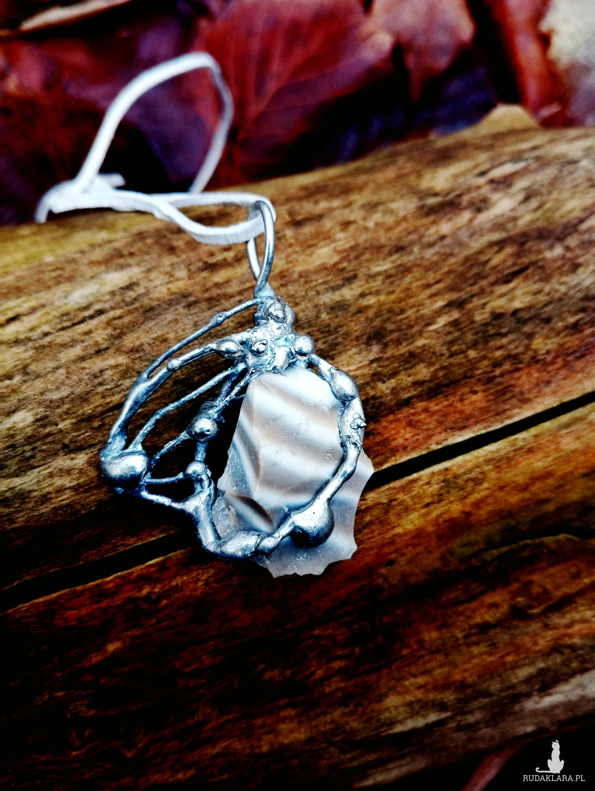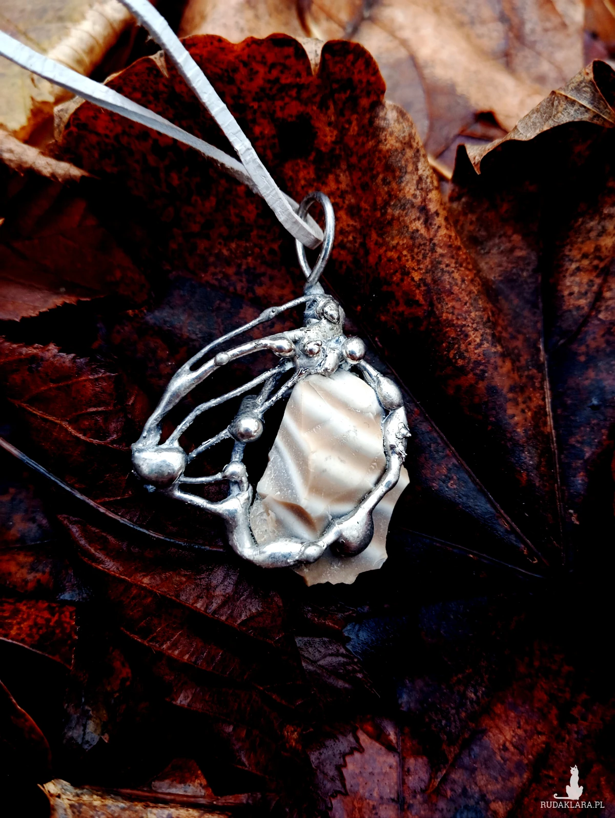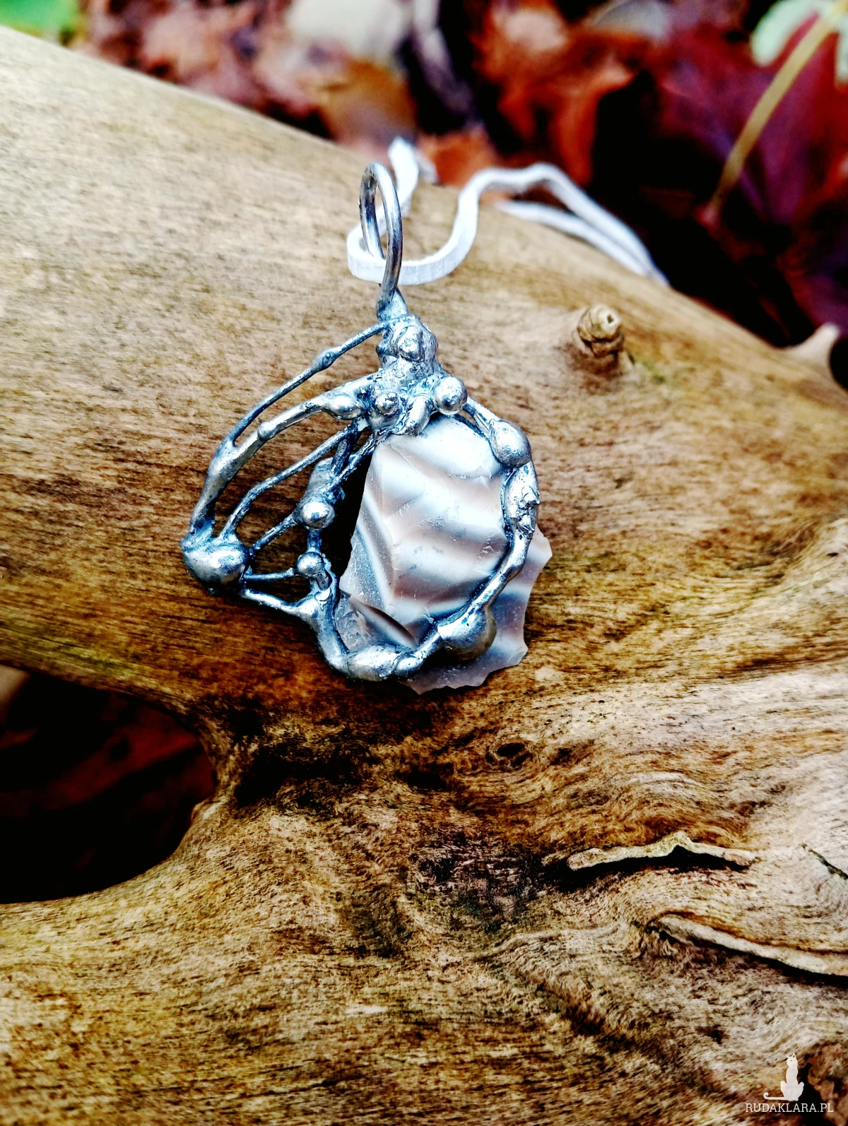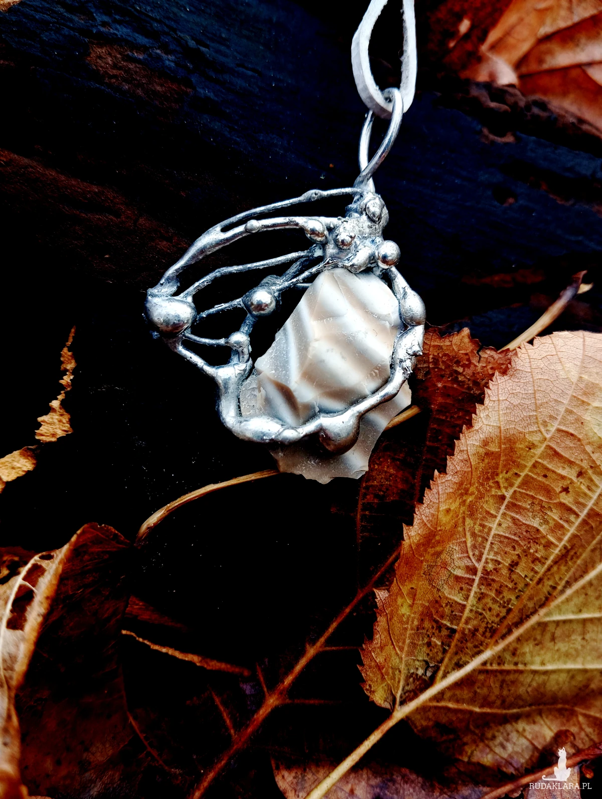 Naszyjnik z krzemieniem pasiastym, oprawa cynowa na miedzianym