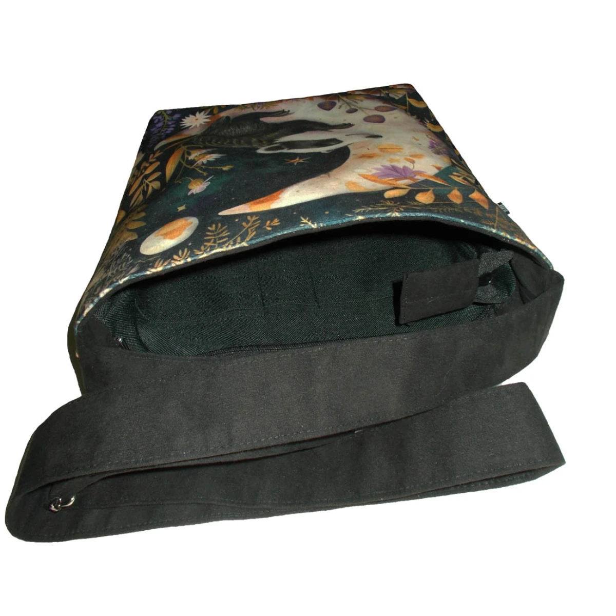 Autorska torba z usztywnionego eko zamszu, zapinana na zamek. Przód z weluru tapicerskiego. Pasek regulowany. Tył w korze paska (czarny) Torba trzyma fason. Wewnątrz dwie kieszenie - jedna na zamek, druga z miejscem na telefon i coś jeszcze. W szwach wypustka. Denko poszerzone. szerokość 32cm wysokość 30cm plus denko 8cm