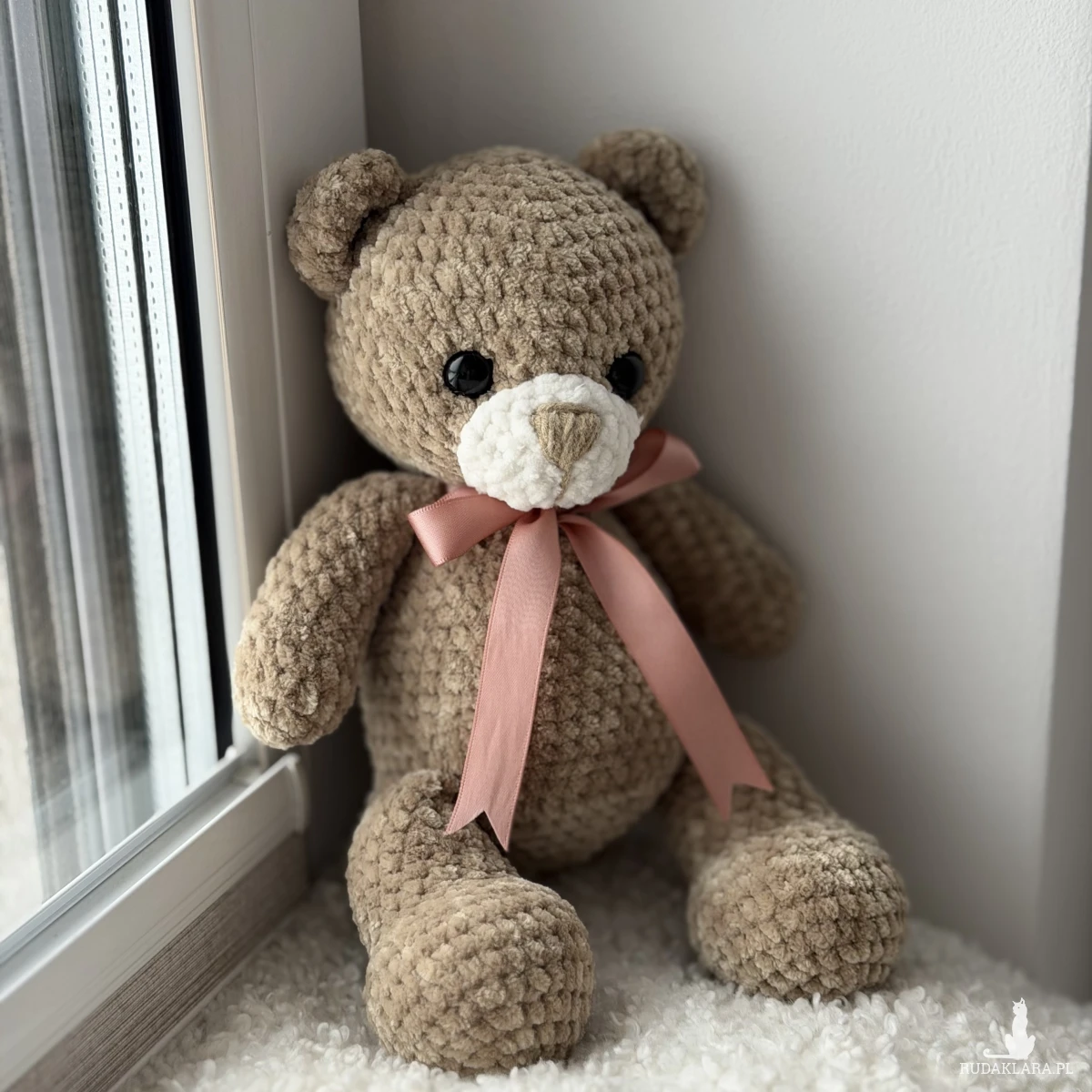 Ma delikatną, pudrowo-różową kokardkę, która dodaje mu subtelnego uroku. To idealny prezent dla dziecka, dekoracja pokoju lub słodki towarzysz do tulenia.