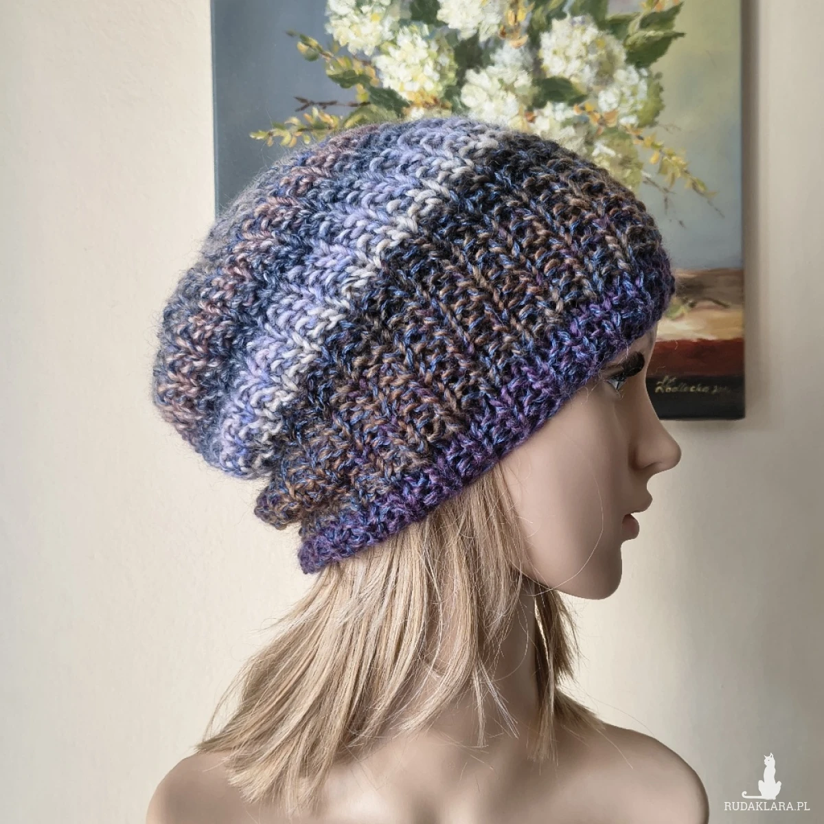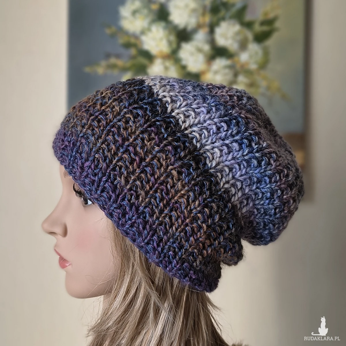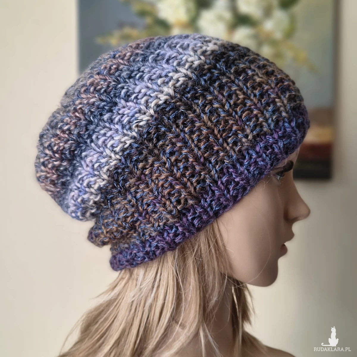 Miła, bezszwowa czapka, wykonana ręcznie na drutach potrójną nitką z doskonałych włóczek: jedna z nich to peruwiańska wełenka 100% merino (połączyłam dwie nitki), druga - hiszpańska włóczka o składzie 53% wełny i 47% akrylu. Czapka jest lekka, nie jest tak puchata, jak czapki z nicią moherową, do jest atutem dla osób nielubiących efektu puchatości, ale jest miła i miękka. i bardzo ciepła. Efekt kolorystyczny jest nietuzinkowy i twarzowy. Polecam dla obwodów głowy 55-58 cm. Dł. czapki - 26 cm. Pranie - jak w przypadku wszystkich moich wyrobów - wyłącznie ręczne.