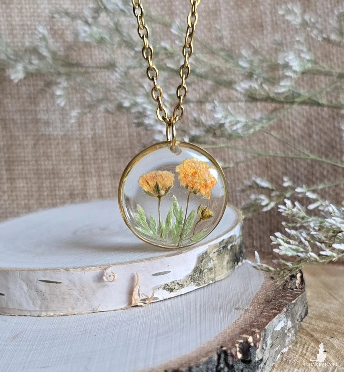 Oferuję Państwu unikalną biżuterię. Zawieszka jest wykonana z suszonych kwiatów i żywicy epoksydowej. Biżuteria jest wspaniałym i oryginalnym prezentem na lata.