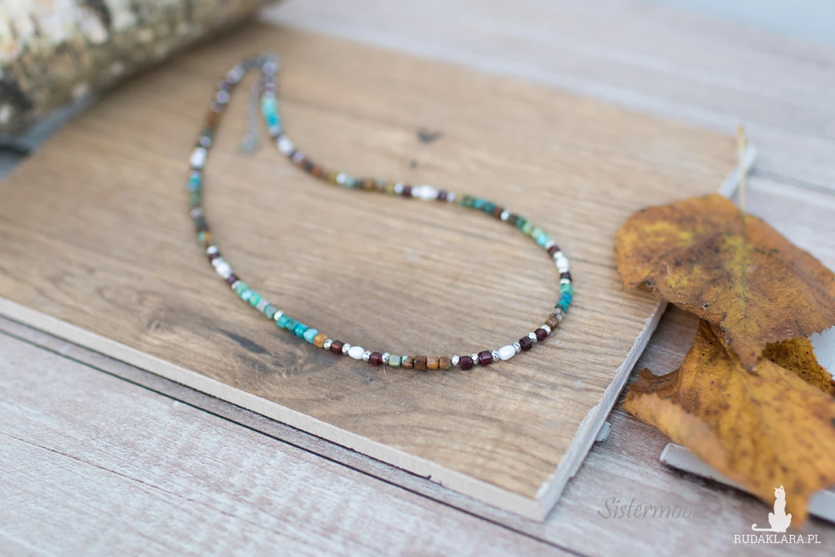 Choker Turkusy Granaty i Perły. Krótki naszyjnik w eleganckiej odsłonie. Idealny na nietuzinkowy prezent.