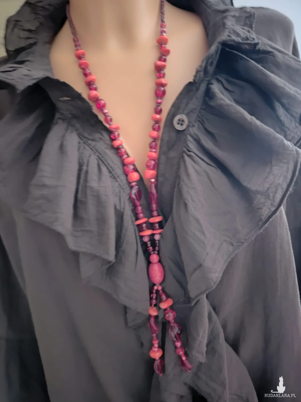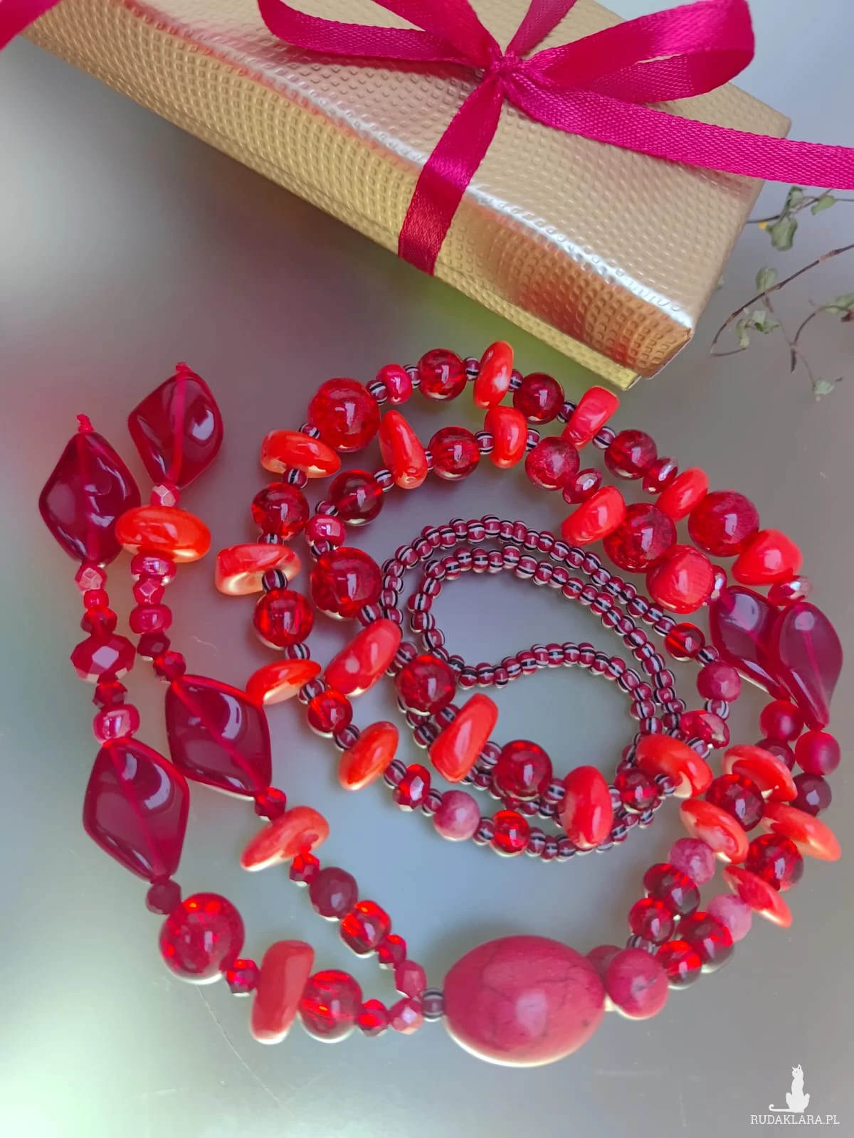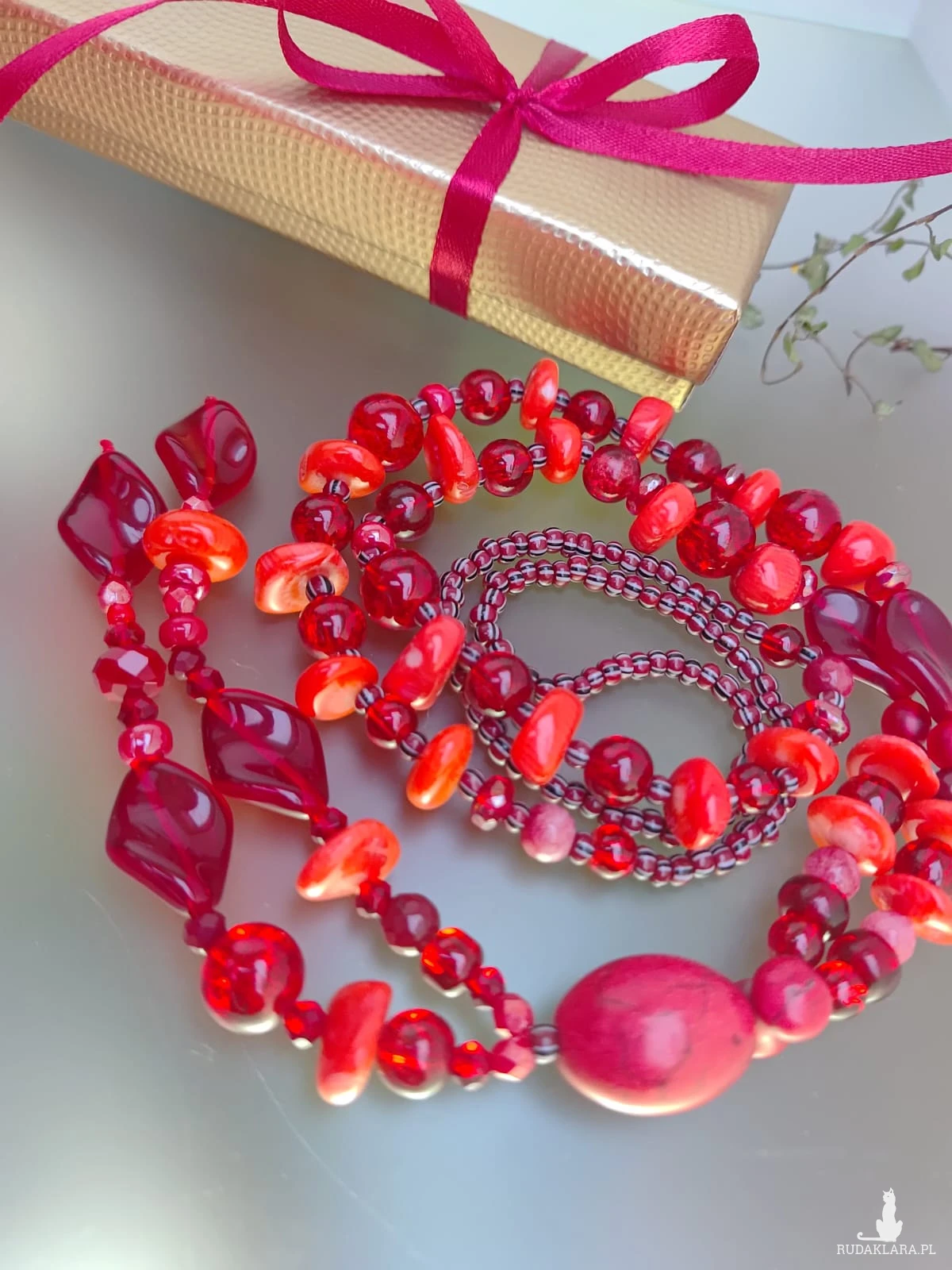 Naszyjnik długi z koralików. Mix koralików szklanych, howlit czerwony i koral czerwony bryłki, hematyt. Delikatny, efektowny naszyjnik. Bez zapięcia, przekładany przez głowę. Na sznurku syntetycznym czerwonym. Długość naszyjnika z frędzlami wynosi 48 cm @wszyscy
