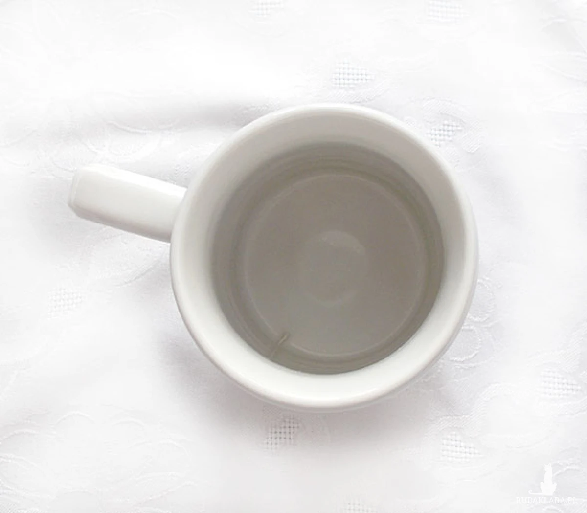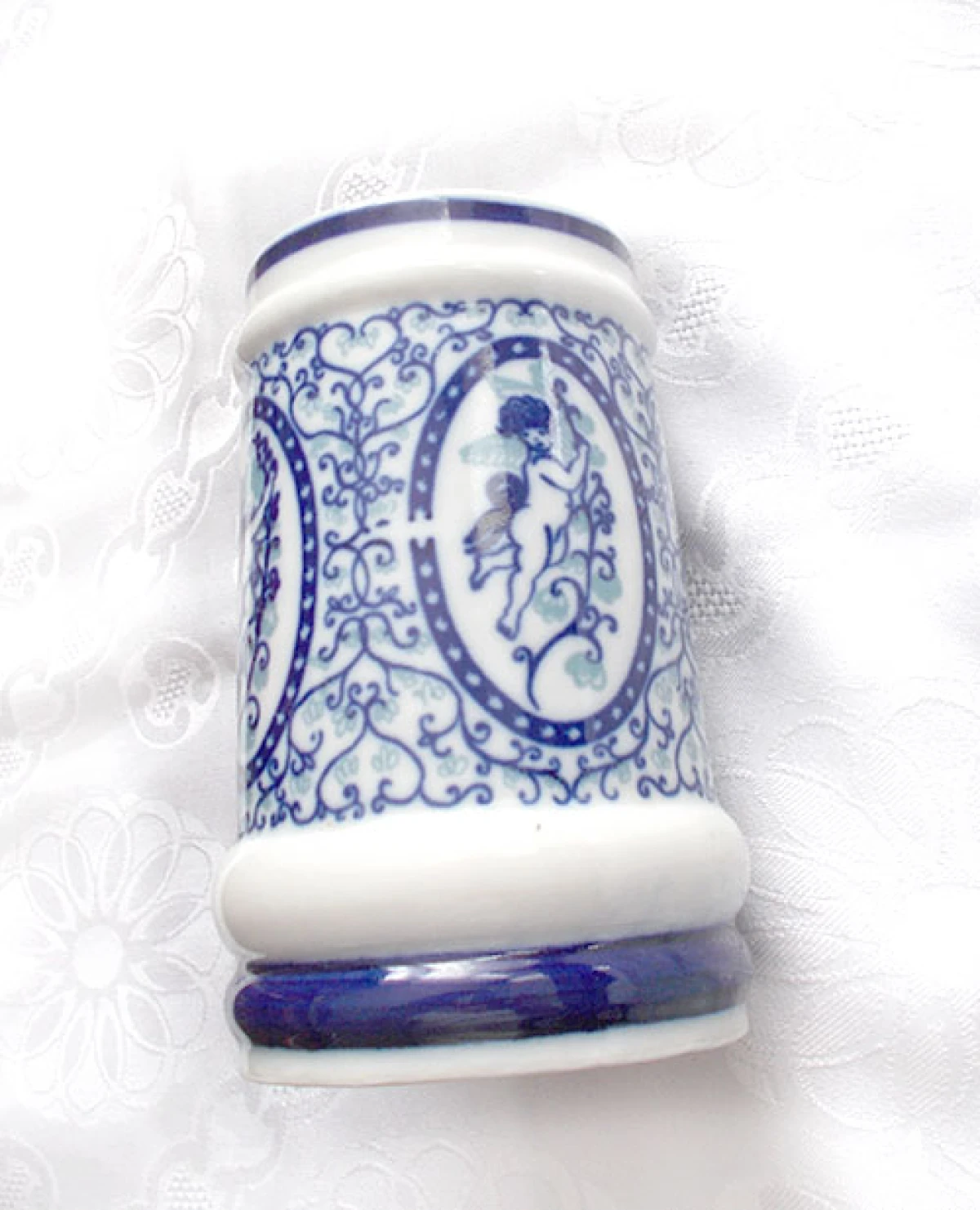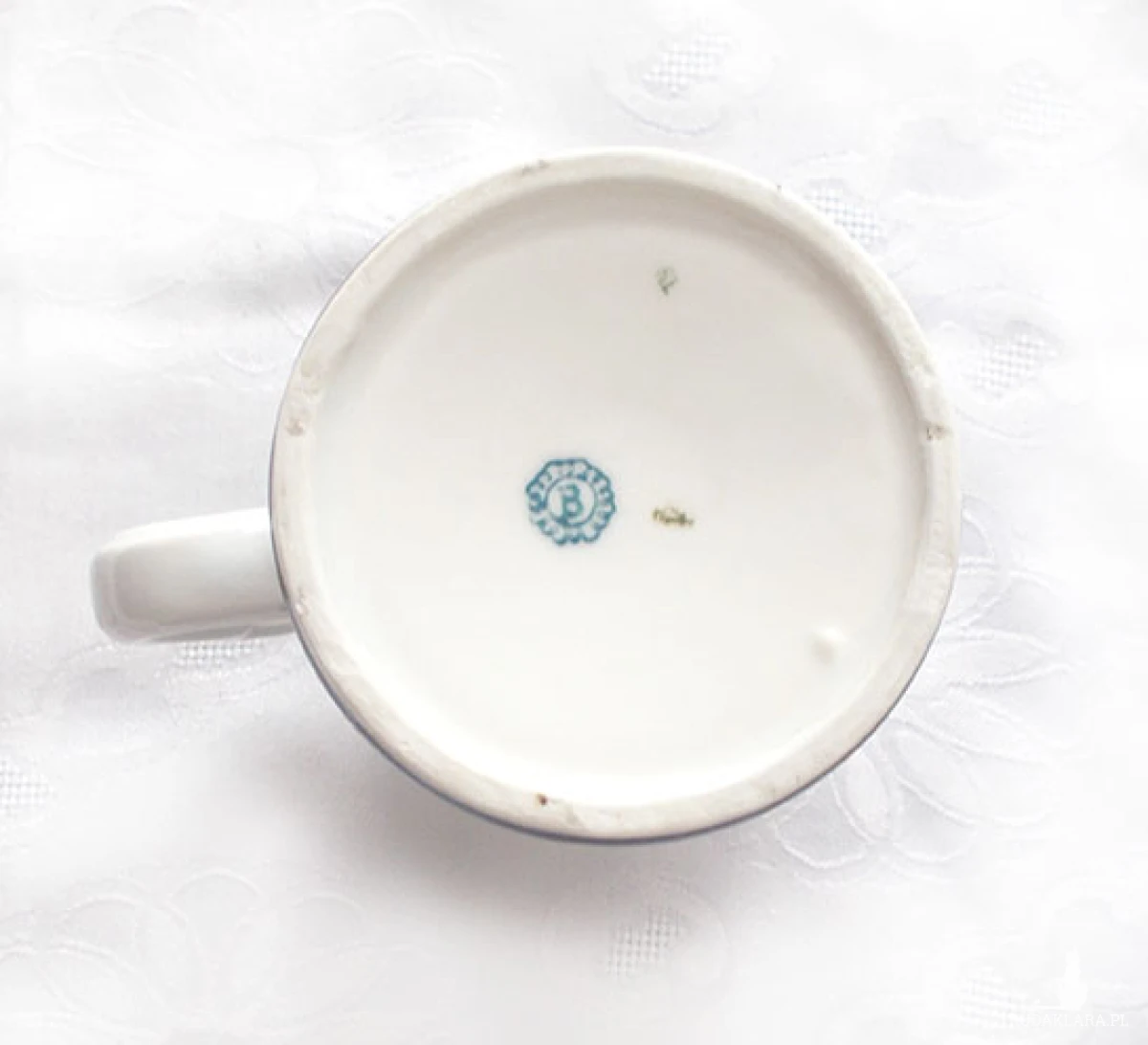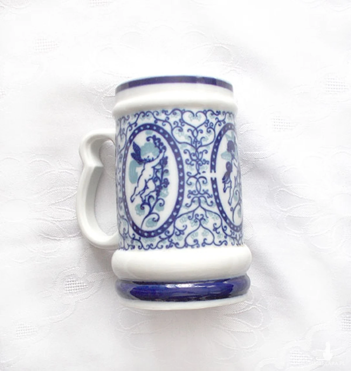 Przedmiot vintage z epoki PRL, lata 70 XX w.. Ceramiczny, ozdobny kufel z granatowym wzorem z małymi amorkami. Producent "Bogucice". Wymiary: wysokość 16 cm, szerokość z uchem 12 cm, średnica u góry 8 cm, średnica u dołu 9 cm. Ogólny stan bdb.