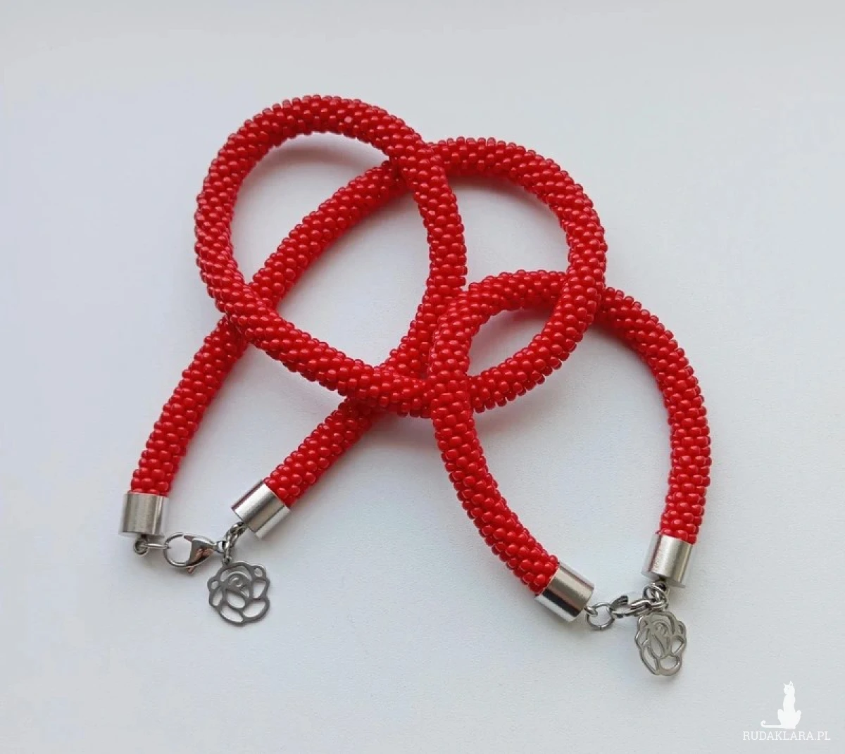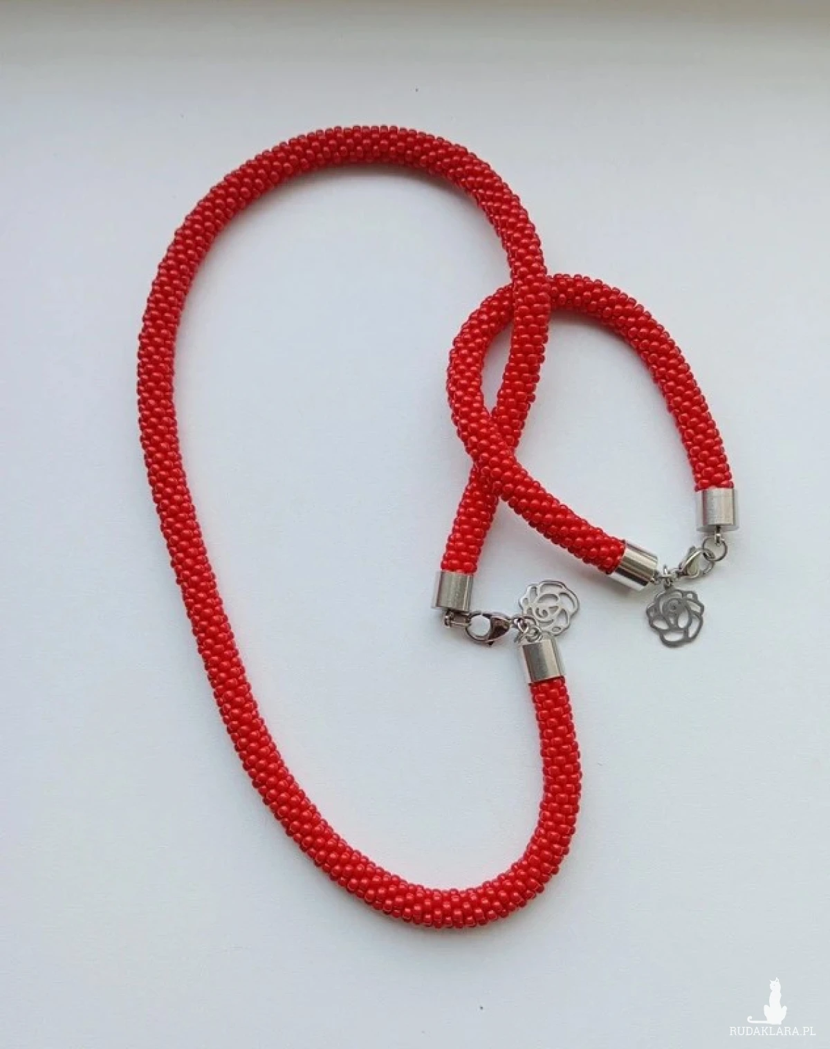 Koralikowy czerwony komplet: naszyjnik i bransoletka ręcznie robione na szydełku z drobnych szklanych koralików. Długość naszyjnika 50,5 cm, bransoletki 21 cm. Zapięcia ze stali chirurgicznej, na życzenie mogę wstawić łańcuszki przedłużające naszyjnik i bransoletkę.