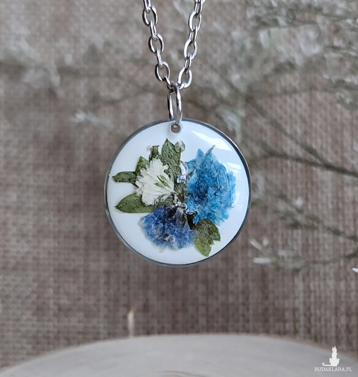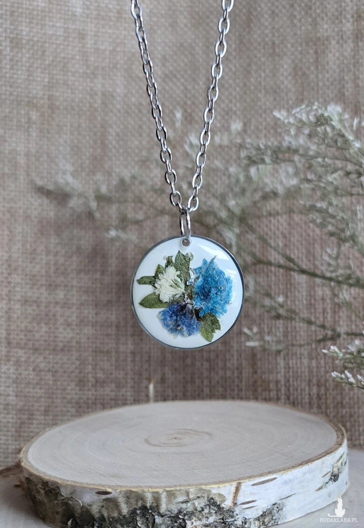 Oferuję Państwu unikalną biżuterię. Zawieszka jest wykonana z suszonych kwiatów i żywicy epoksydowej. Biżuteria jest wspaniałym i oryginalnym prezentem na lata.