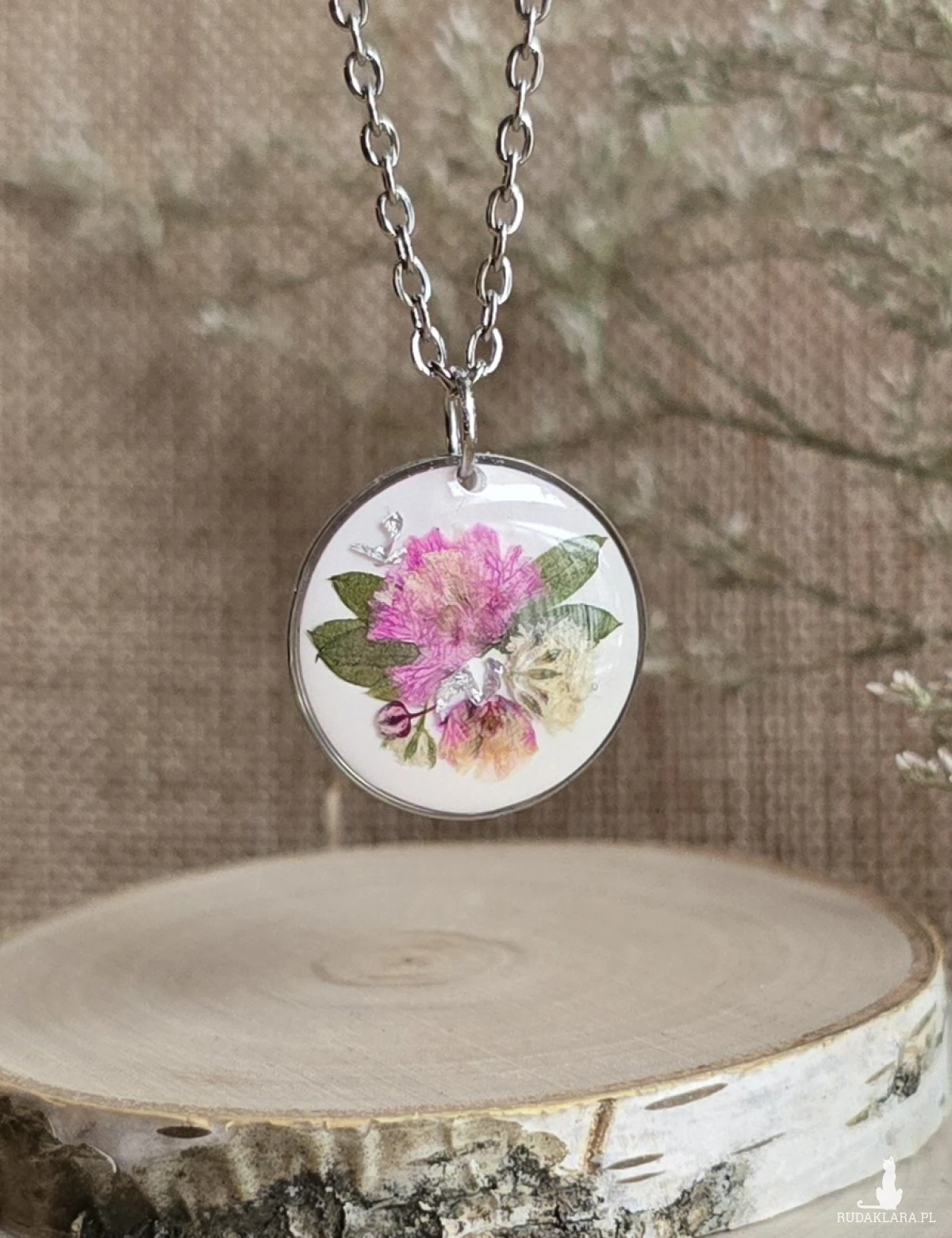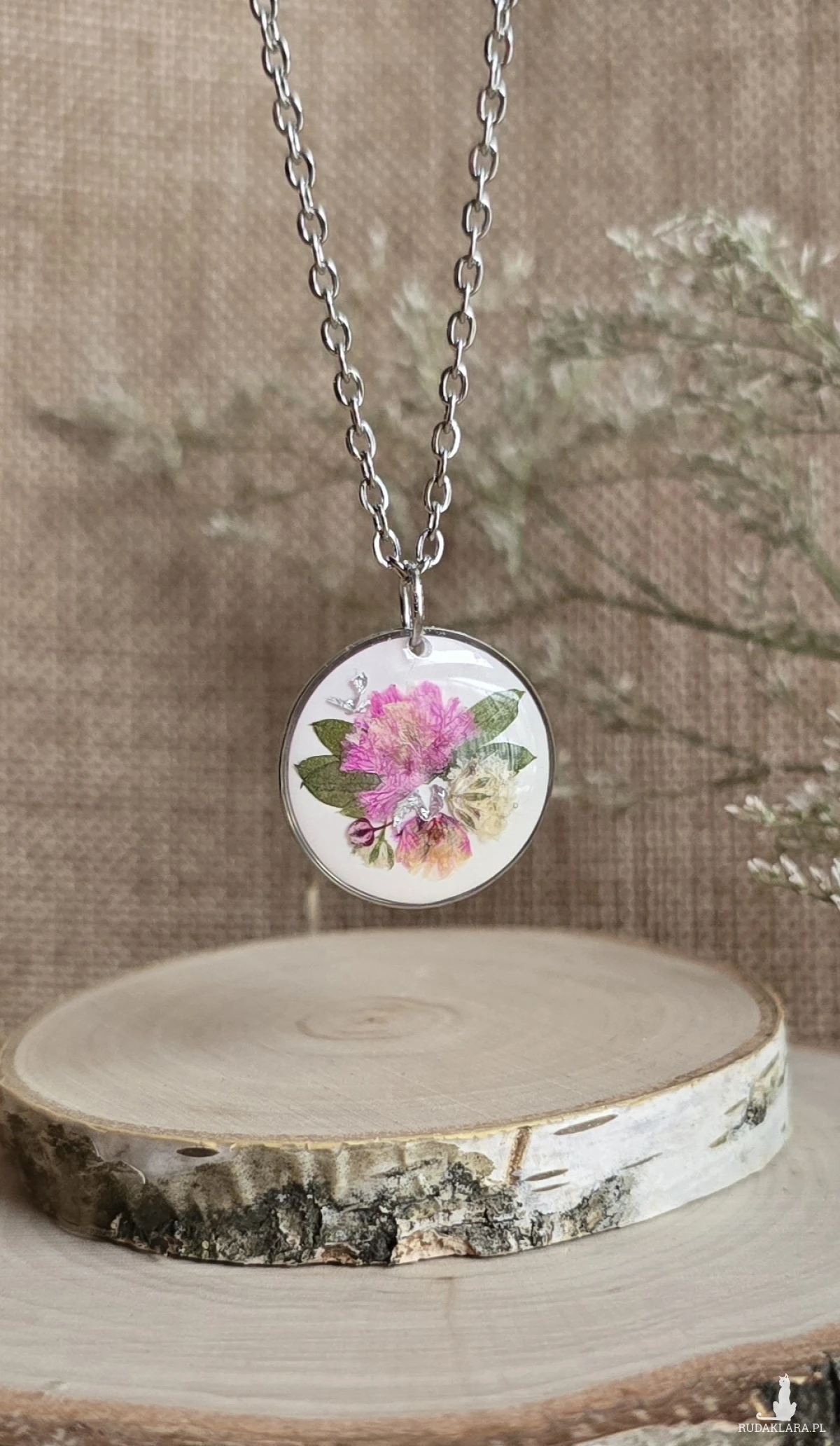 Oferuję Państwu unikalną biżuterię. Zawieszka jest wykonana z suszonych kwiatów i żywicy epoksydowej. Biżuteria jest wspaniałym i oryginalnym prezentem na lata.