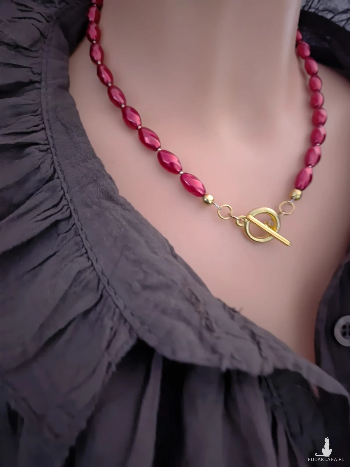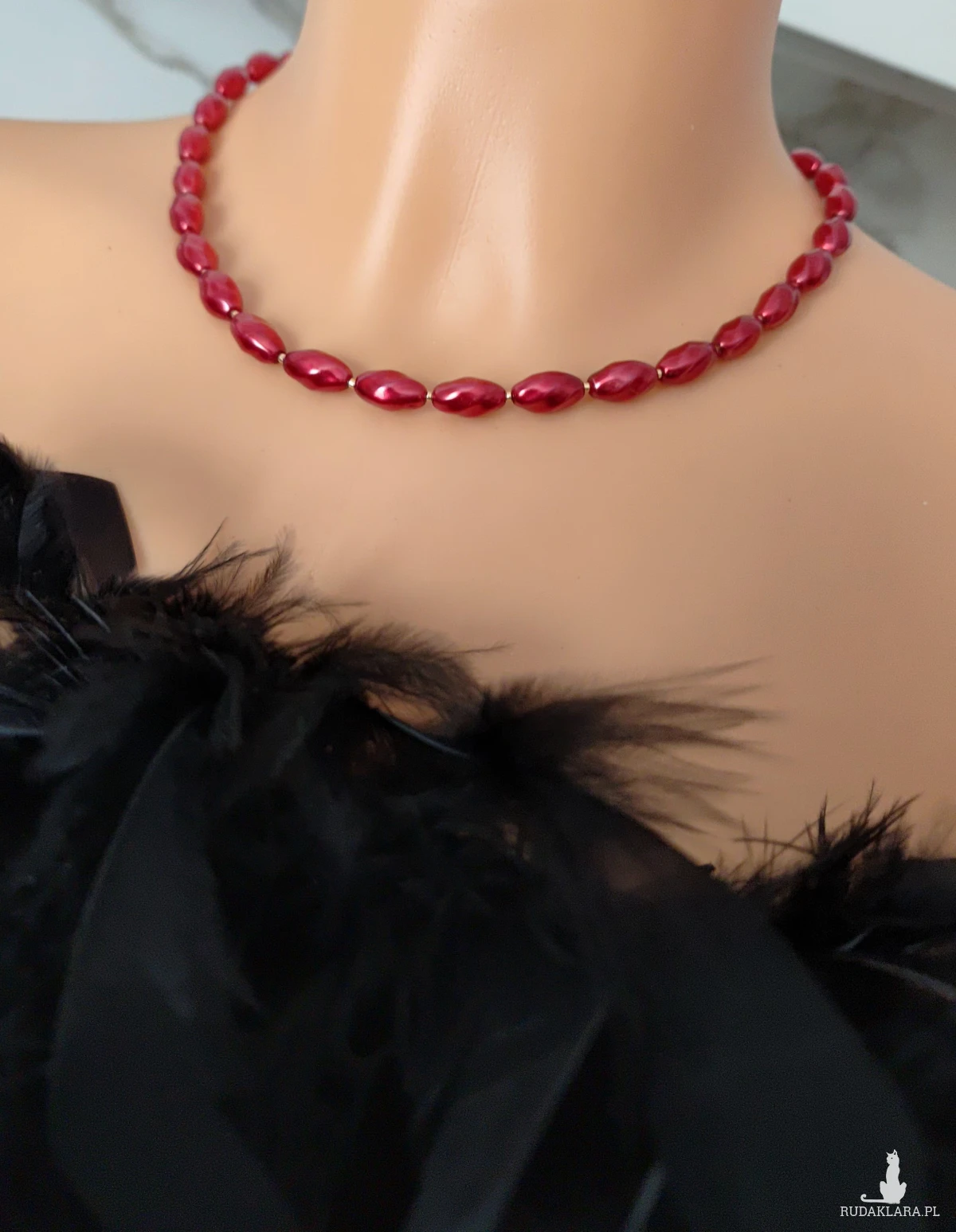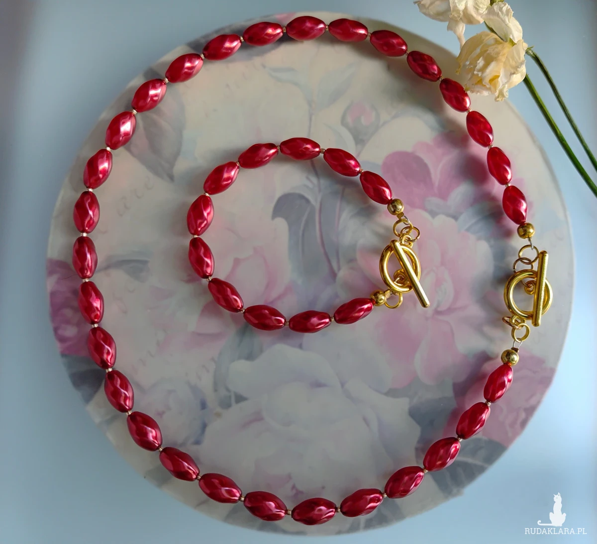 Komplet biżuterii z czerwonych pereł szklanych czeskiej firmy Jablonex. Naszyjnik 43 cm, bransoletka 18-19 cm, zapięcia metalowe typu toogle
