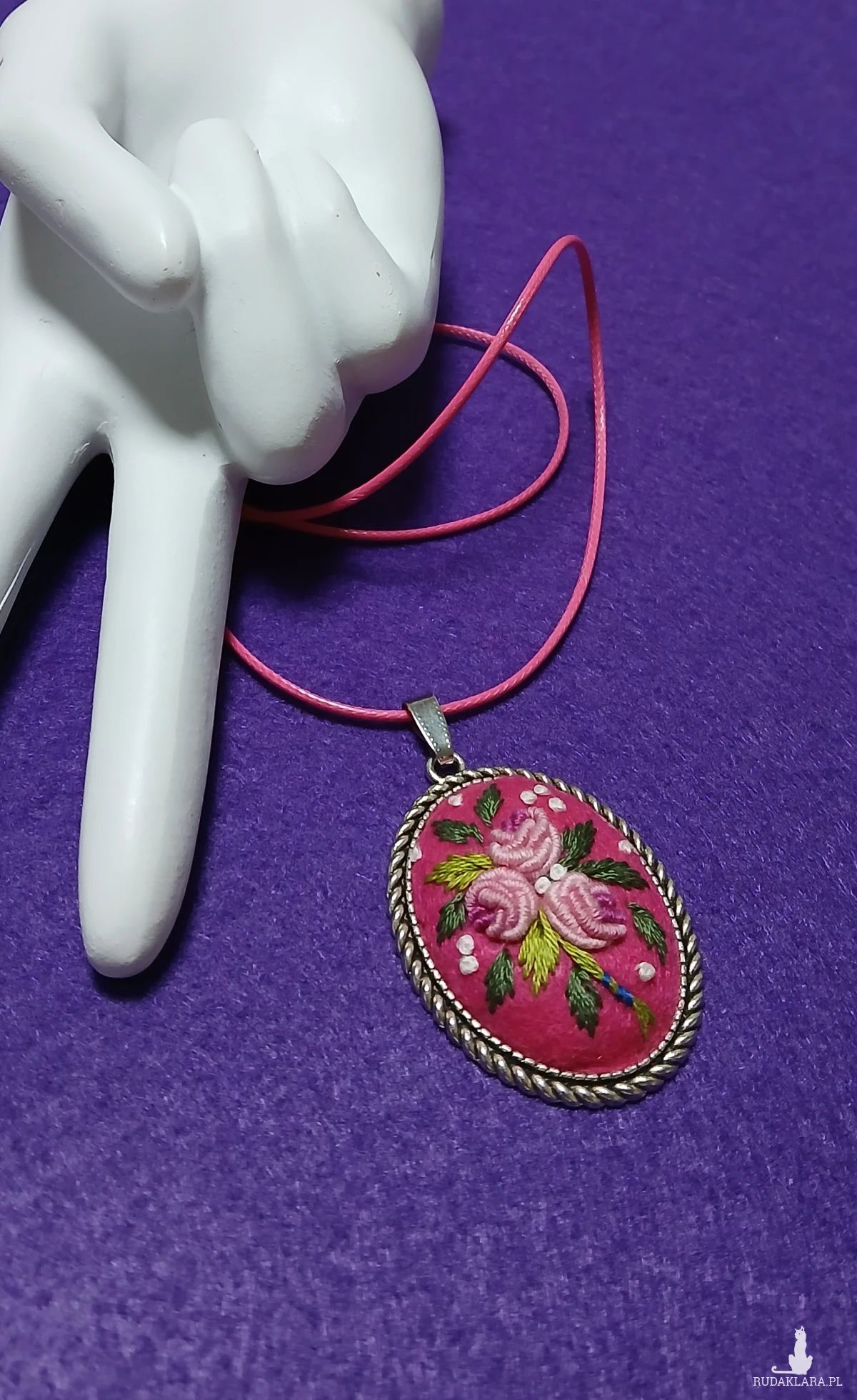 Perfekcyjnie dopracowany haft na filcu wykonałam polską bawełnianą muliną za pomocą igły. Jest on zabezpieczony impregnatem do tkanin ale po dłuższym użytkowaniu można go odświeżyć przy pomocy delikatnego mydła i letniej wody.