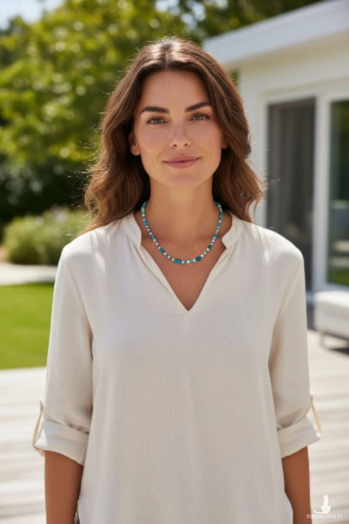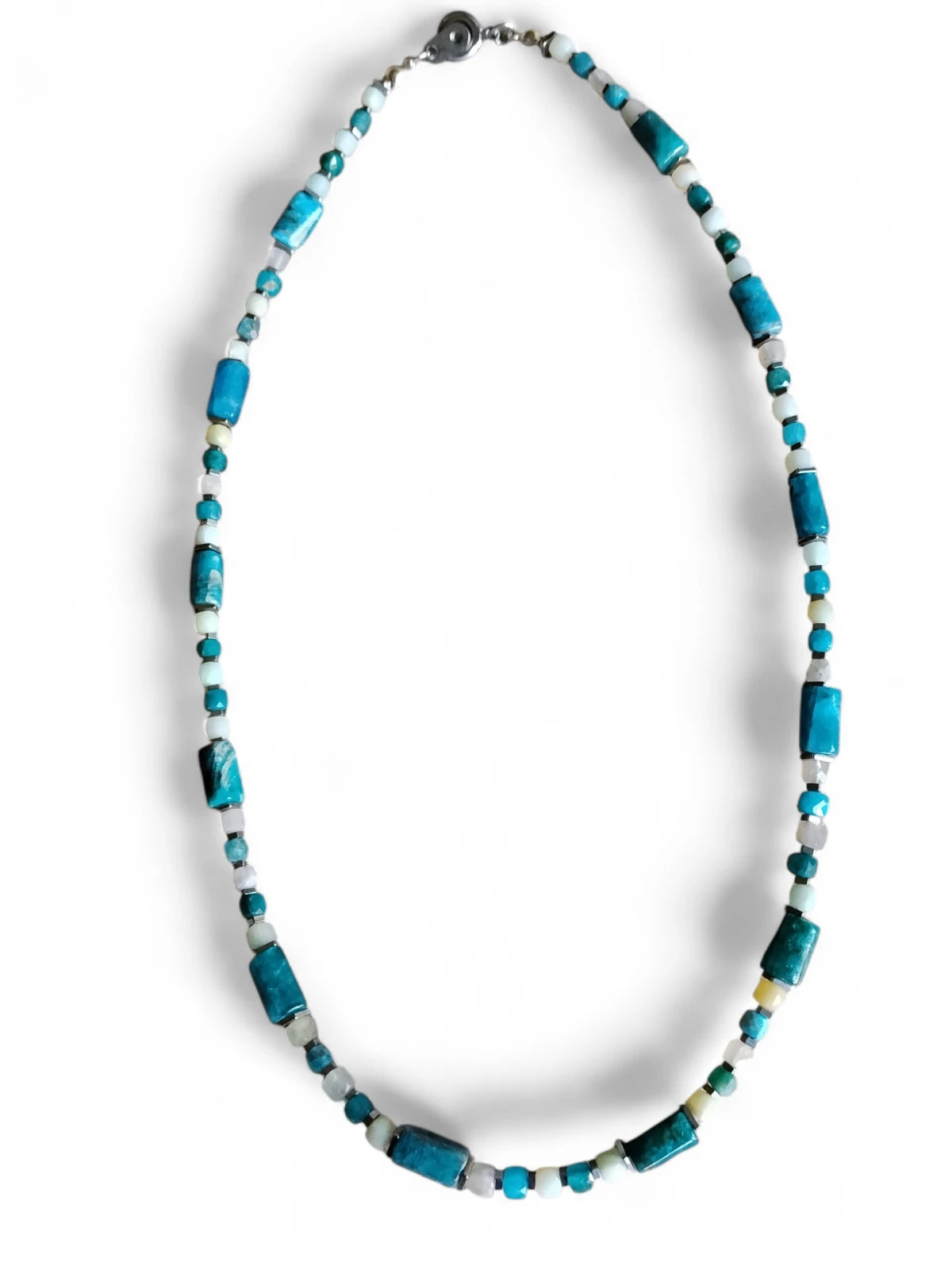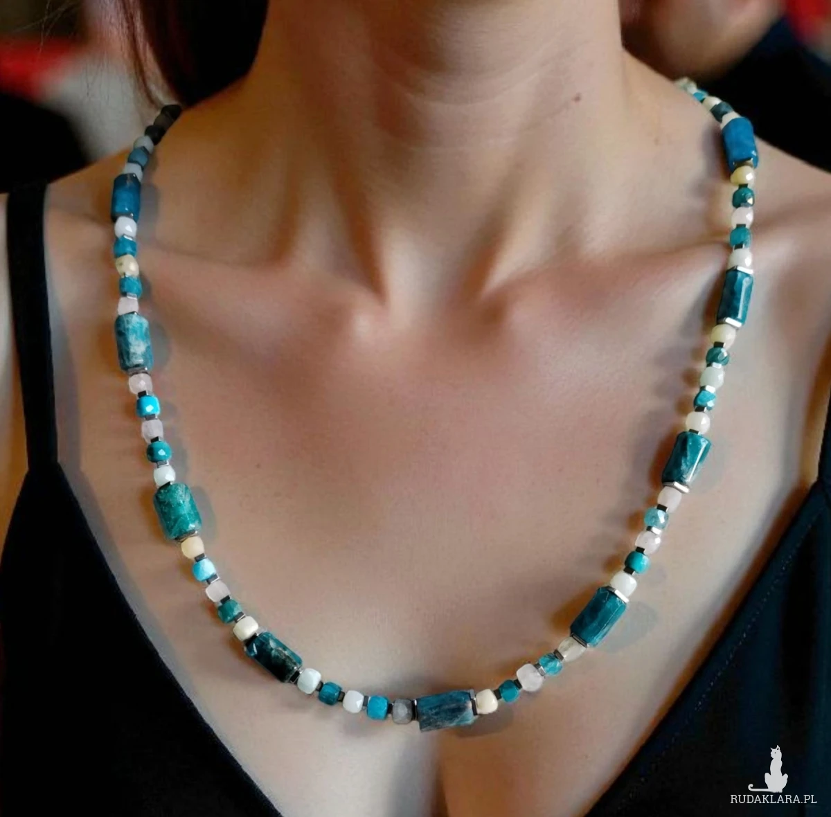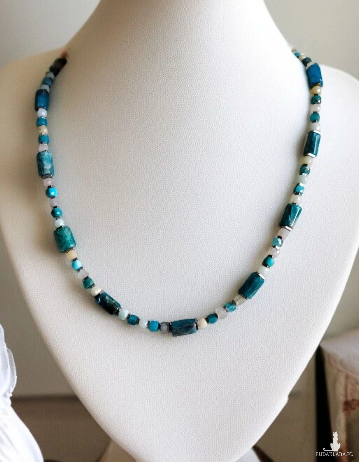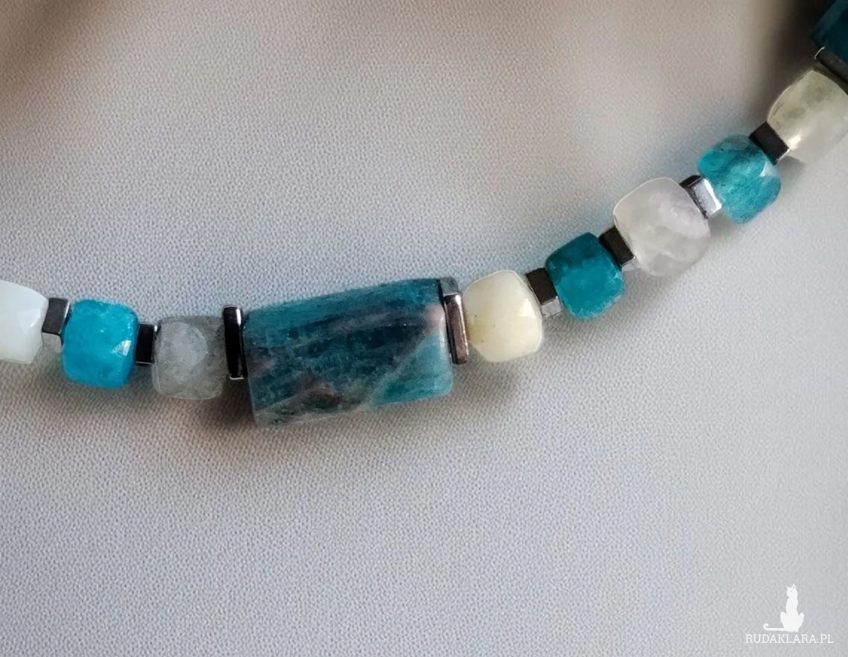 Naszyjnik wykonany z walców apatytu przekładanych 3 mm fasetowanymi kostkami apatytów i labradorytów oraz płytkami kwadratowymi hematytów w kolorze srebrnym. Wykończenie oraz wygodne zapięcie zatrzaskowe ze stali szlachetnej. Długość ok.48 cm. Ponieważ naszyjnik jest dość długi można dodatkowo ozdobić go dowolną zawieszką.
