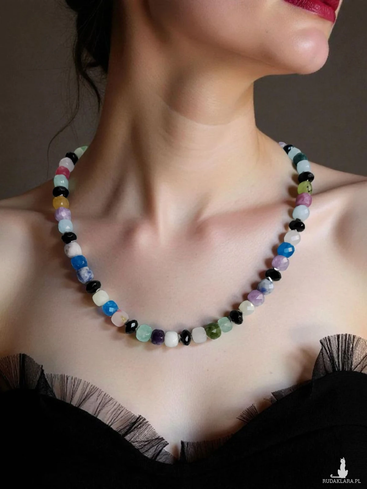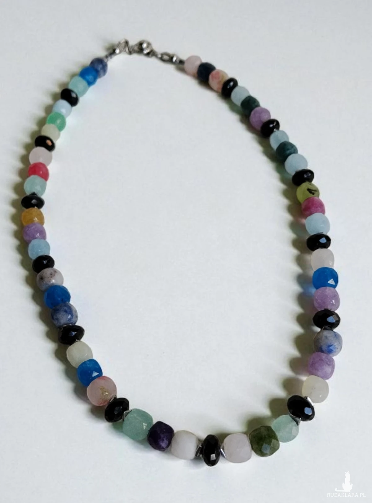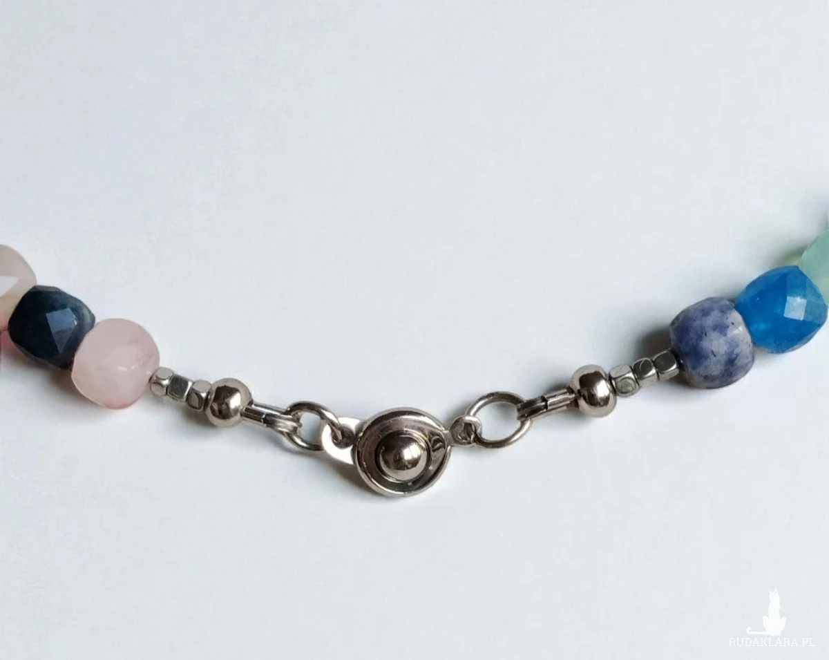 Naszyjnik wykonany z mixu fasetowanych kostek kamieni wielkości 8x8 mm przekładanych tej samej wielkości również fasetowanymi oponkami z onyksu oraz srebrzystymi hematytami. Elementy wykończenia oraz zapięcie ze stali szlachetnej. Długość 43 cm.