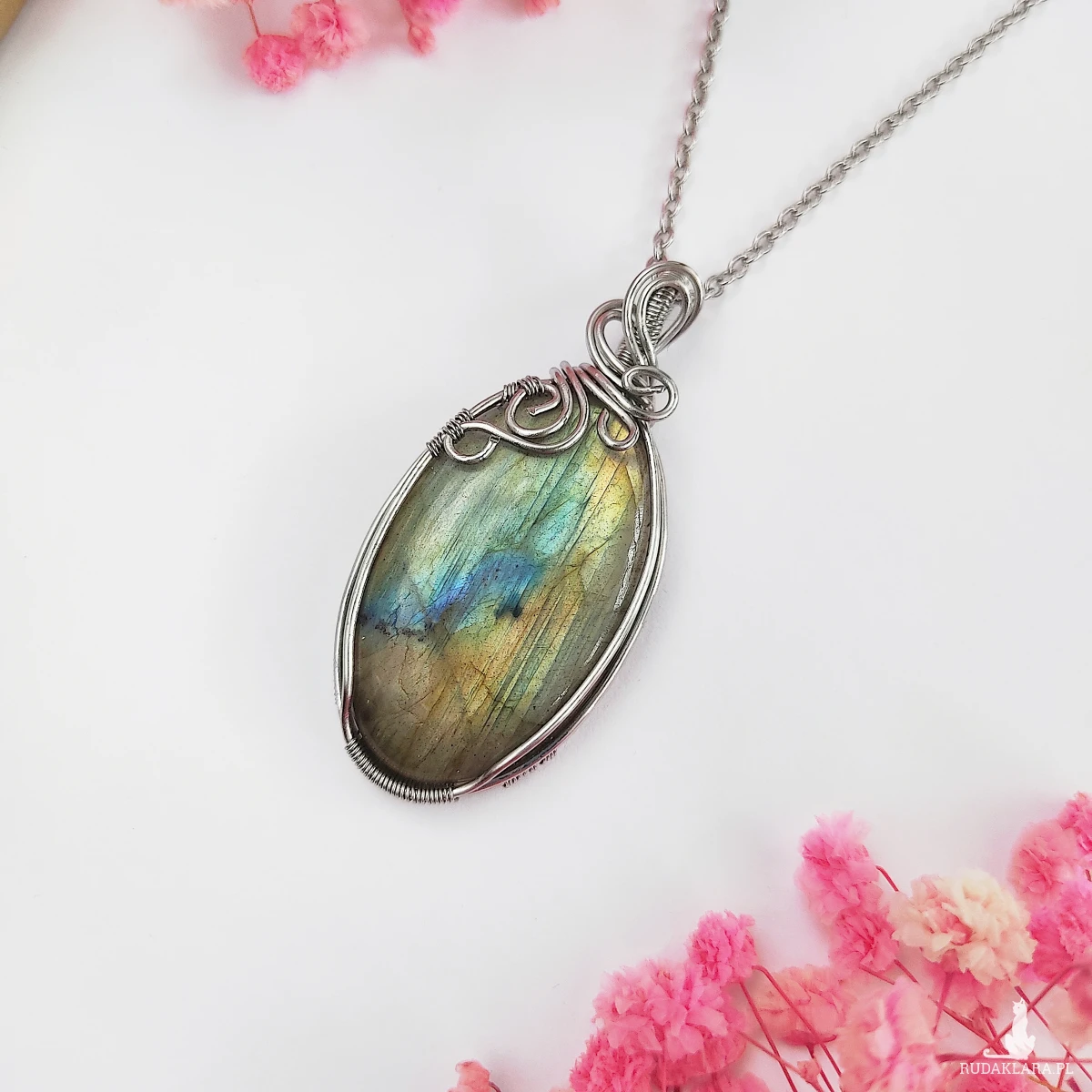 Naszyjnik Labradoryt Owal ręcznie wykonany z drutów ze stali chirurgicznej metodą wire wrapping.