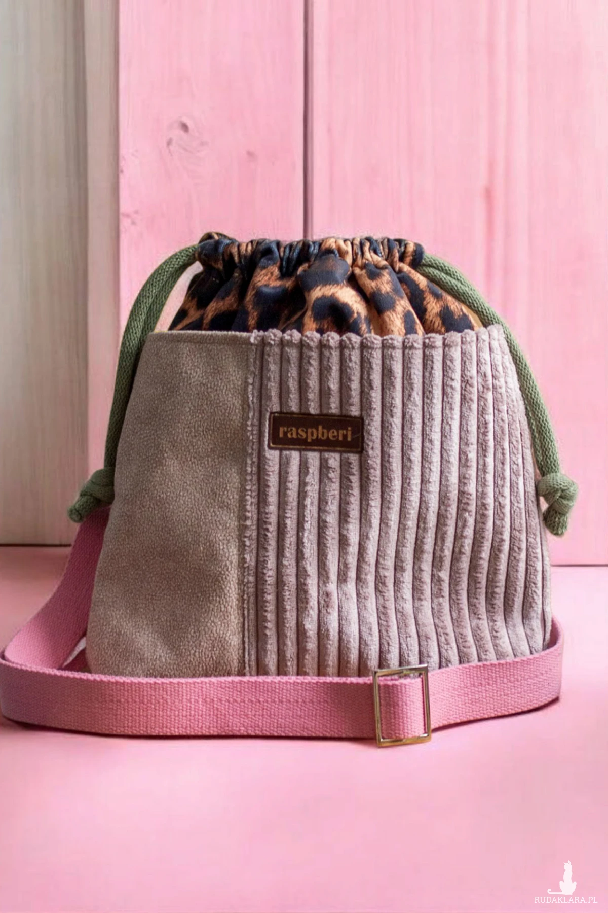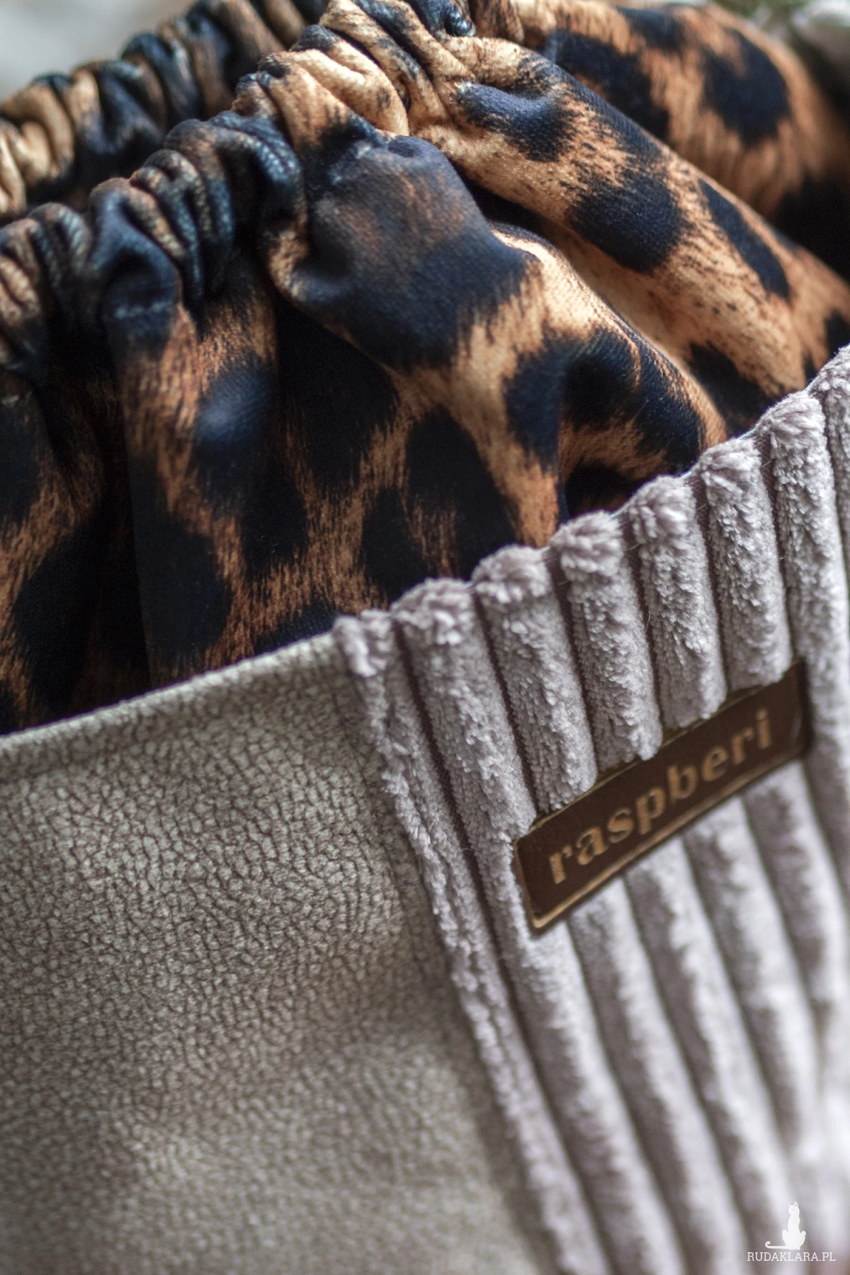 Wykonana z weluru w panterkę. Z przodu oraz z na tyle torebki kieszenie (np. na telefon czy chusteczki) z pudroworóżowego grubego sztruksu oraz beżowego weluru. W środku kieszonka zapinana na suwak.