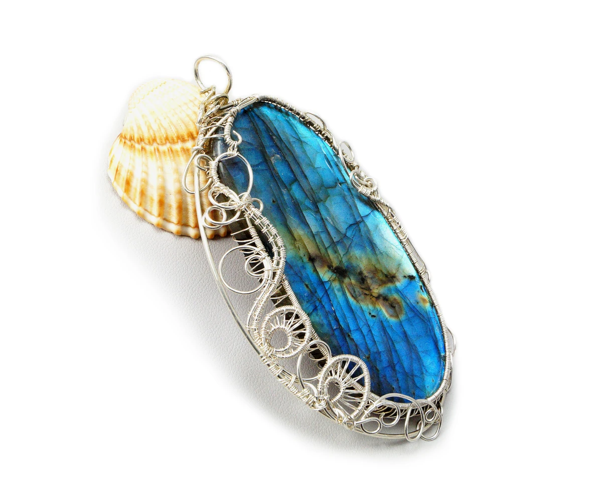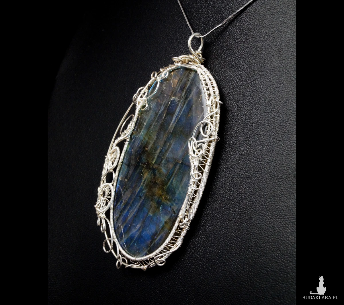 Niepowtarzalny, duży, misternie pleciony wisior z niebiesko pomarańczowym kaboszonem labradorytu. Wisior zaprojektowany i wykonany przeze mnie od podstaw bardzo pracochłonną i precyzyjną techniką wire-wrapping z najwyższej próby srebra 999 oraz z 930, 925.