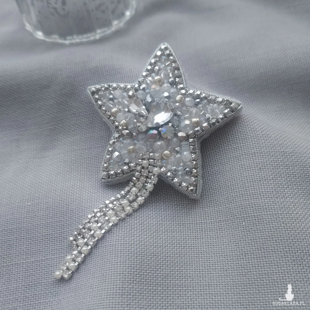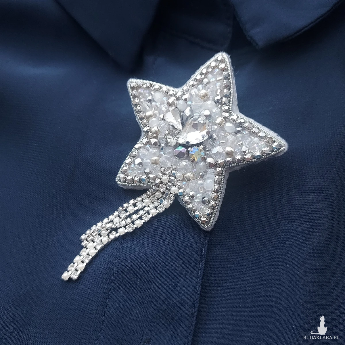 Broszka kryształkowo-srebrna gwiazda - wykonana techniką haftu koralikowego. Zdobiona taśmą cyrkoniową doda niebanalnego wyrazu i blasku zarówno codziennym, jak i eleganckim, wieczorowym kreacjom.