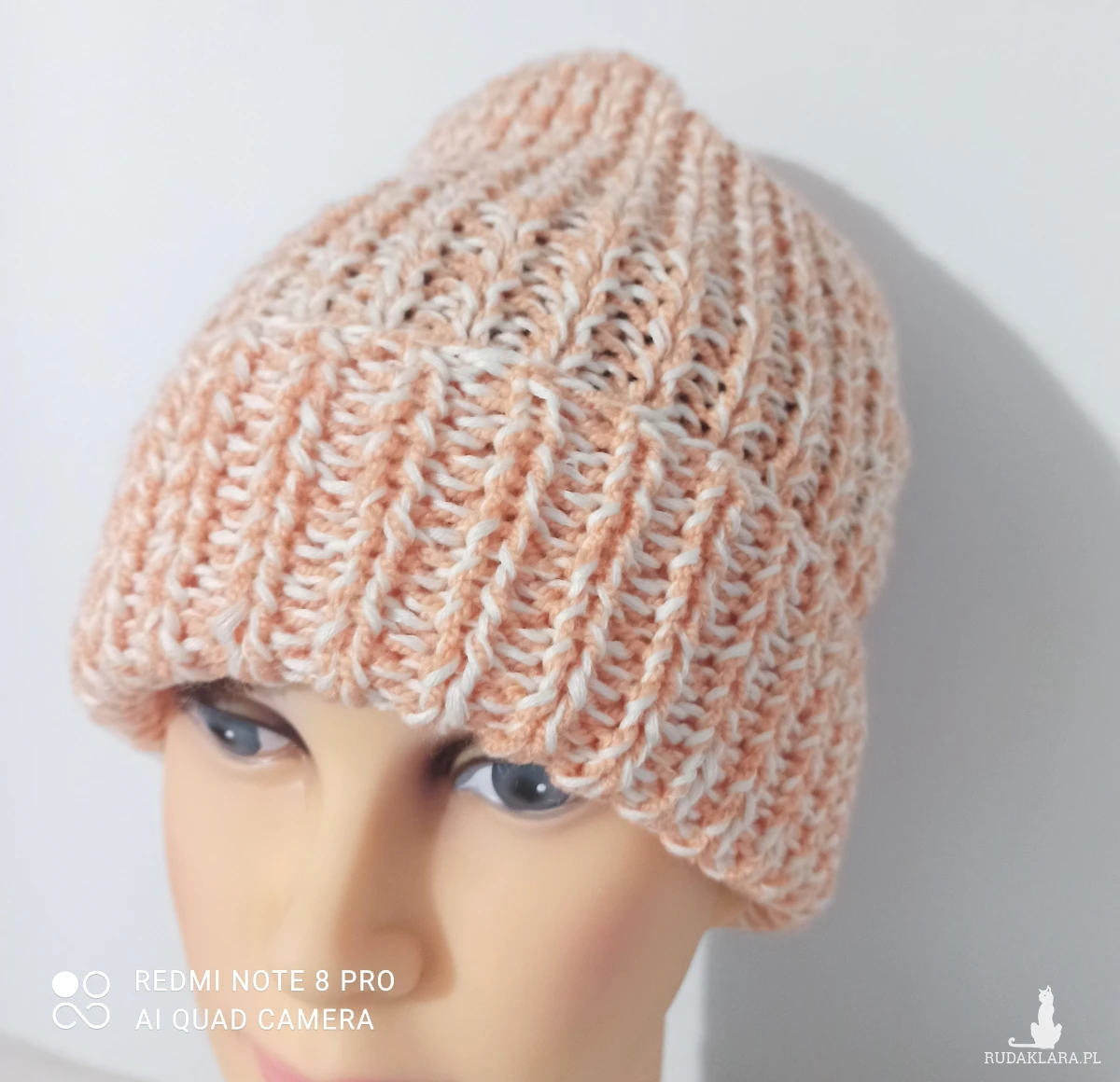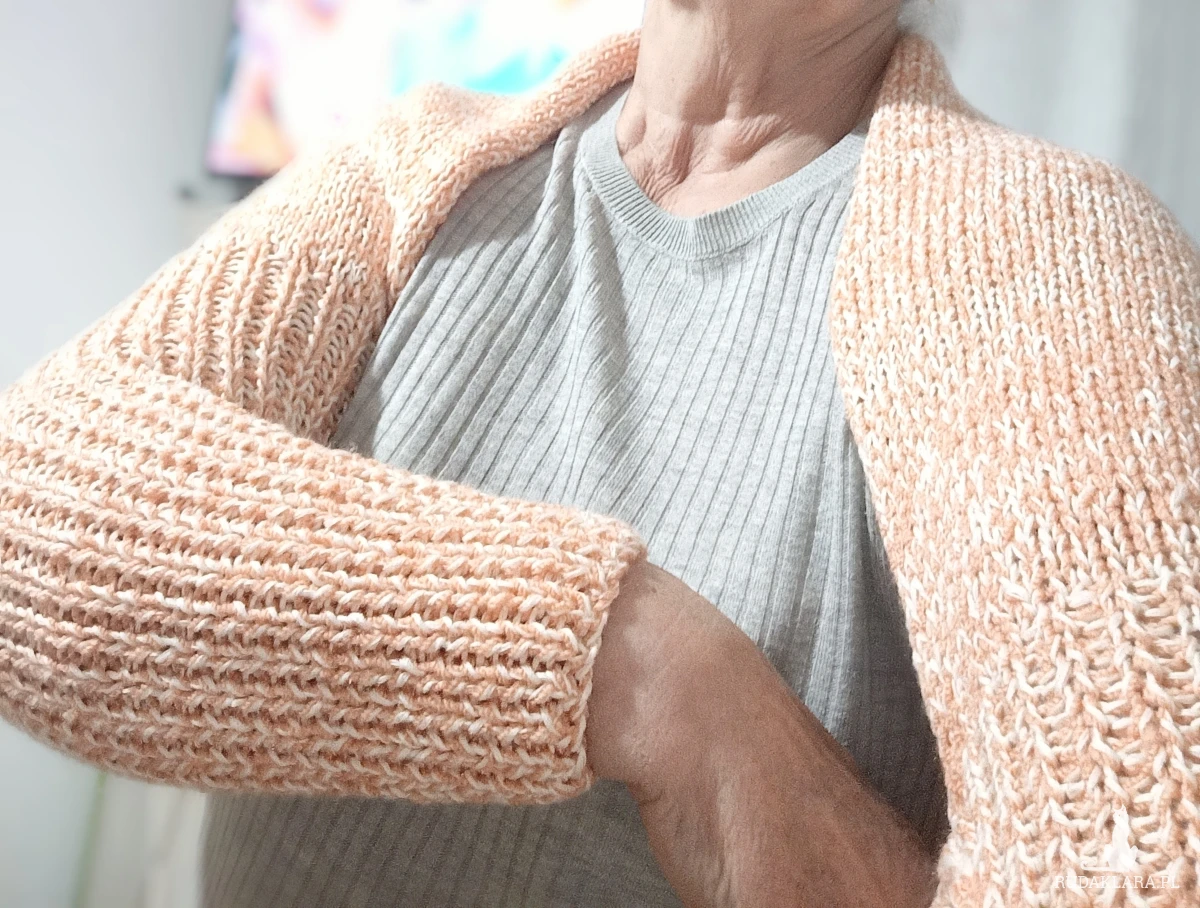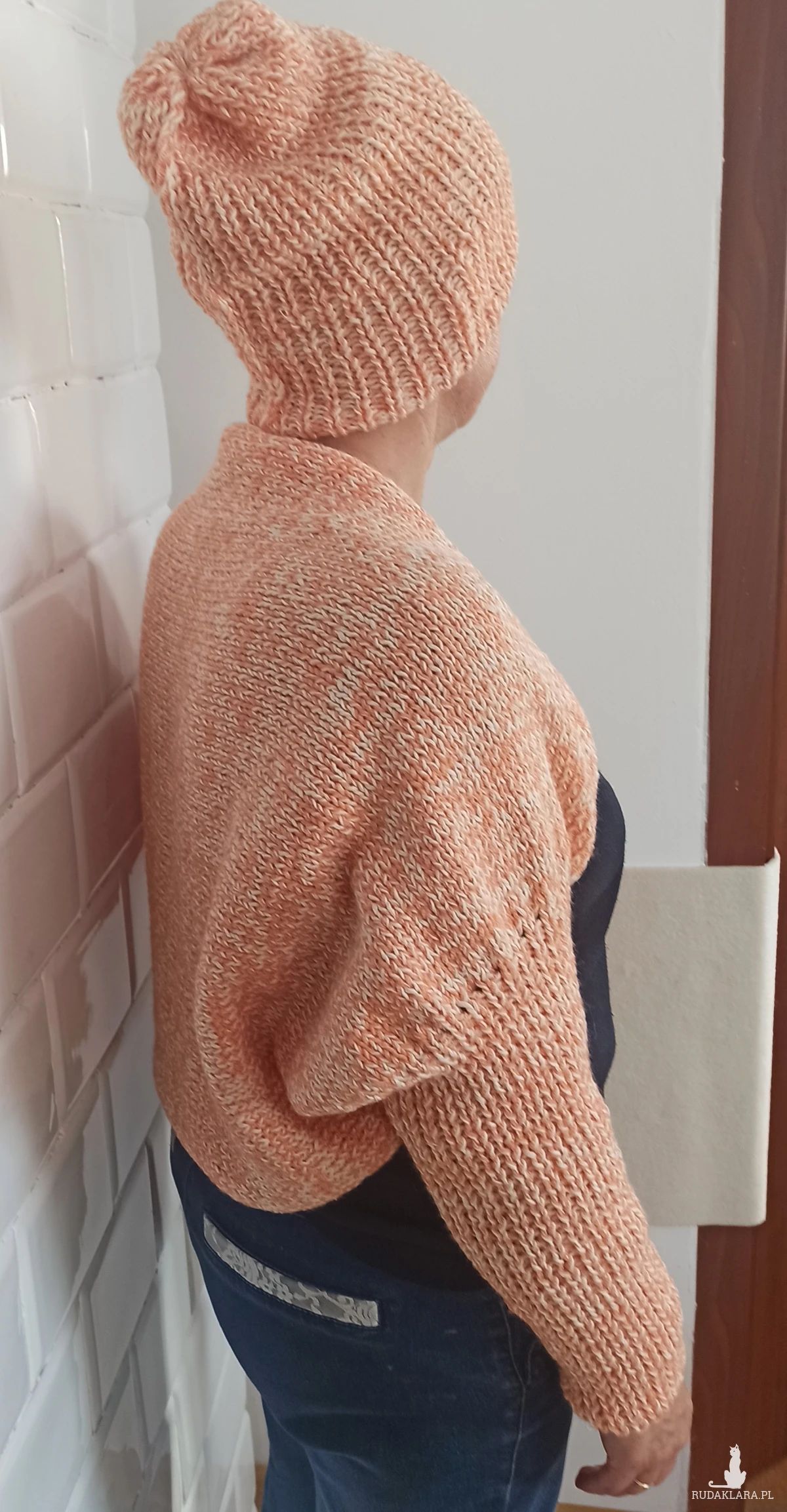 Komplet wykonany z nici bawełnianej Drops kolor ecru i drugiej akrylowej w kolorze jasnej pomarańczy. Wykonany na drutach składający się z : czapki noszonej jako wywijana lub smerfetka oraz narzutki zakładanej na ręce i plecy. Komplet średniej grubości. Mięciutki w dotyku. Skutecznie chroni przed zimnem. Wymiary czapki: długość bez wywijania 33 cm, obwód bez rozciągania 38 cm , max 61cm. Narzutka wysokość narzutki na całej długości pleców 68 cm, długość z rękawami 154 cm. Czapka wykonana ściegiem ściągaczowym1 oczko prawe, jedno lewe podobnie rękawy. Część zakrywająca plecy prawymi oczkami.