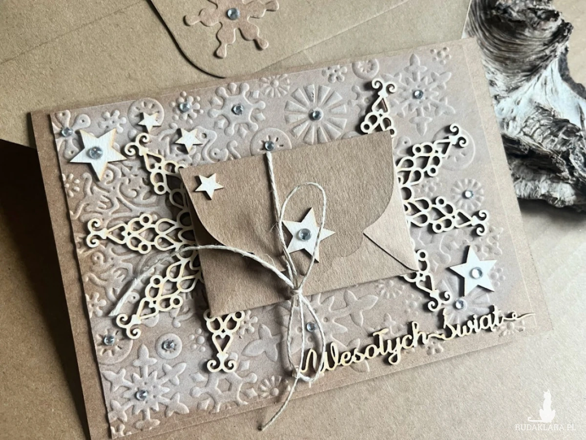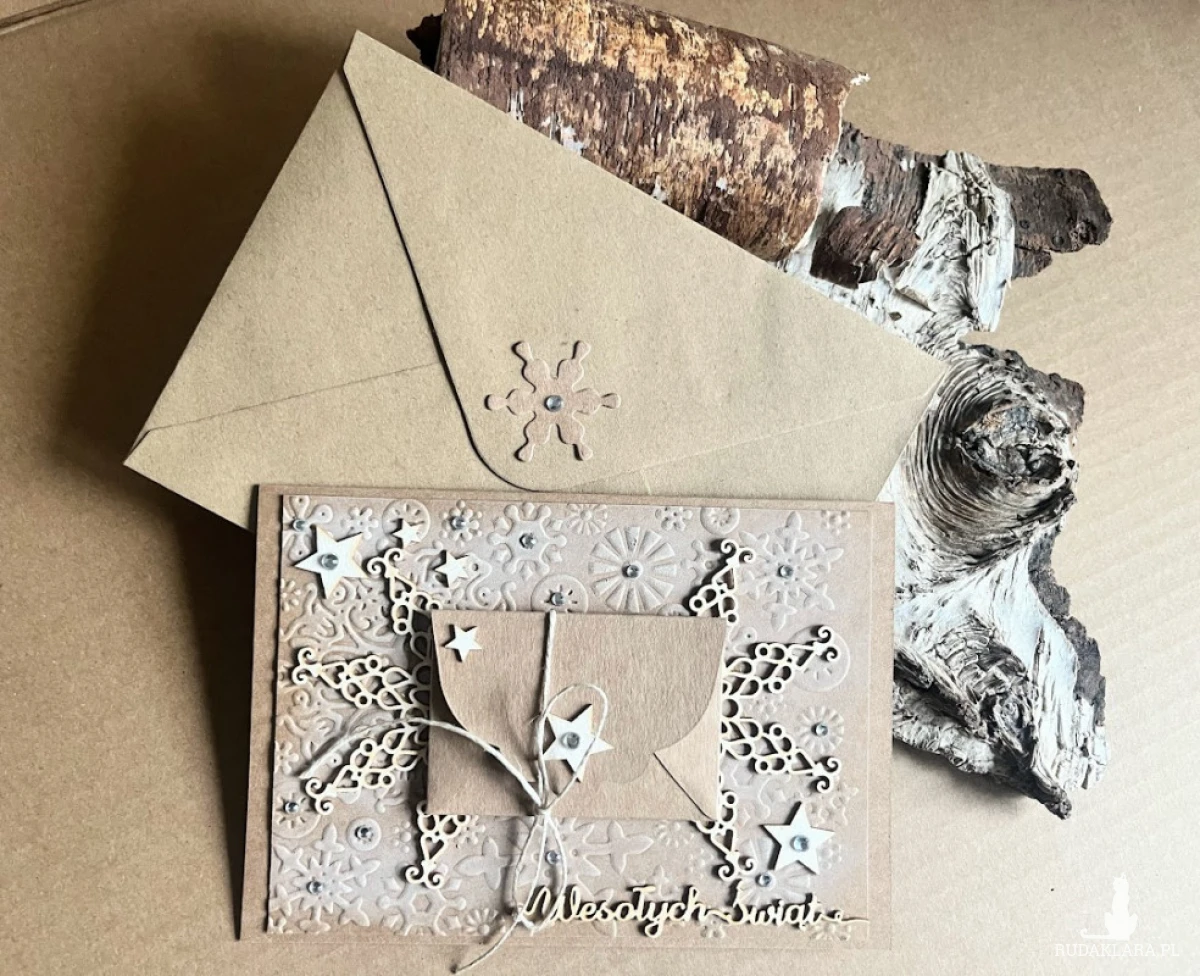 RĘCZNIE WYKONANA KARTKA TECHNIKĄ SCRAPBOOKINGU w klimacie Świąt Bożego Narodzenia z napisem - Wesołych Świąt w klimacie eco.