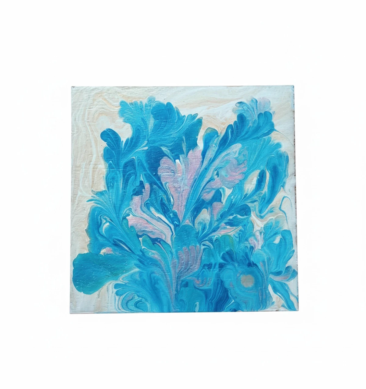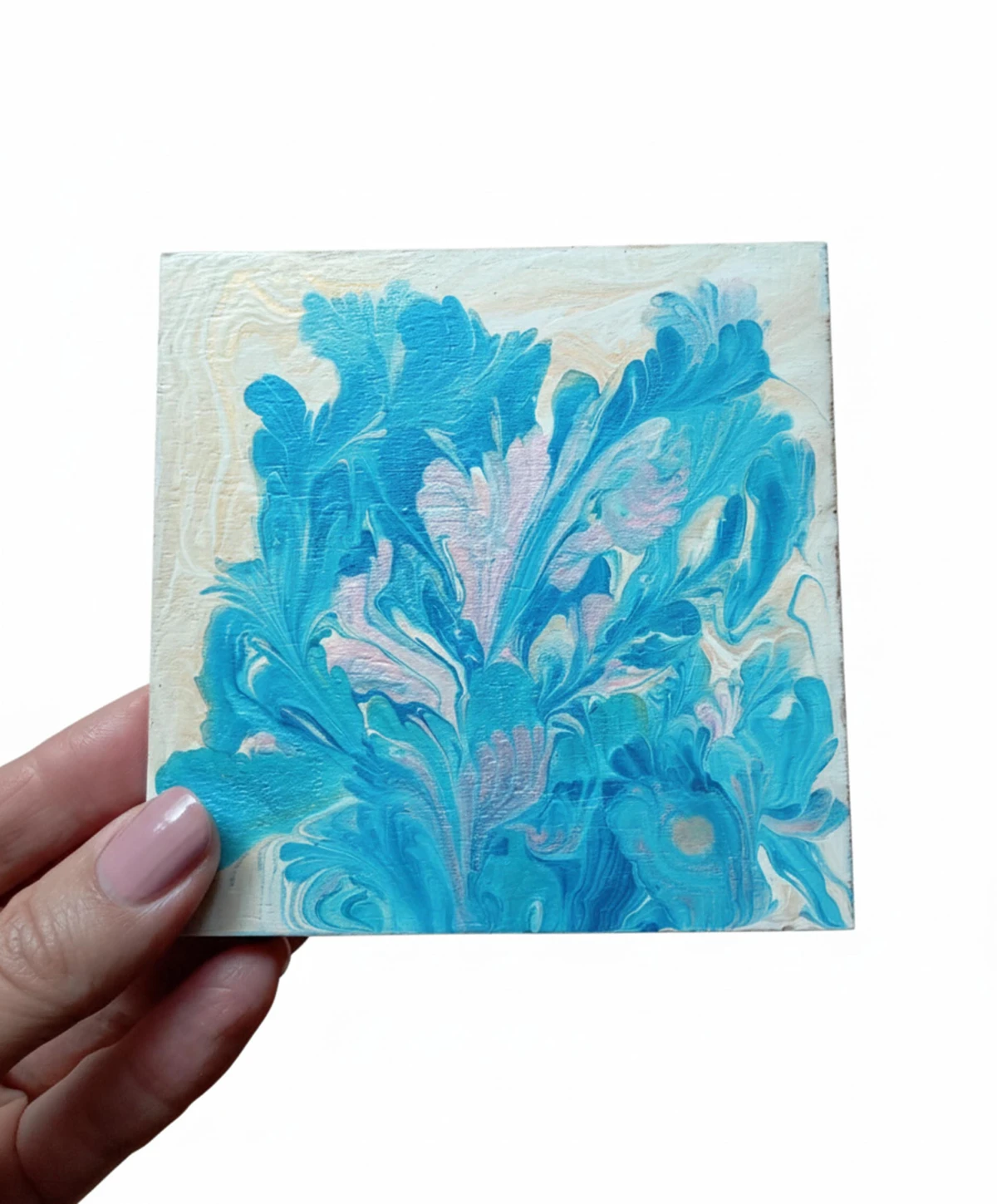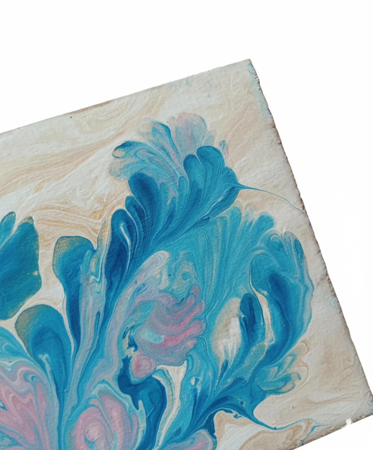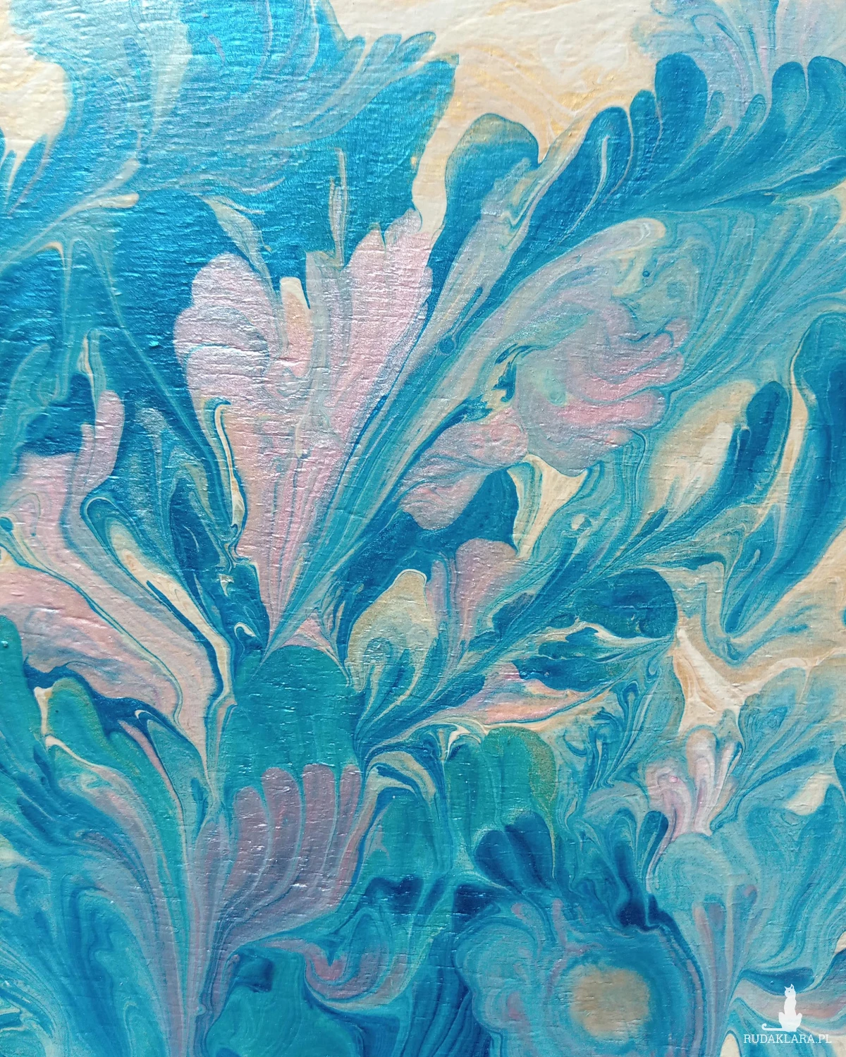 Stworzony techniką acrylic pouring, jest absolutnie wyjątkowy - każdy egzemplarz to niepowtarzalna kompozycja barw i wzorów.